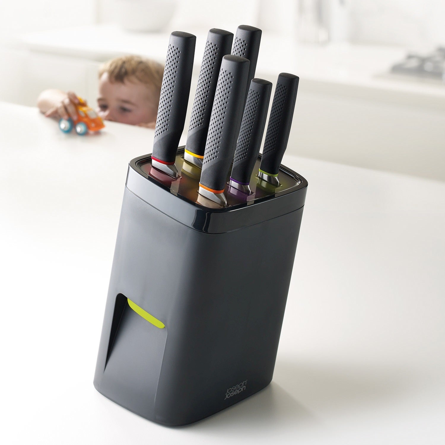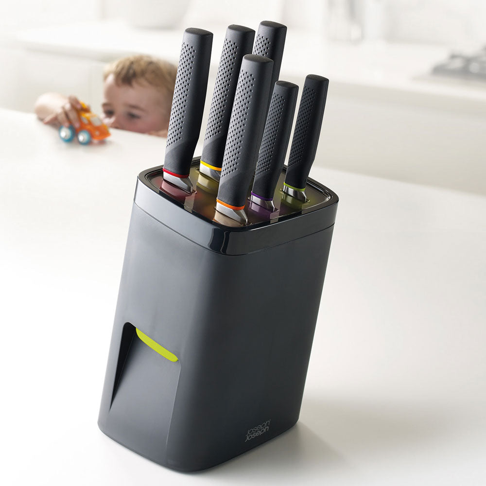 Veiligheid in de keuken Vooral in gezinnen met kleine kinderen is veiligheid ontzettend belangrijk. Ook veiligheid in de keuken is vaak topprioriteit. Veel ouders bergen scherpe messen graag het liefst op in de keukenlade om zo snijwonden bij zichzelf of bij hun kinderen te voorkomen. Maar dit is niet het beste voor je messen. Door het regelmatig openen en sluiten van de keukenlades botsen messen tegen elkaar en tegen het overige keukengerei aan waardoor ze beschadigen en snel slijten. Zonde van je dure messen! Joseph Joseph heeft nu de uitkomst voor jou.