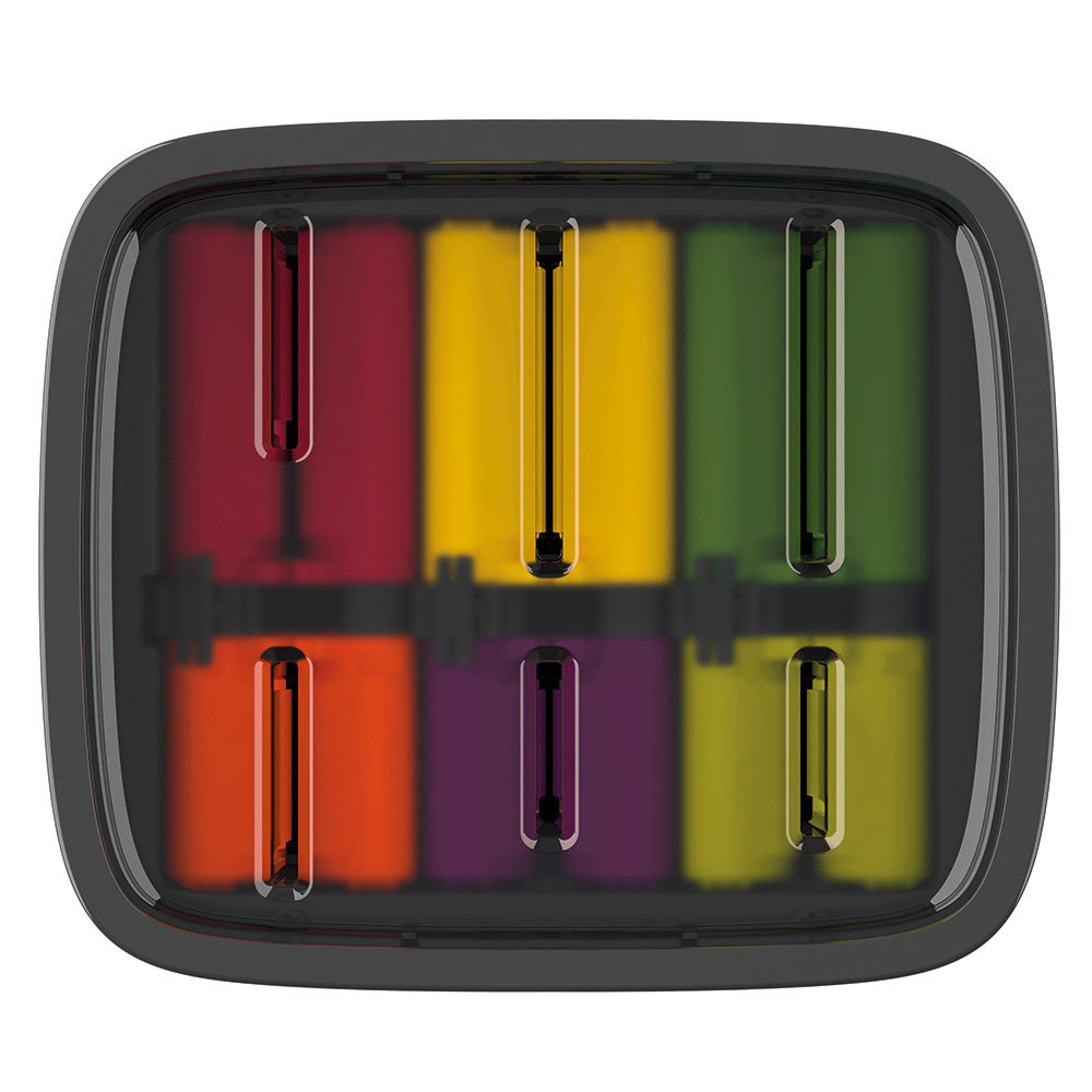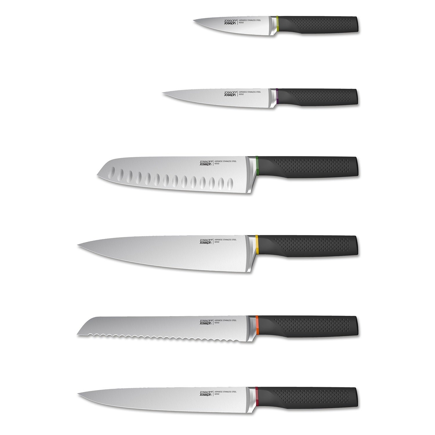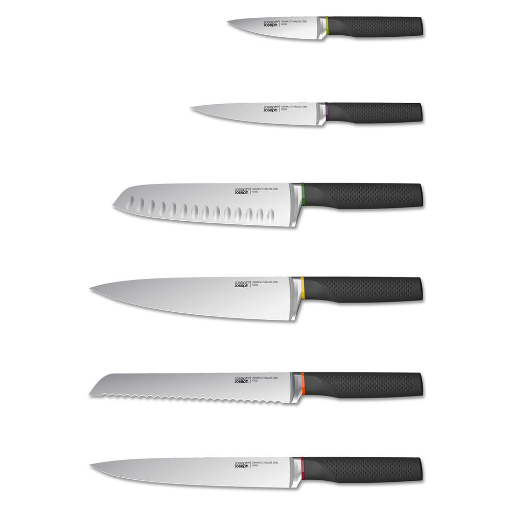 - Inclusief zes vlijmscherpe, kleurgecodeerde messen