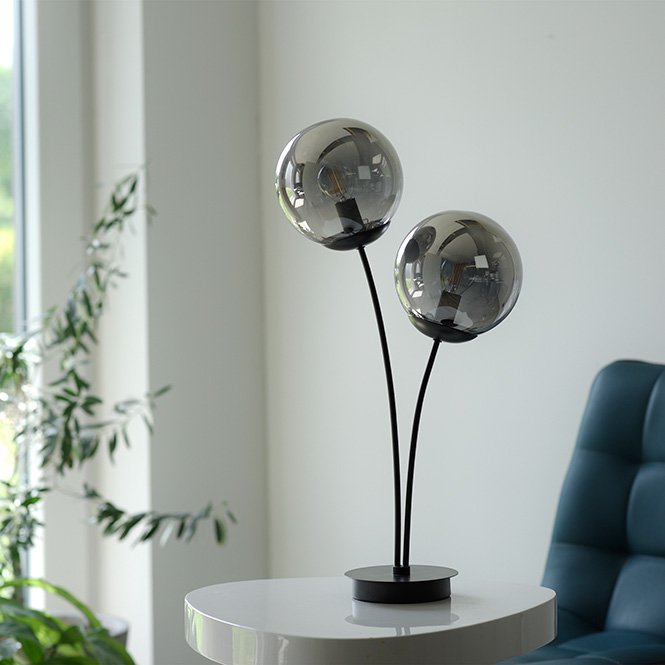De twee smoke glazen van de Big Widow schemerlamp worden op hun plaats gehouden door gebogen metalen staven van verschillende lengtes. De zwarte look in combinatie met het getinte smoke glas zorgen voor een moderne maar gezellige eyecatcher in je woonruimte.