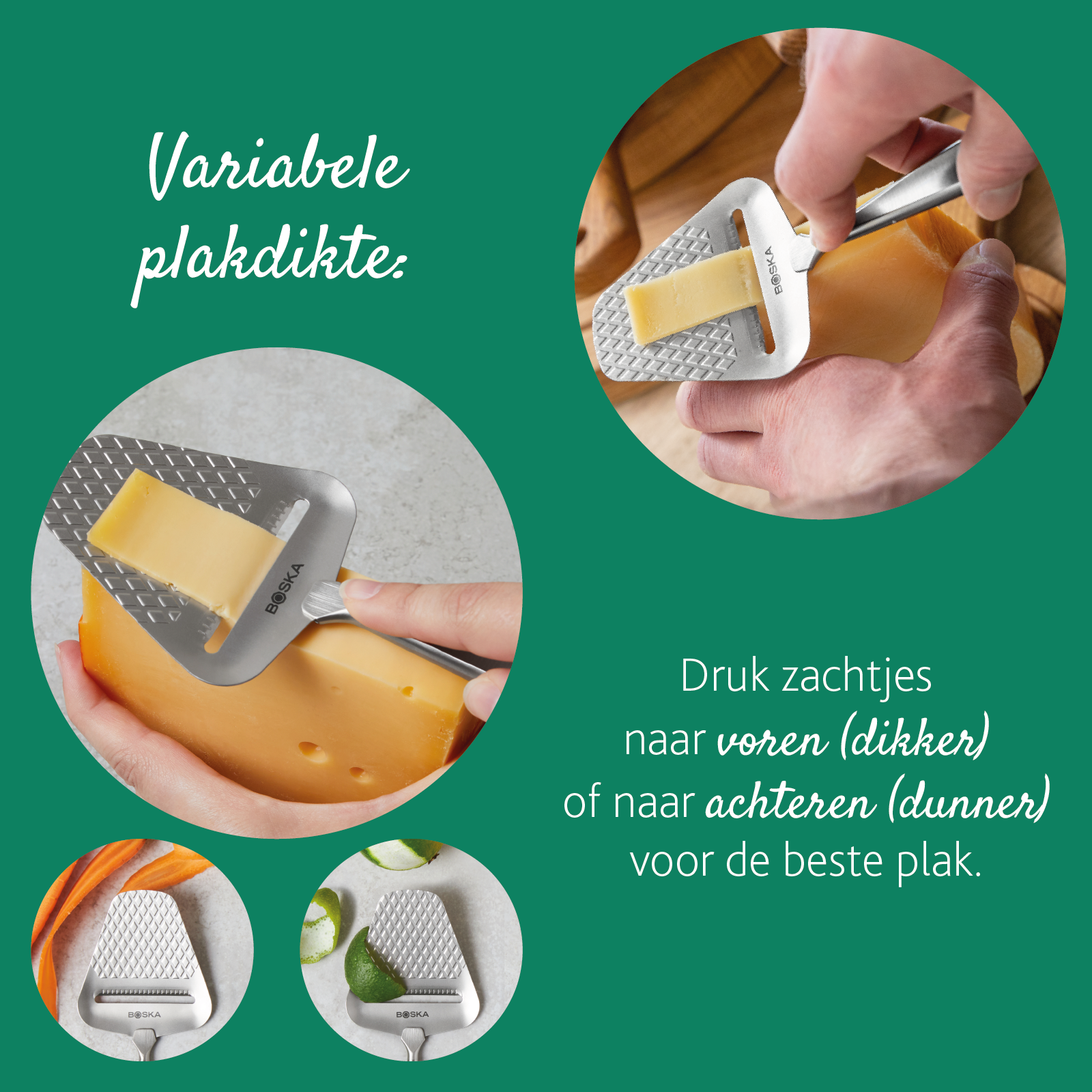 Altijd al moeite gehad met het zoeken naar een goede kaasschaaf? Kijk niet verder en beloon jezelf met de beste kaasschaaf ter wereld: De Monaco+ van Boska. Met meer dan 120 jaar ervaring verwerkt bevat de schaaf alle nodige ontwikkelingen om een perfecte plak kaas op uw bord te krijgen.