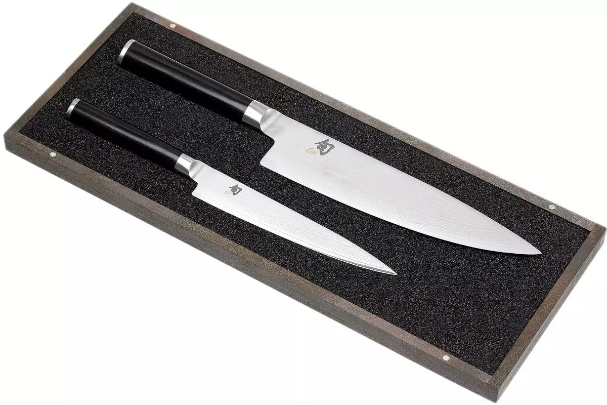 De Kai Messenset Shun Classic 2-delig - DMS-220 bevat twee hoogwaardige messen die essentieel zijn voor diverse snijtaken in de keuken: een universeel mes en een koksmes. Beide messen zijn vervaardigd uit VG-MAX roestvrij staal, omringd door 32 lagen Damaststaal, wat zorgt voor een uitzonderlijke scherpte, slijtvastheid en het iconische Damastpatroon dat de Shun Classic-serie kenmerkt.