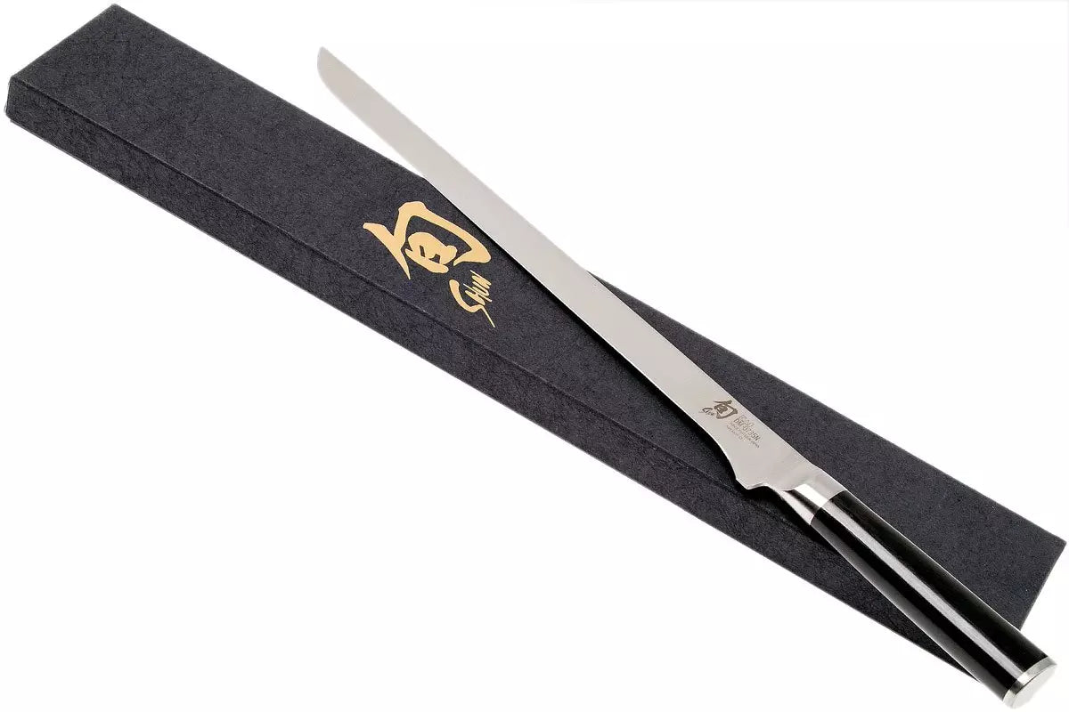 Dankzij het lange, slanke lemmet glijdt het mes soepel door vlees zonder het te scheuren, wat resulteert in dunne, gelijkmatige plakken – perfect voor professionele presentatie. Het handvat, gemaakt van duurzaam Pakkahout in een ergonomische D-vorm, biedt een comfortabele en stabiele grip, zelfs bij langdurig gebruik. Dit vleesmes is ideaal voor chefs en thuiskoks die op zoek zijn naar Japans vakmanschap en precisie in hun keukengerei.