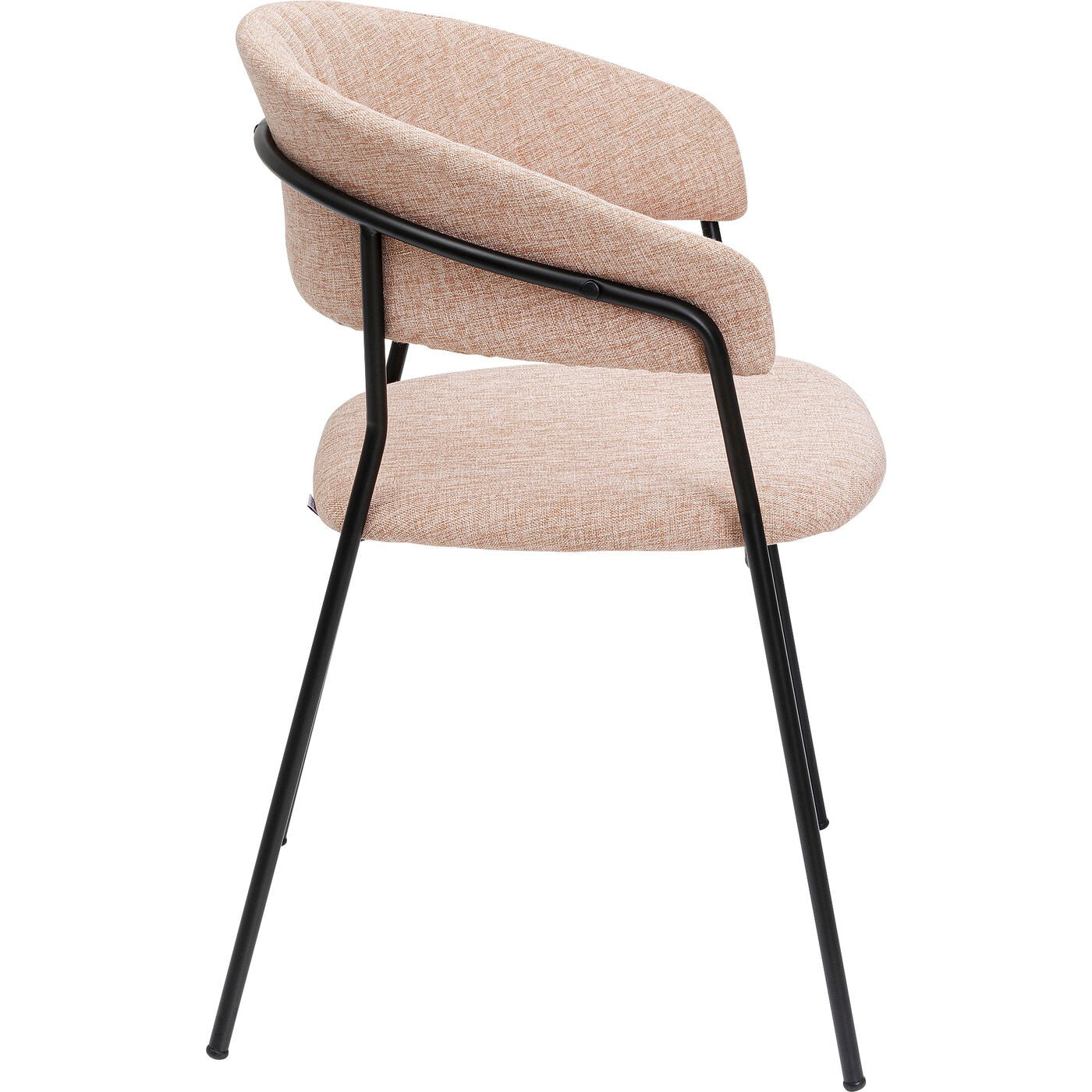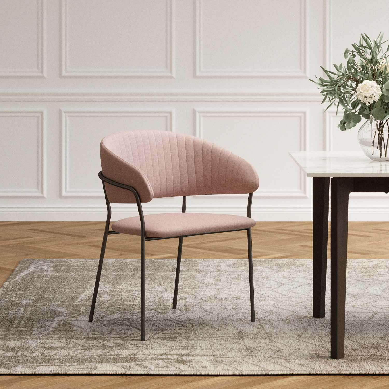 - Roze zitting en rugleuning met zwarte stalen poten, boho-stijl met armleuningen.