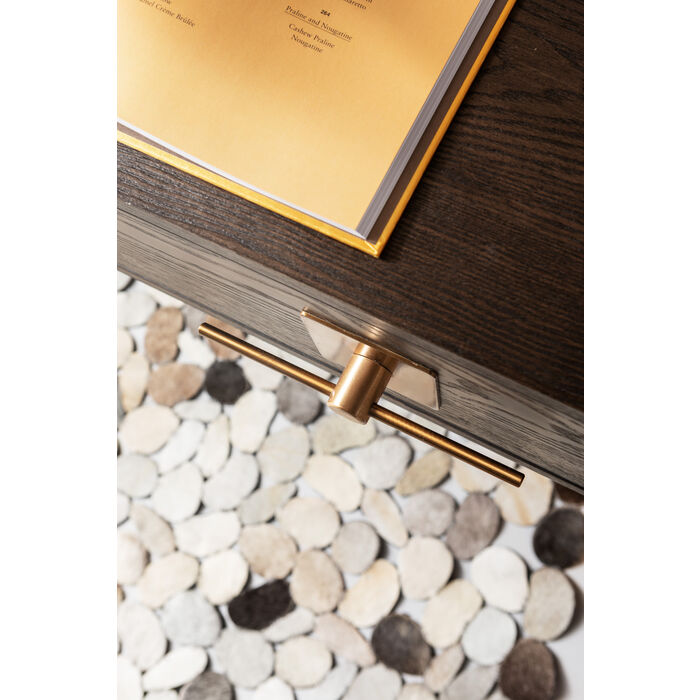 Het donkere essenhout creëert een uiterst stijlvolle look in combinatie met het glanzende messingkleurige onderstel Aan de voorzijde is het bureau voorzien van twee handige opberglades Ook de handvaten van de lades zijn gemaakt van glanzend RVS Het messingkleurige onderstel voegt een vleugje Japanse esthetiek toe en creëert een moderne Aziatische stijl in huis Combineer het Osaka bureau met andere meubelen uit deze stijlvolle meubelserie en met luxe gouden of marmeren accessoires
