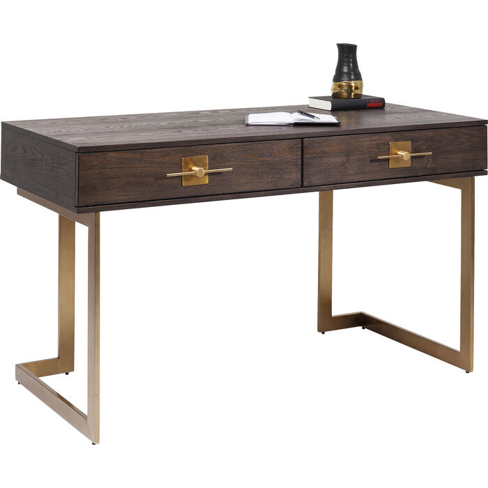 Donker houten bureau met messingkleurig onderstel