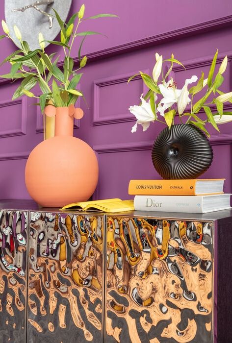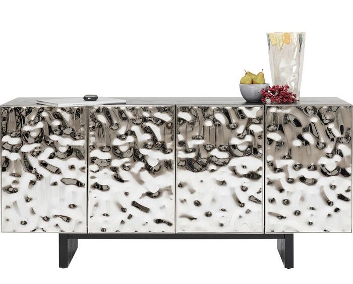 Een modern dressoir voor de woonkamer met exclusief frontdesign van gelakt RVS.