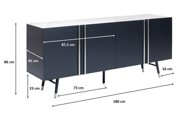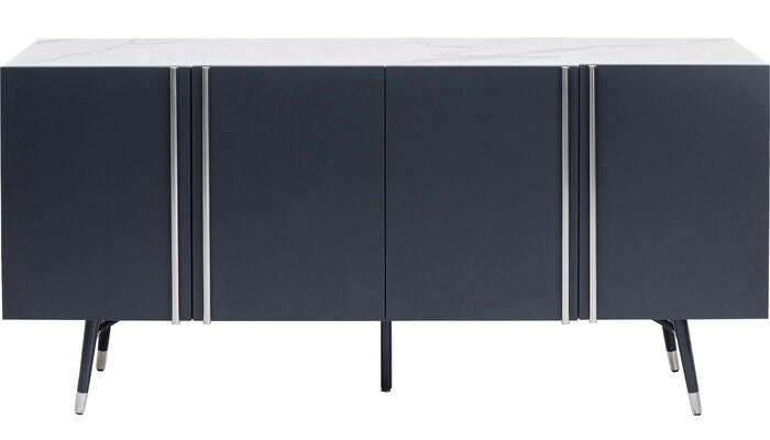 - Een modern dressoir in donkergrijs met zilverkleurige accenten en marmer look