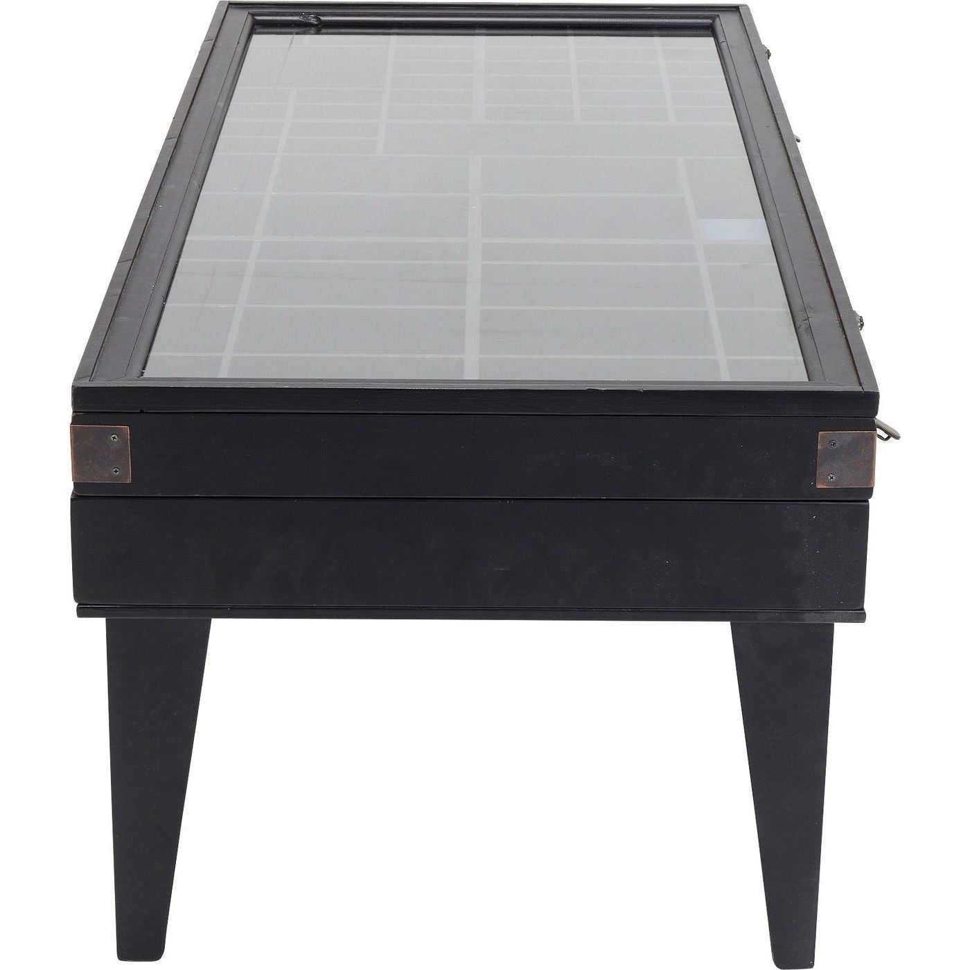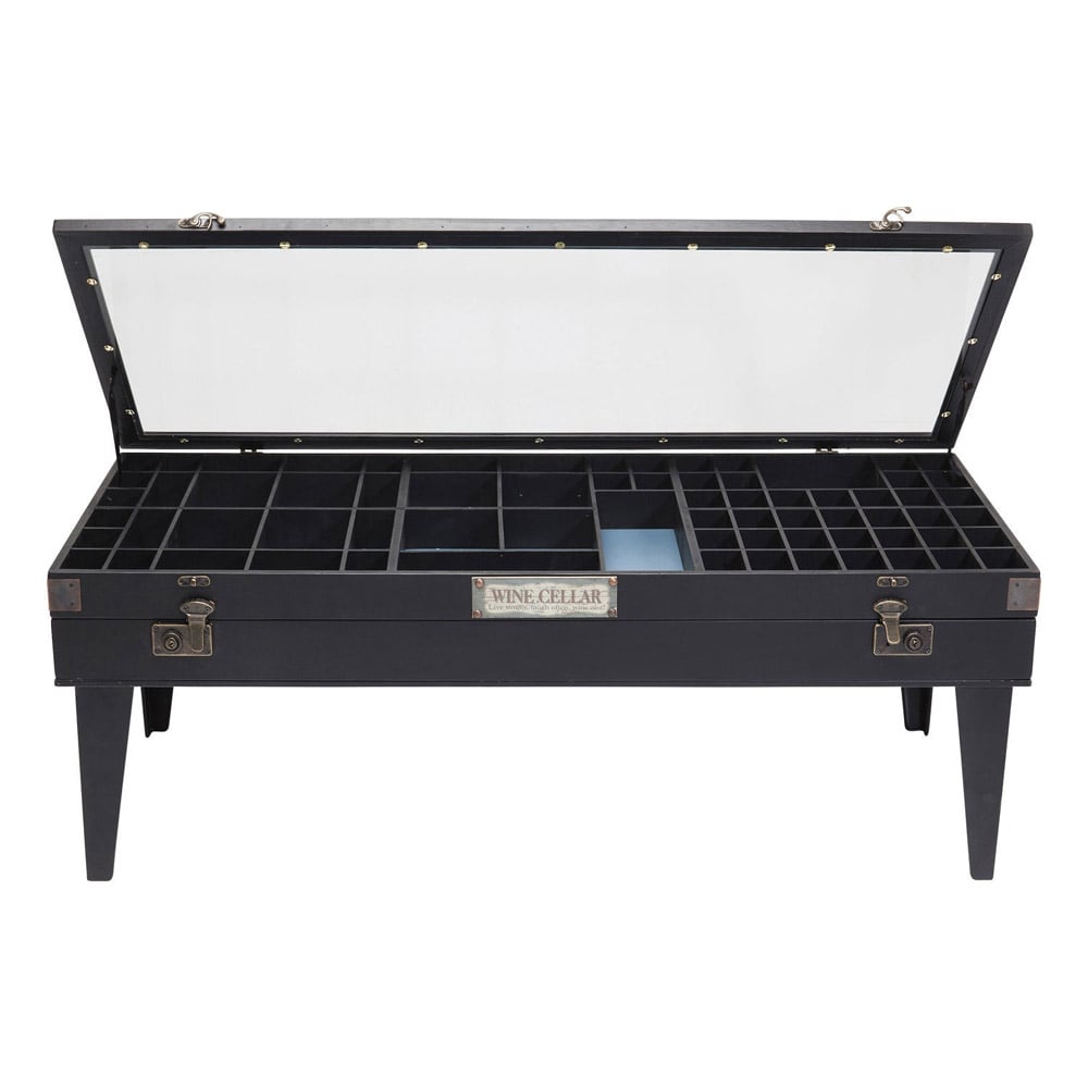 - De salontafel heeft een glazen vitrine met diverse vakken