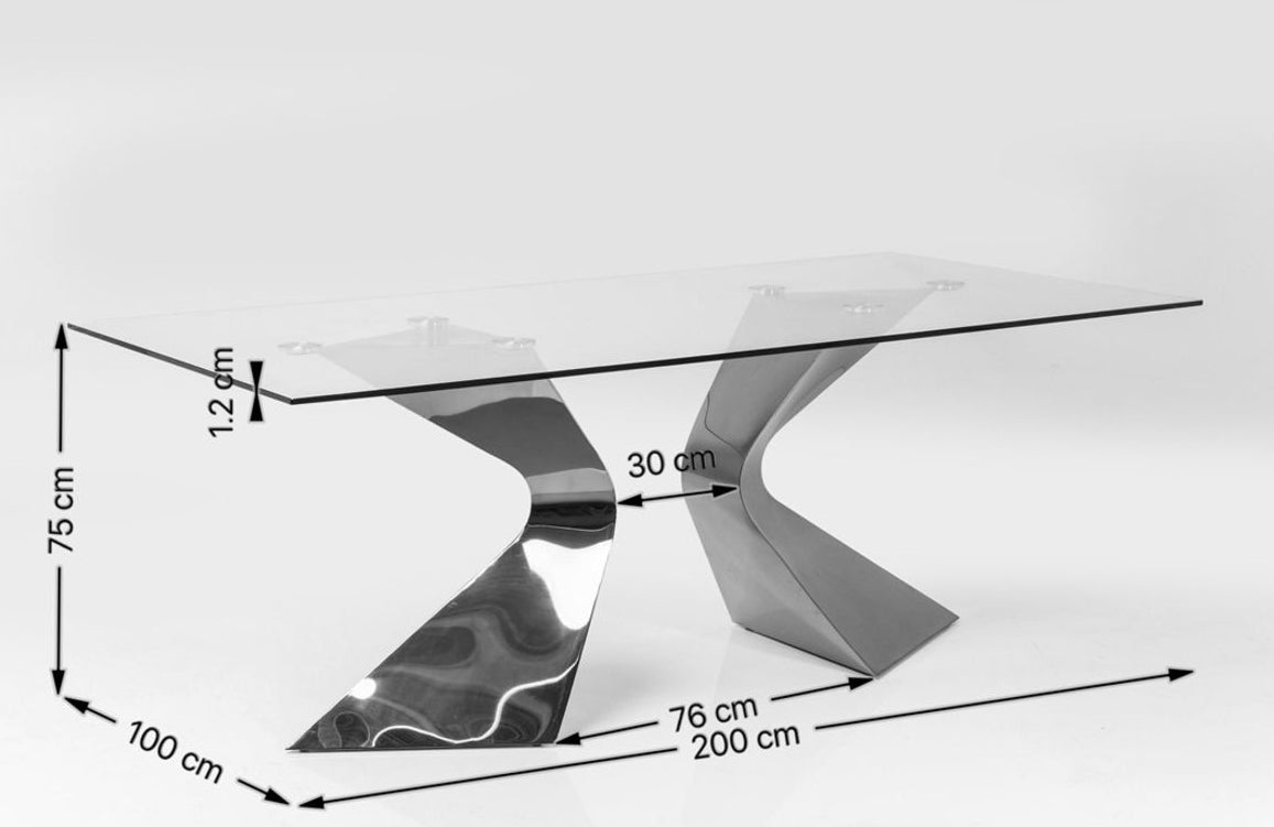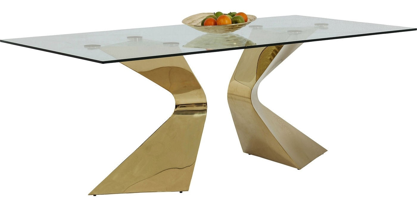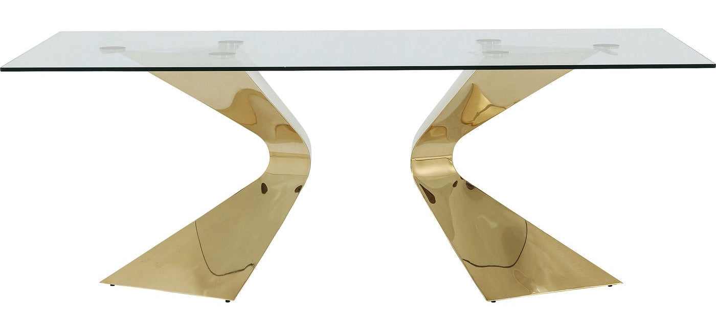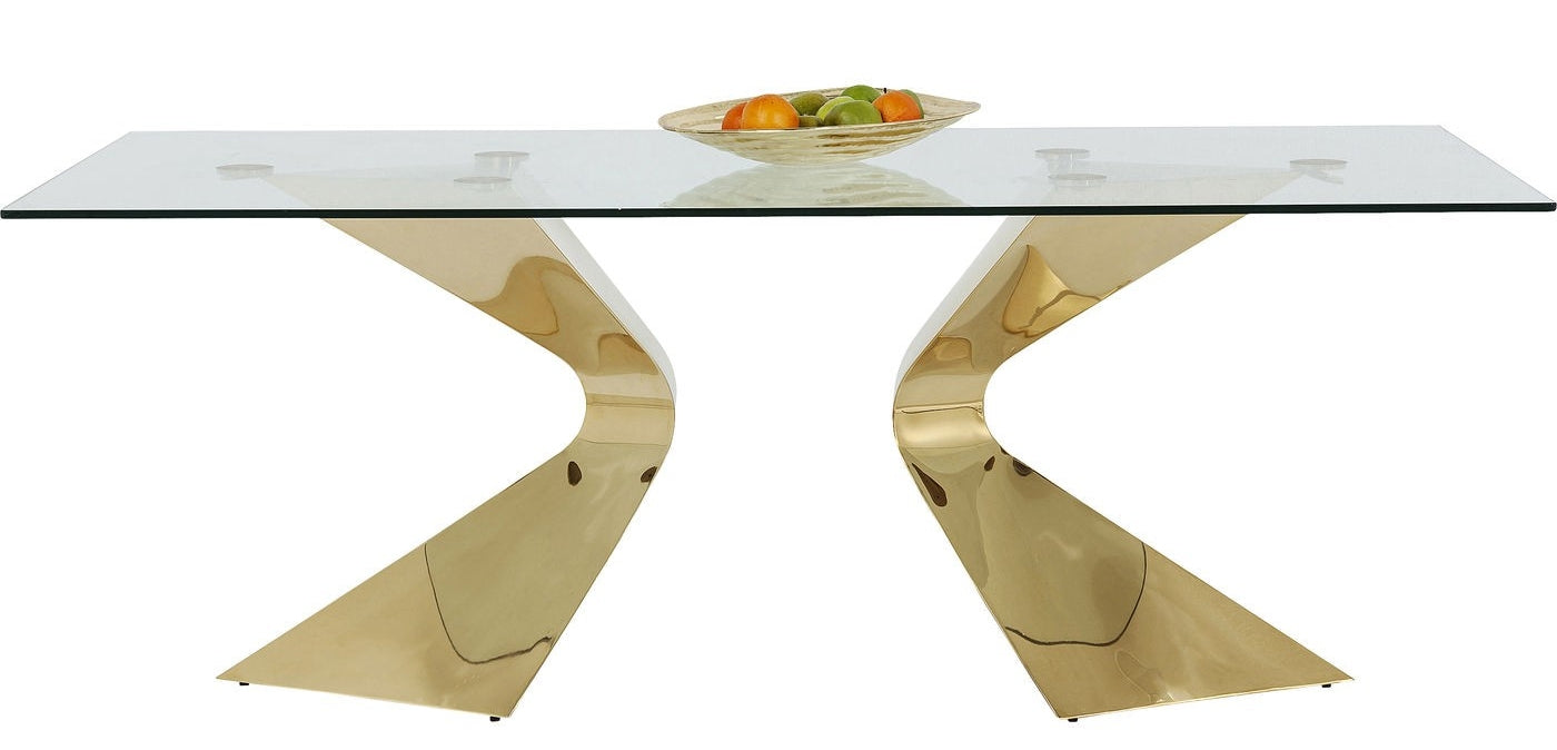 - Rechthoekige, grote glazen design tafel met decoratief gebogen, goudkleurige metalen poten voor maximaal 6 - 8 personen