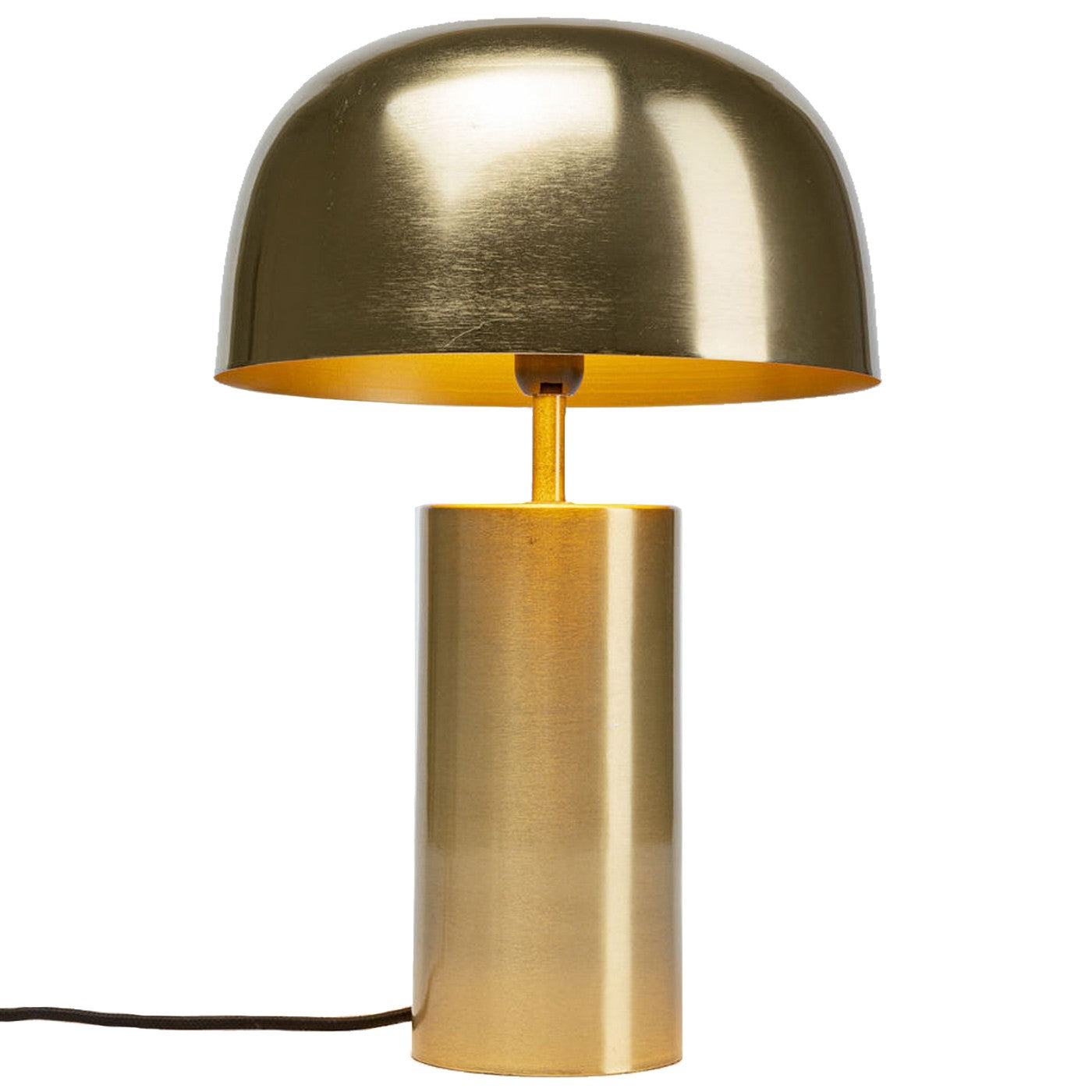 - Middelgrote, messingkleurige tafellamp in paddenstoelvorm van staal en met een cilindrische voet