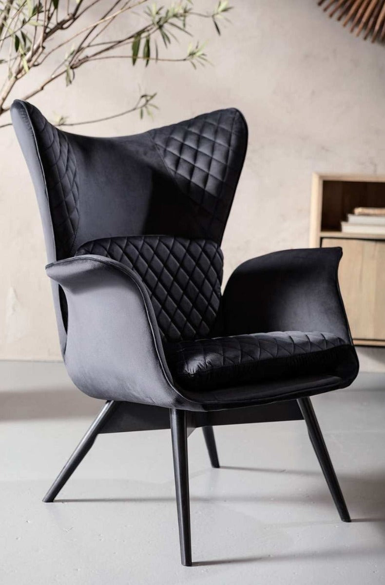 Met zijn zwarte fluwelen bekleding nodigt de Tudor fauteuil je uit om erin te gaan zitten Een fijn detail: de diamantstiksels benadrukt bovendien de gebogen lijnen De Tudor is een luxe en comfortabele fluwelen fauteuil met hoge rugleuning, brede armleuningen en mooie vormen, een fauteuil van het verleden in de stijl van vandaag! Een hoogwaardig gestoffeerd meubel waar je lang plezier van zult hebben, met slijtvaste bekleding en stevige poten van massief beukenhout Een favoriete zitplek voor dagdromen, thee drinken, lezen en TV kijken