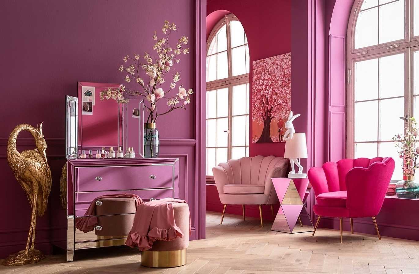 - Uitgevoerd in een glamoureuze stijl met een roze kleurschema en gouden poten, verrijkt met een messing afwerking.