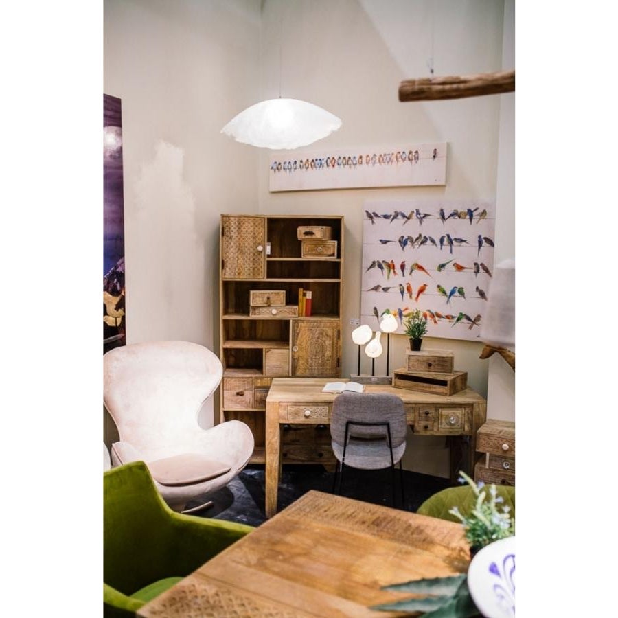 - Een meerkleurige afbeelding van vogels op hout en canvas, passend binnen moderne en Scandinavische interieurstijlen.
