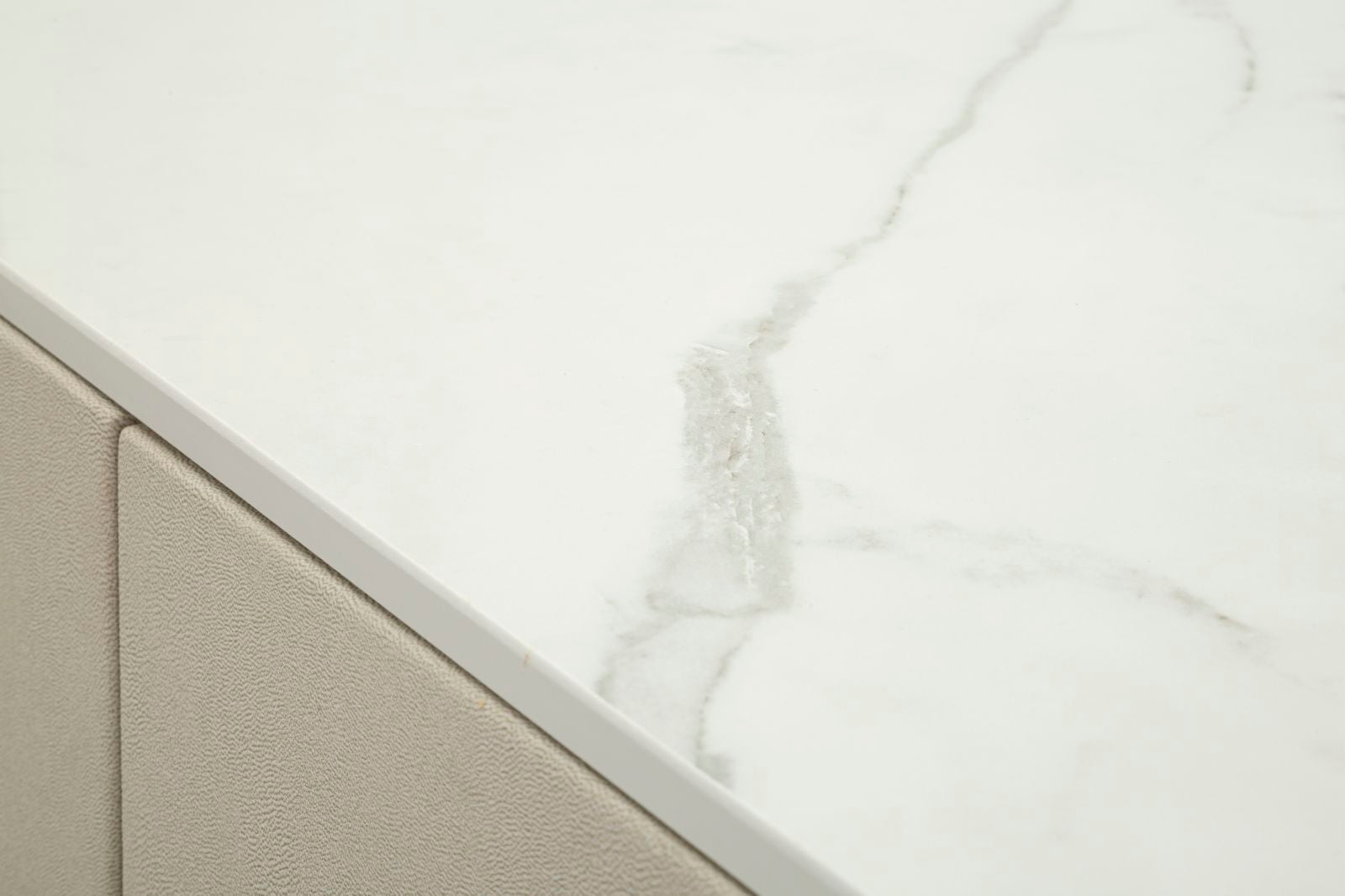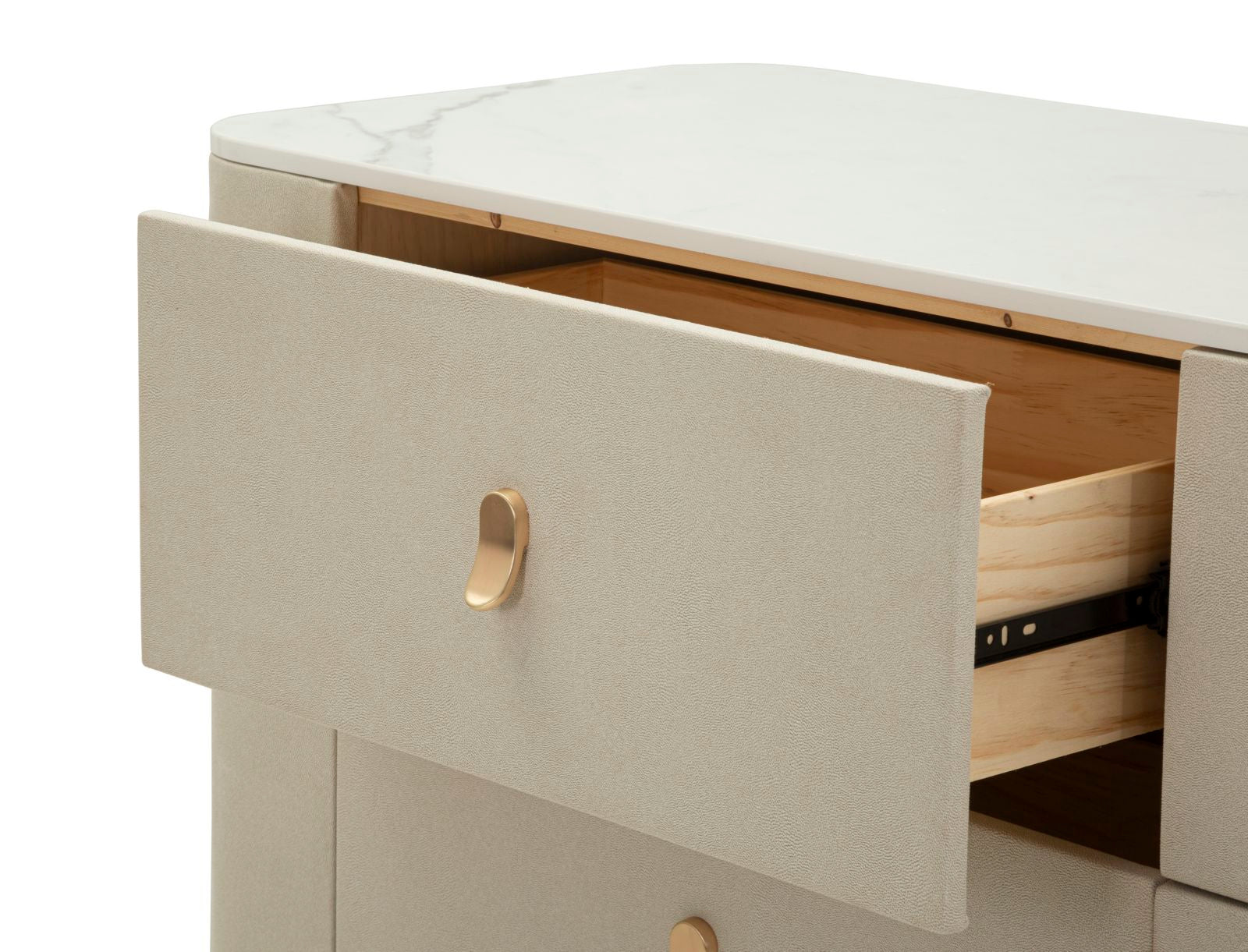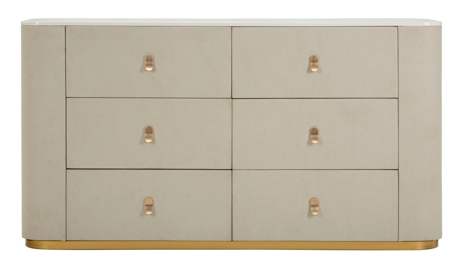 Kast in beige stof en goudkleurig metaal, 140x45x76 cm
