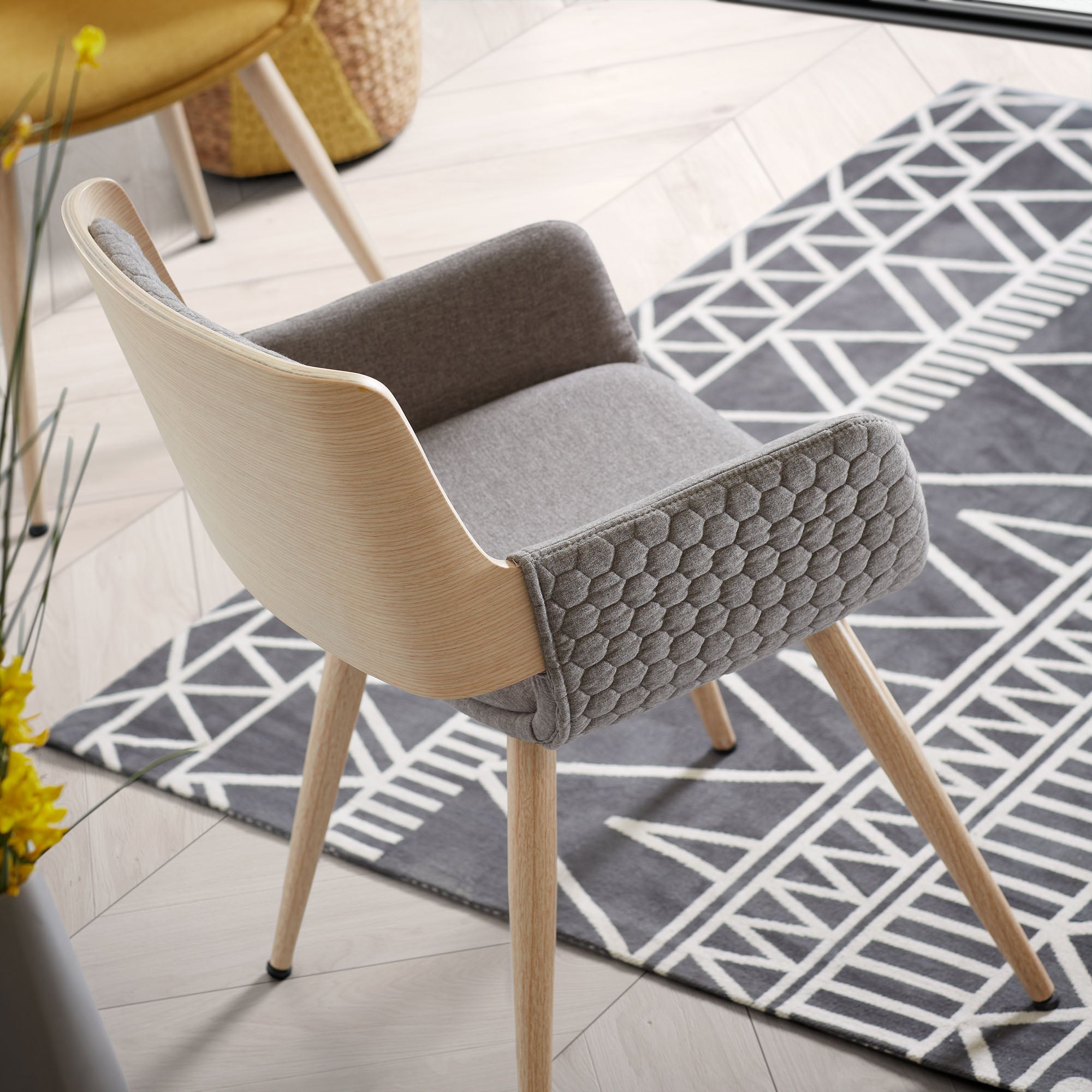 Stoel in gebogen eikenhout. Zitting en rug gedeeltelijk bekleed. stalen onderstel , hout effect