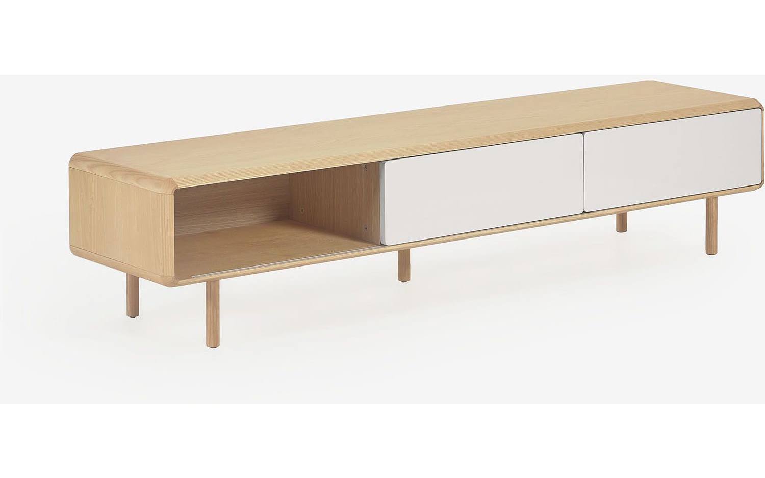- TV-meubel in essenfineer met poten en randen in massief essen.
