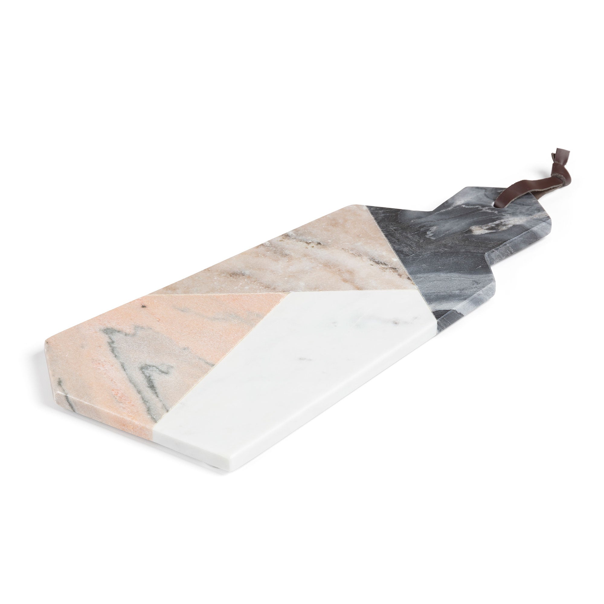 Rechthoekige snijplank 40,5 x 20 cm met een gesneden eind, gemaakt van marmer met een design met geometrische vormen in wit, donkergrijs, terracotta en lichtbruin. Met handvat en bruin leren hanger.
