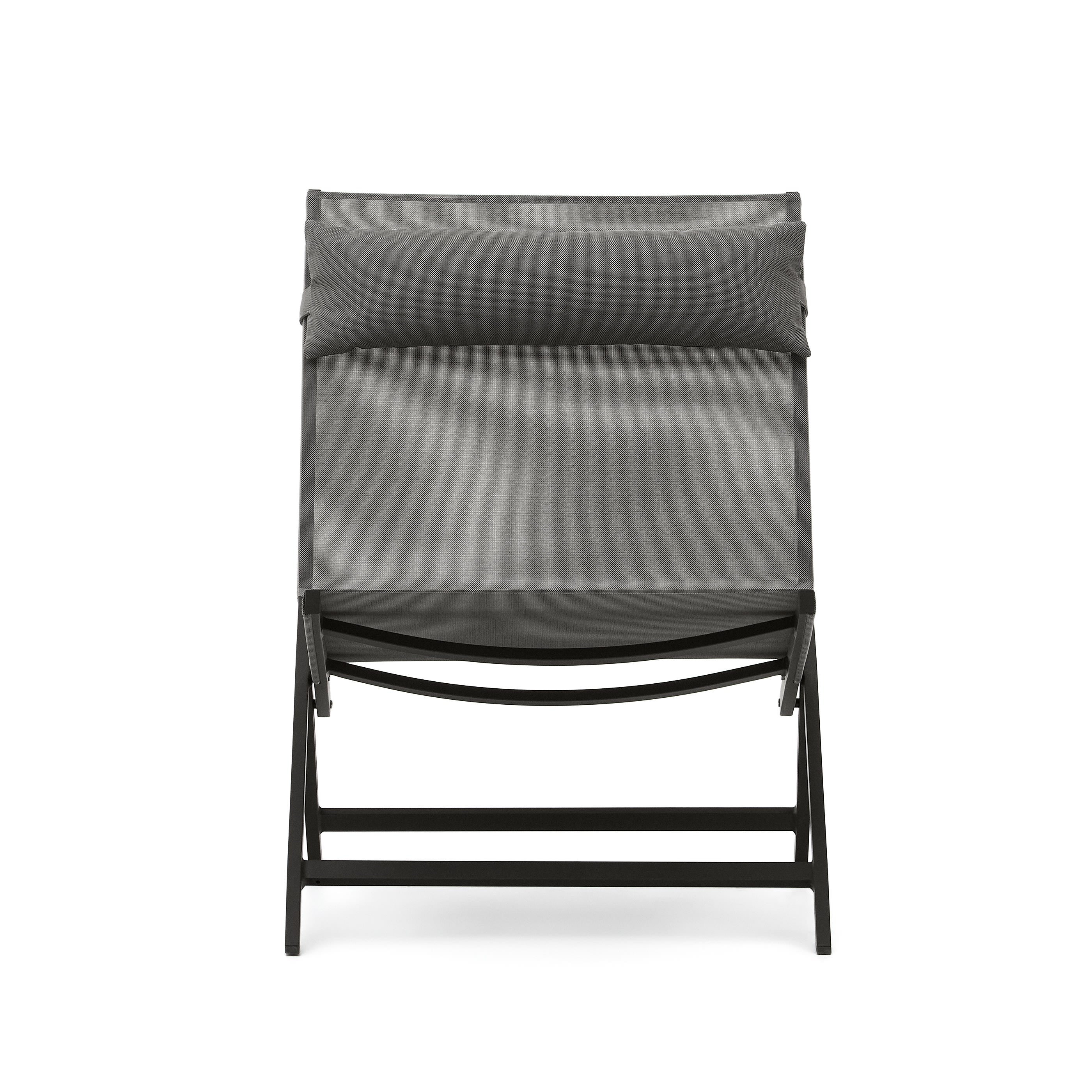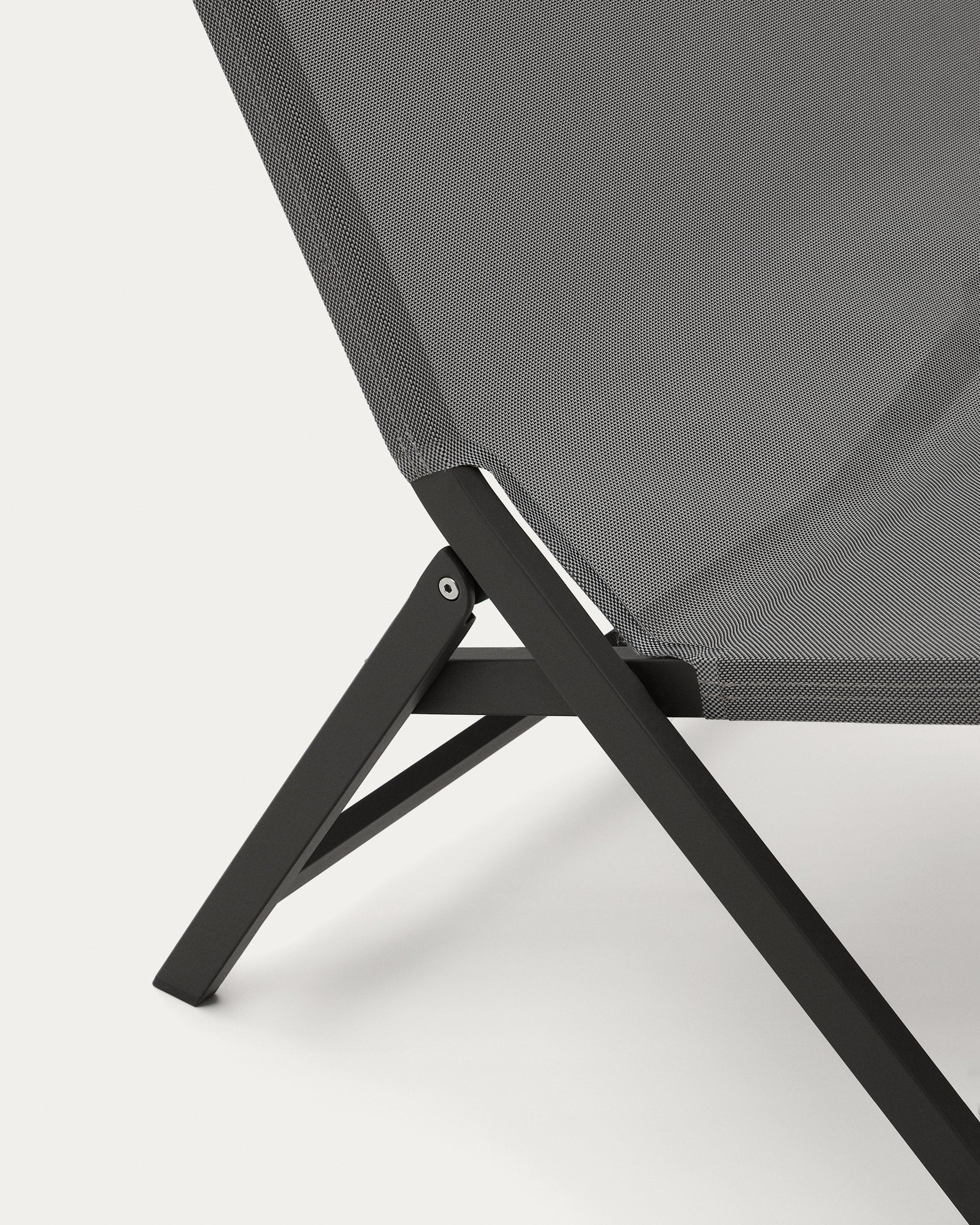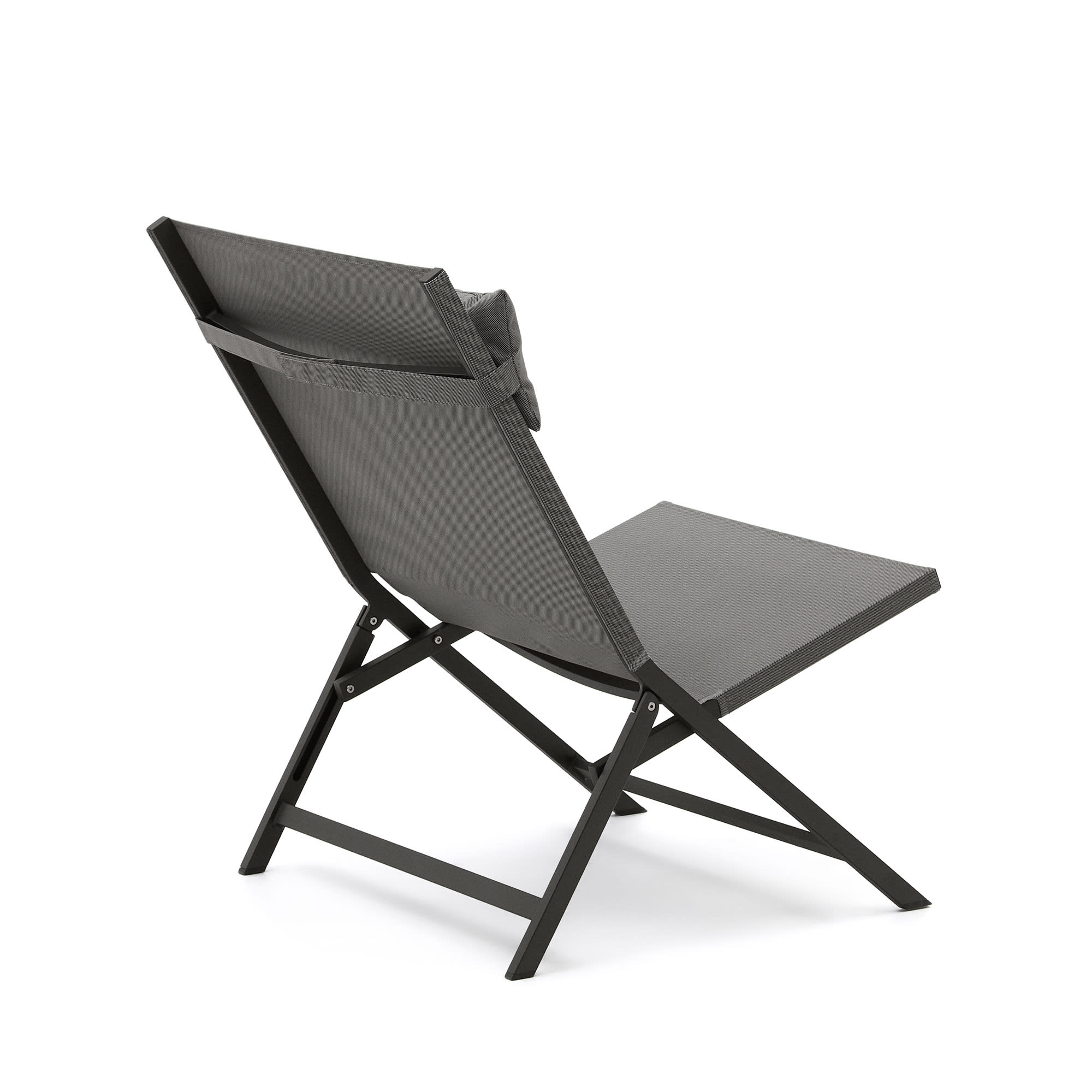 - Opvouwbare stoel met aluminium frame en texteline, afgewerkt in donkergrijs.