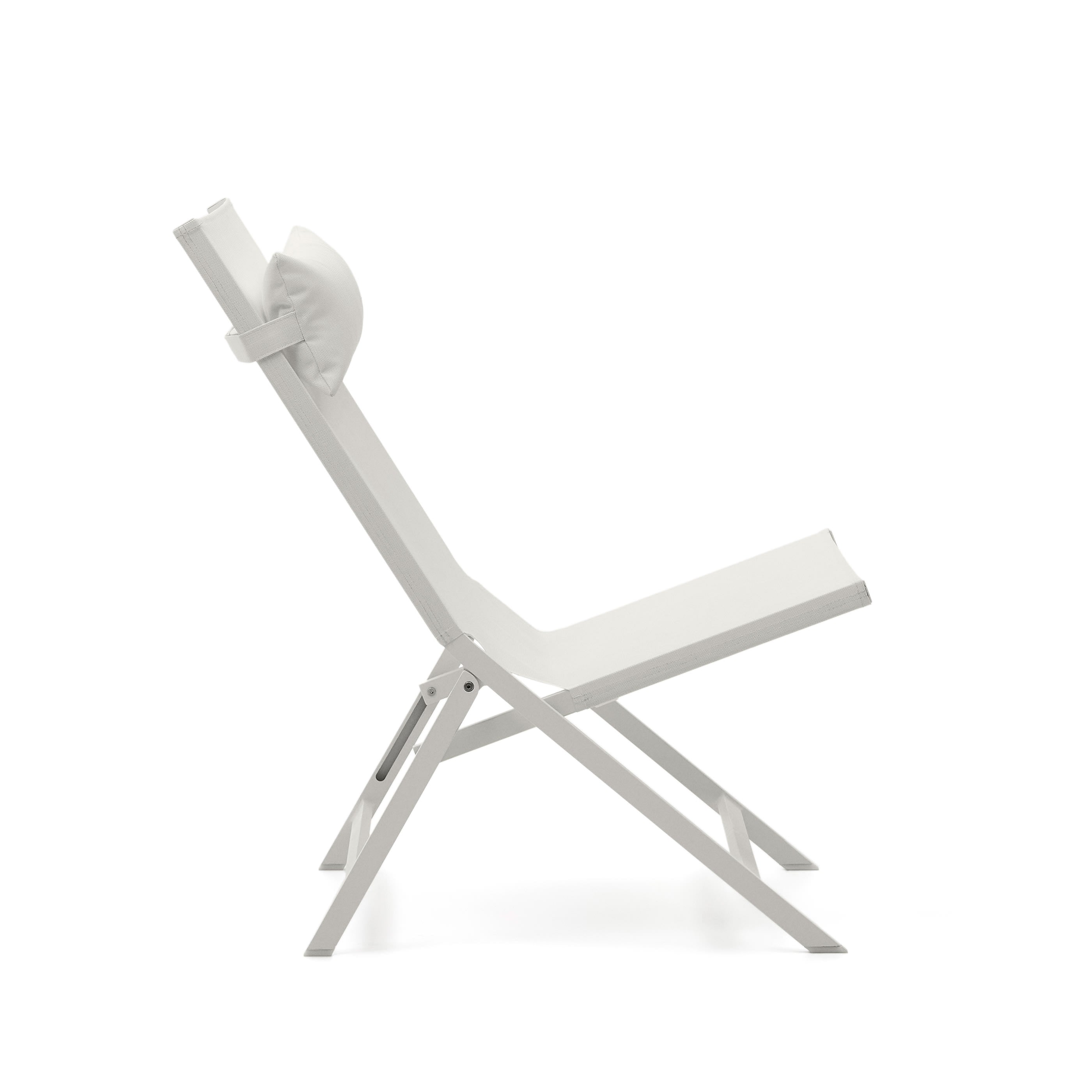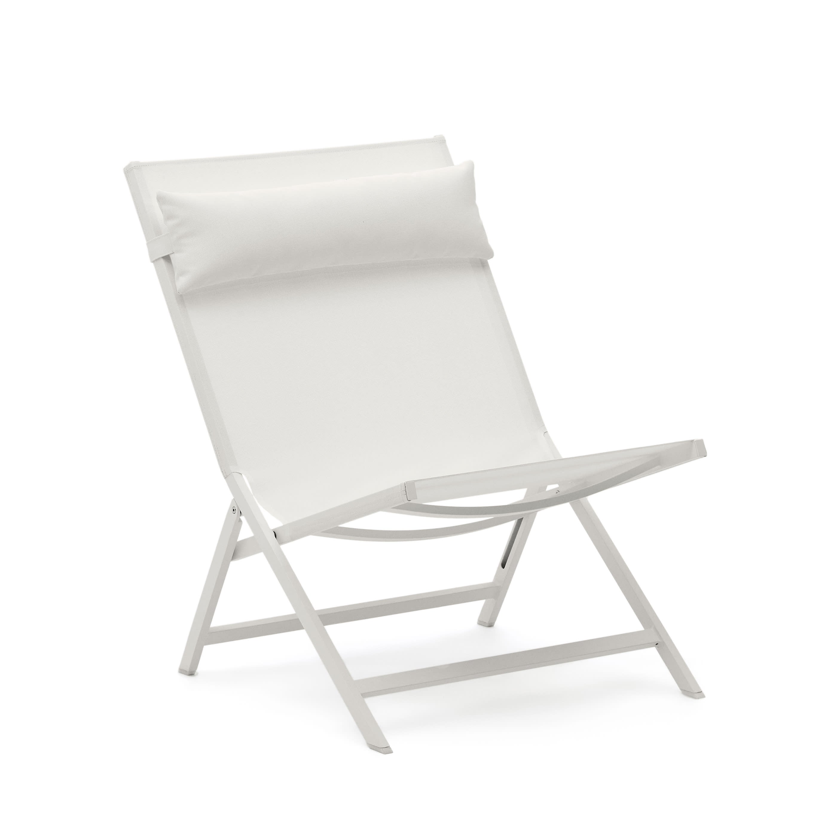 - Opvouwbare fauteuil met aluminium frame en texteline, afgewerkt in lichtgrijs.