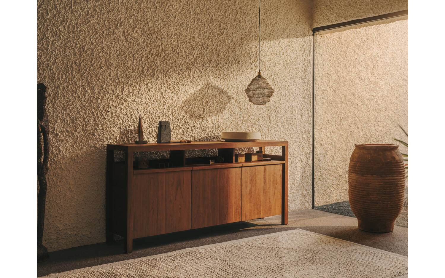 - Dressoir Sashi van massief teakhout met geborsteld effect.