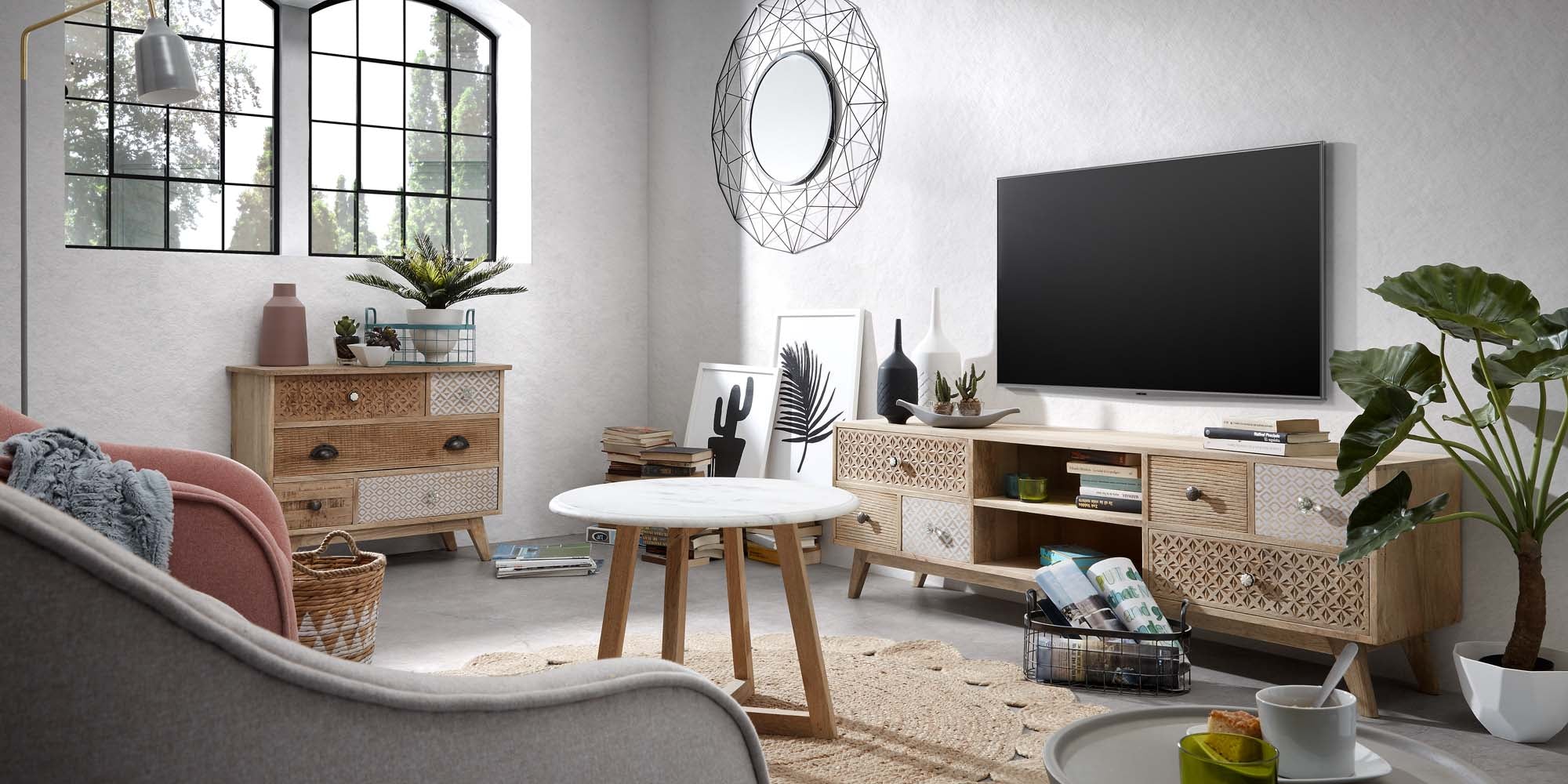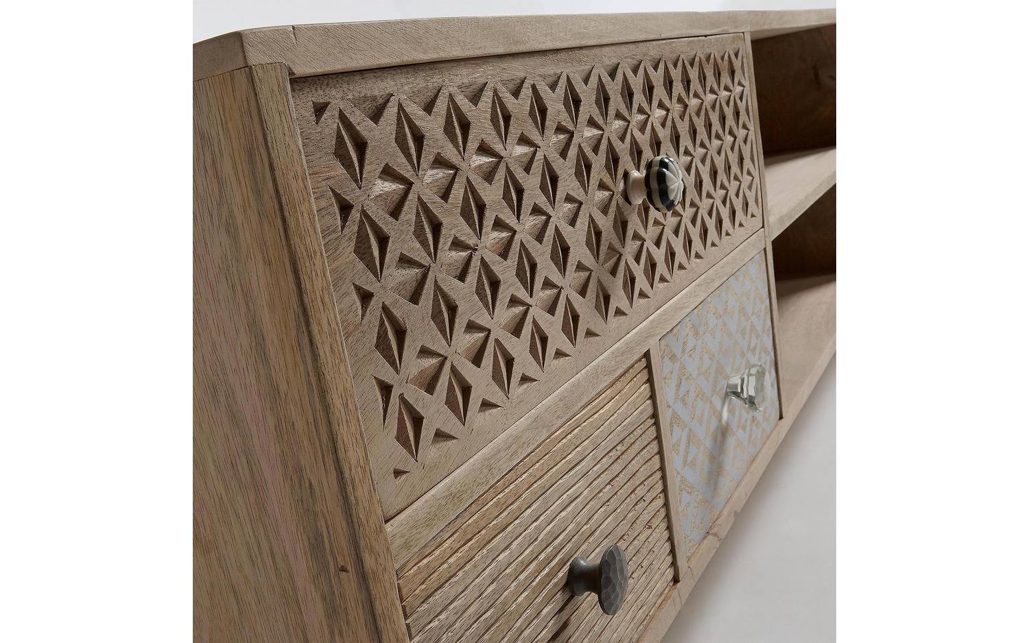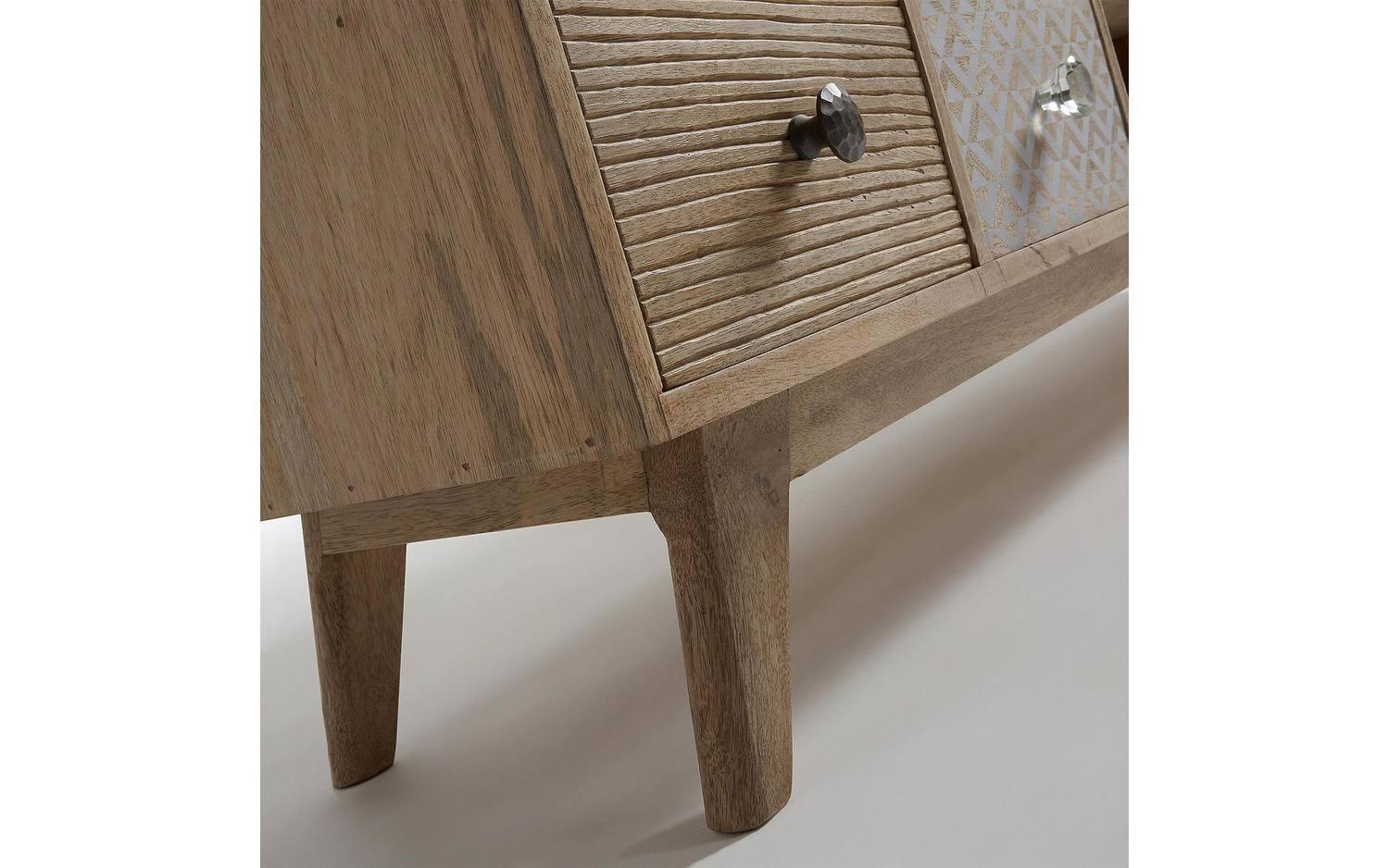 TV -meubel in massief mangohout met uitgesneden en bedrukte laden.