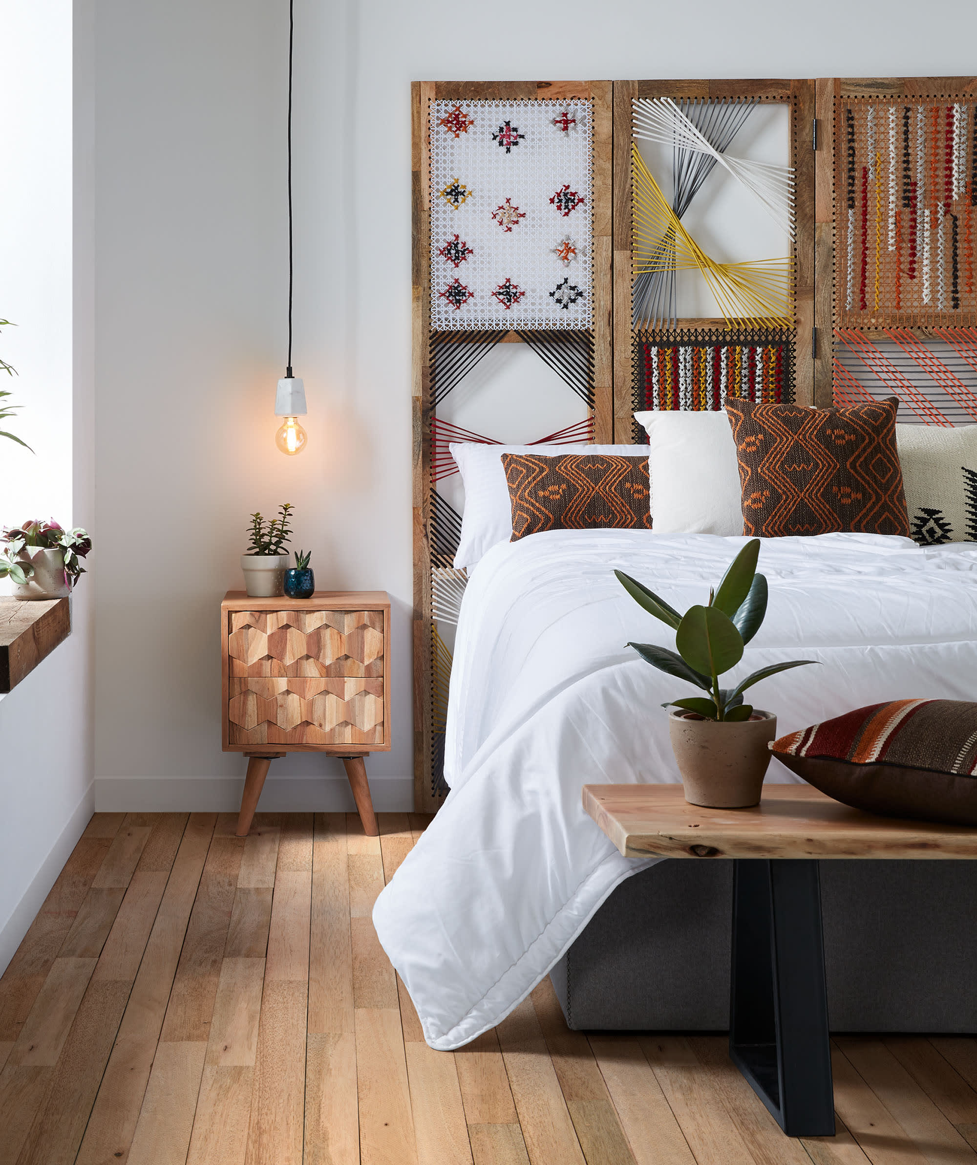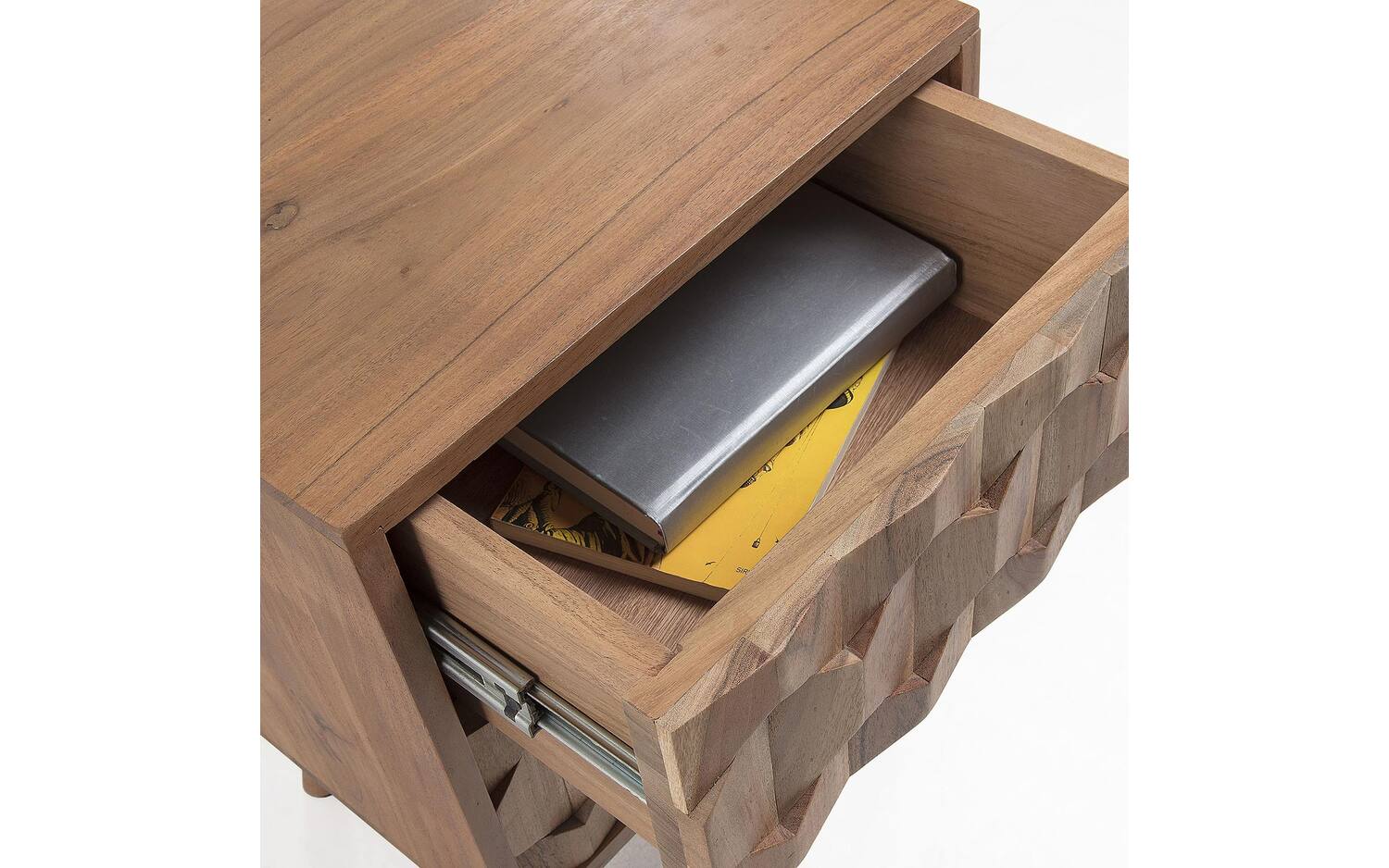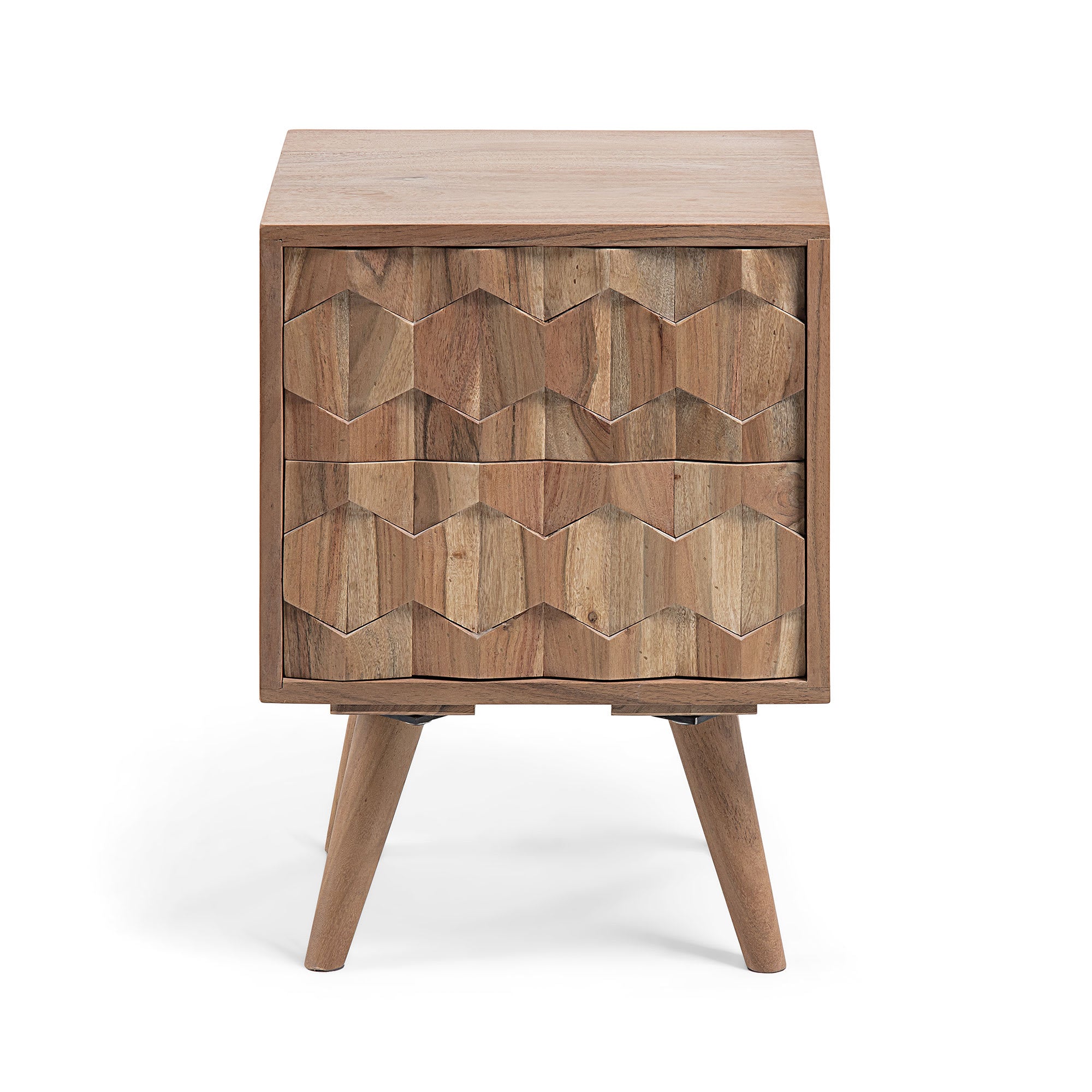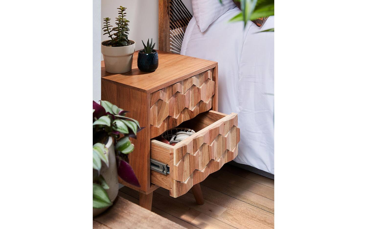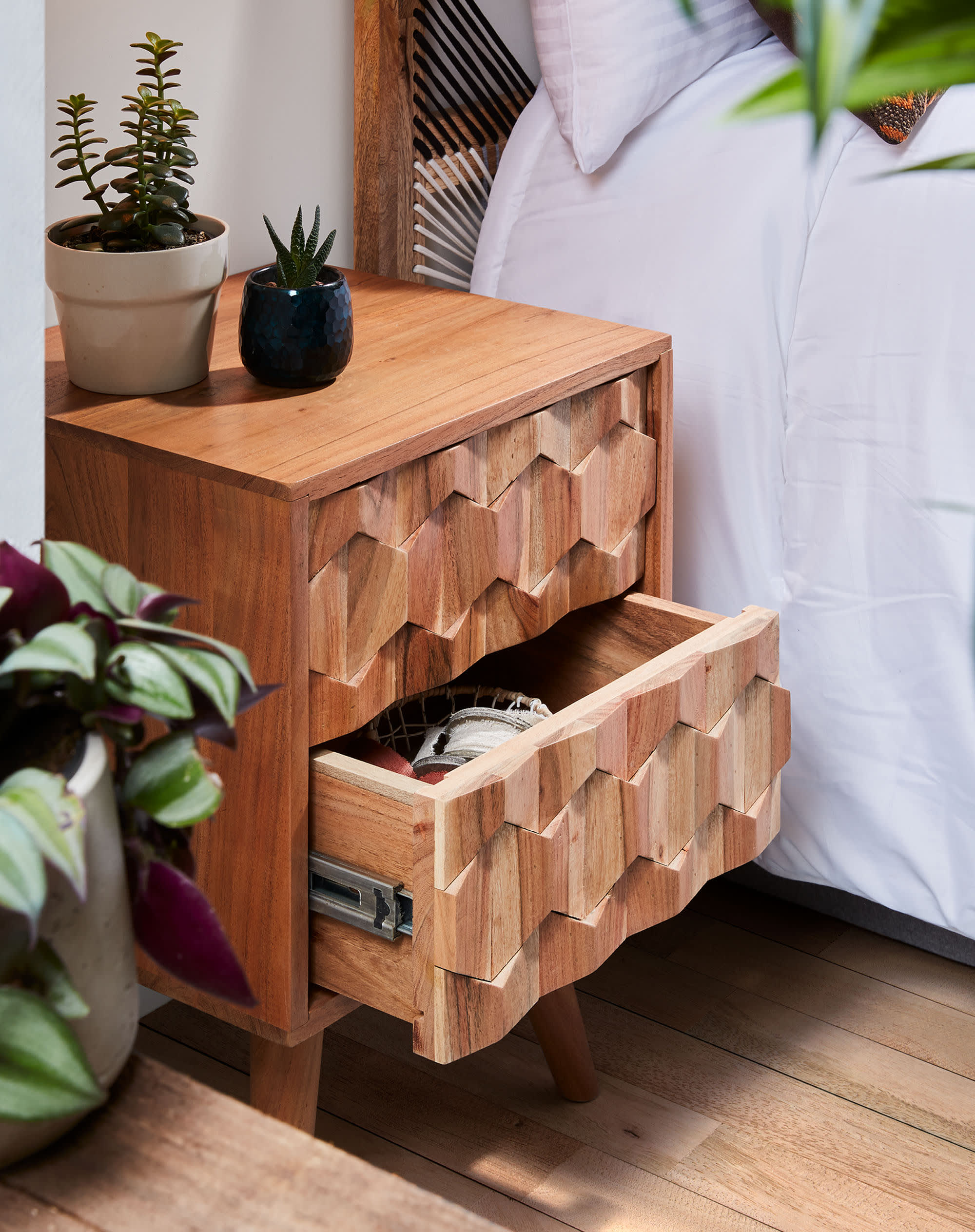 Hoe je bed ook staat je zult altijd willen dat de Khaleesi dichtbij is. Een nachtkastje van massief acaciahout met een uniek ontwerp, geïnspireerd op de zichtbare geometrische vormen die in het hout zijn uitgehouwen om diepte te creëren.