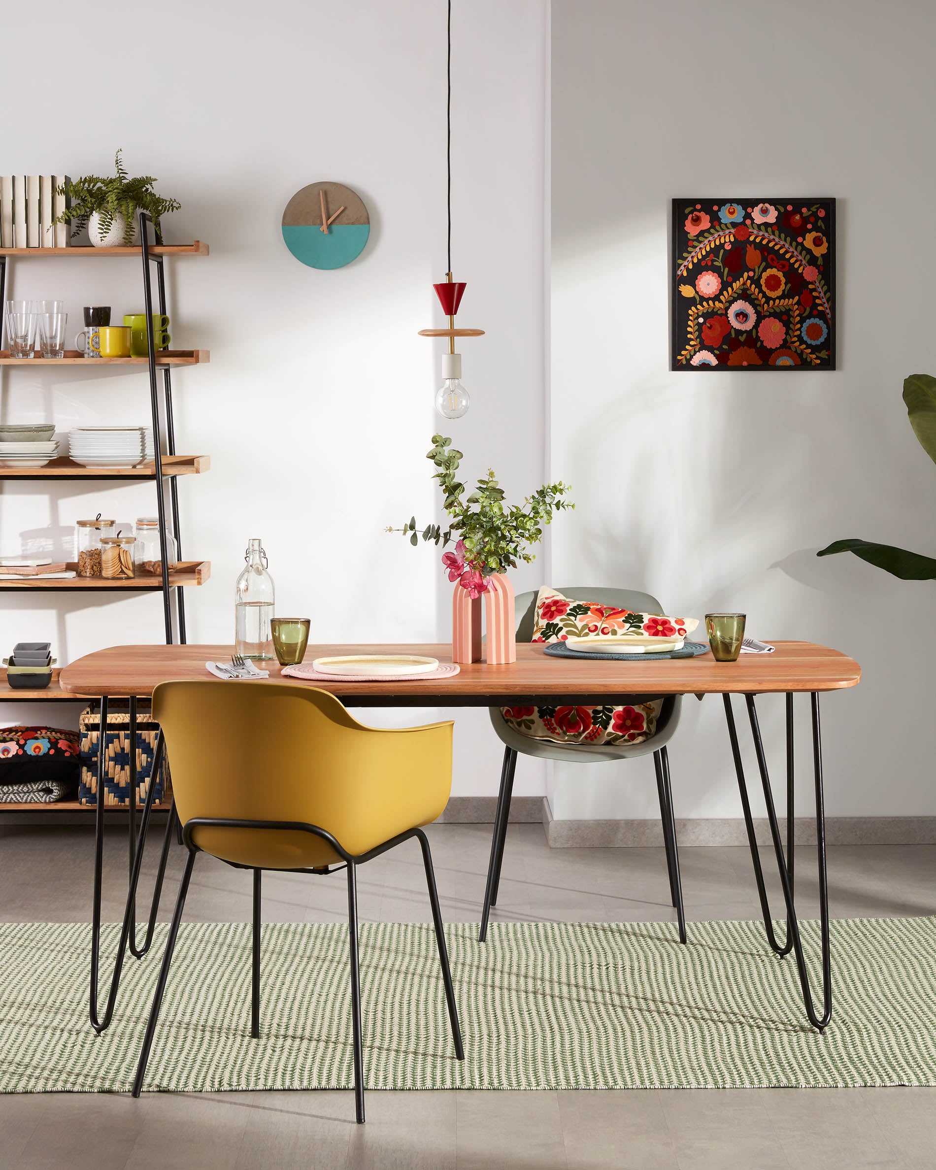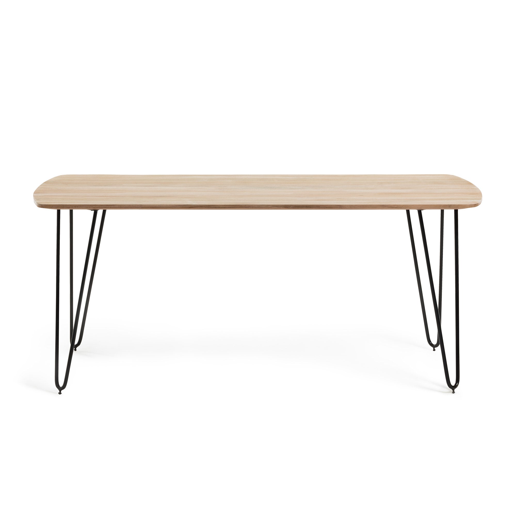 De kleine Barcli tafel heeft een massief acaciahouten tafelblad en vier V-vormige metalen poten, zwart geschilderd, perfect te combineren met de natuurlijke afwerking van het hout. Naast het feit dat uw Barcli tafel een designstuk met karakter is, is uw Barcli tafel net zo authentiek als u bent. Elke tafelblad is uniek, omdat het massief hout is, met zijn eigen nerven en tinten. What's yours?
