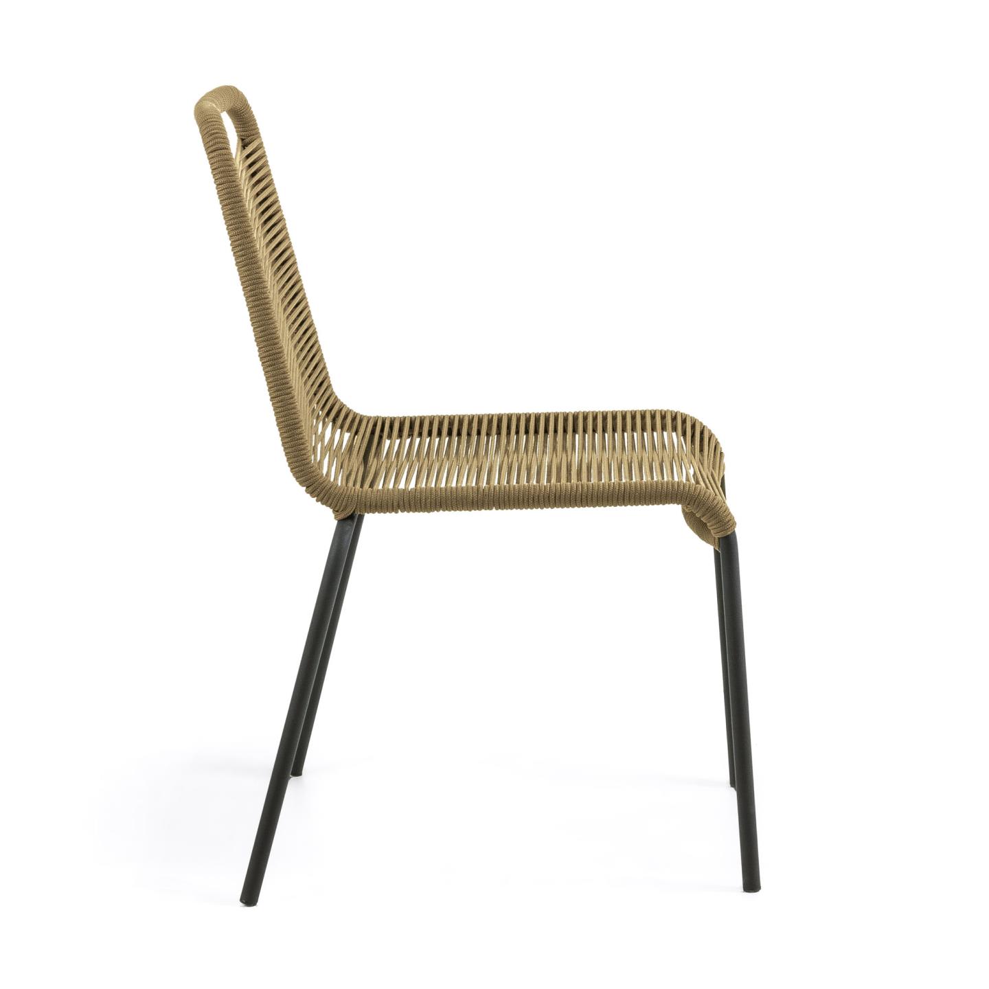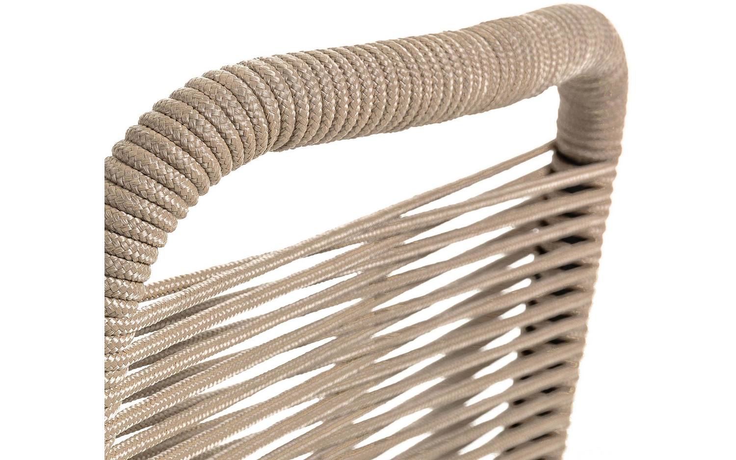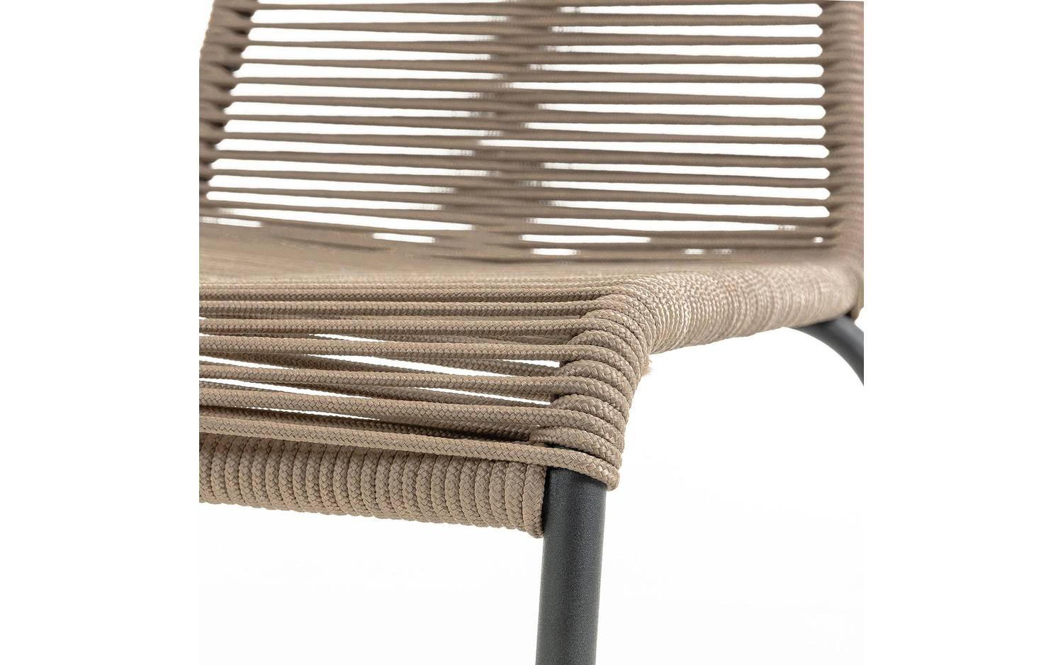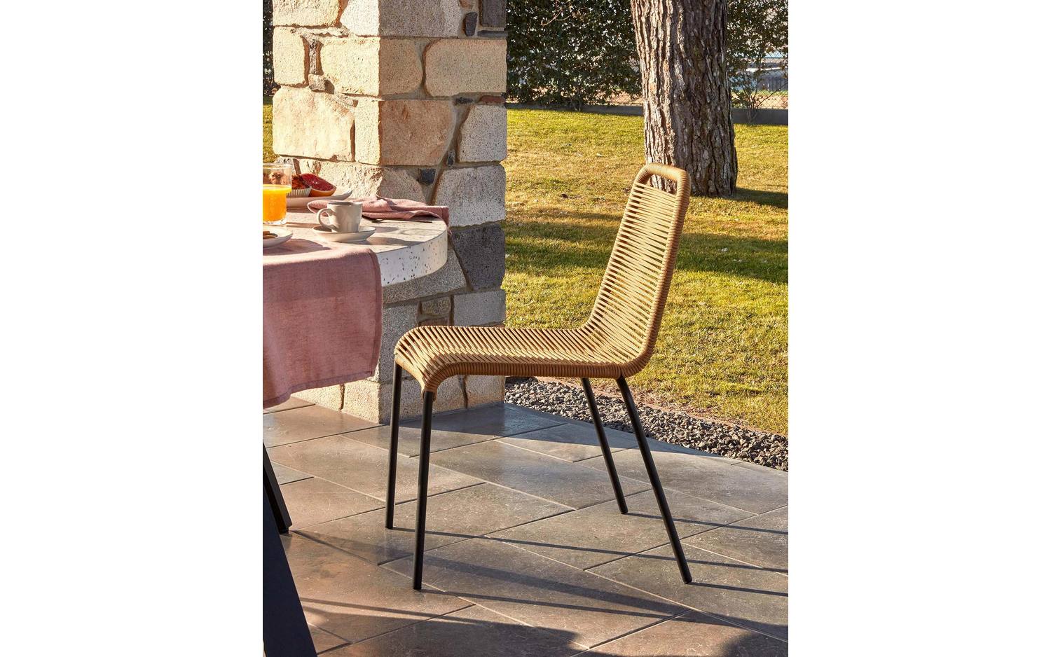 Stoel van staal met een gegalvaniseerde poedercoating. Zitting en rugleuning van UV-gestabiliseerd polyester touw. Stapelbaar. Voor gebruik binnenshuis en buitenshuis onder een afdak.