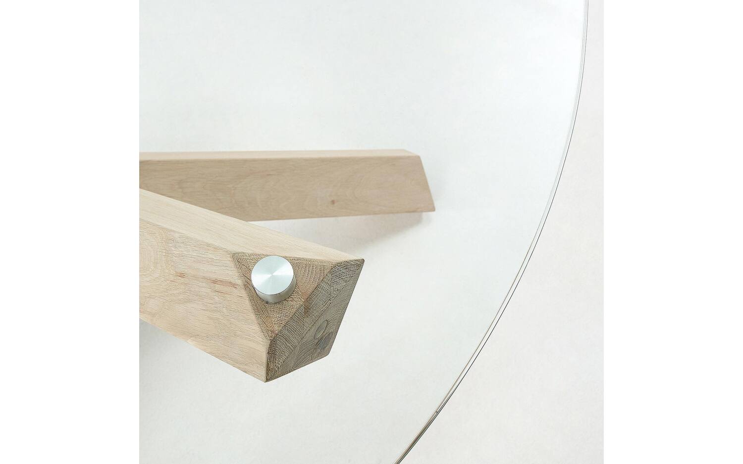 Ronde tafel met glazen envelop. Massieve eiken poten met gebleekte afwerking. Hoogte van 77 cm.