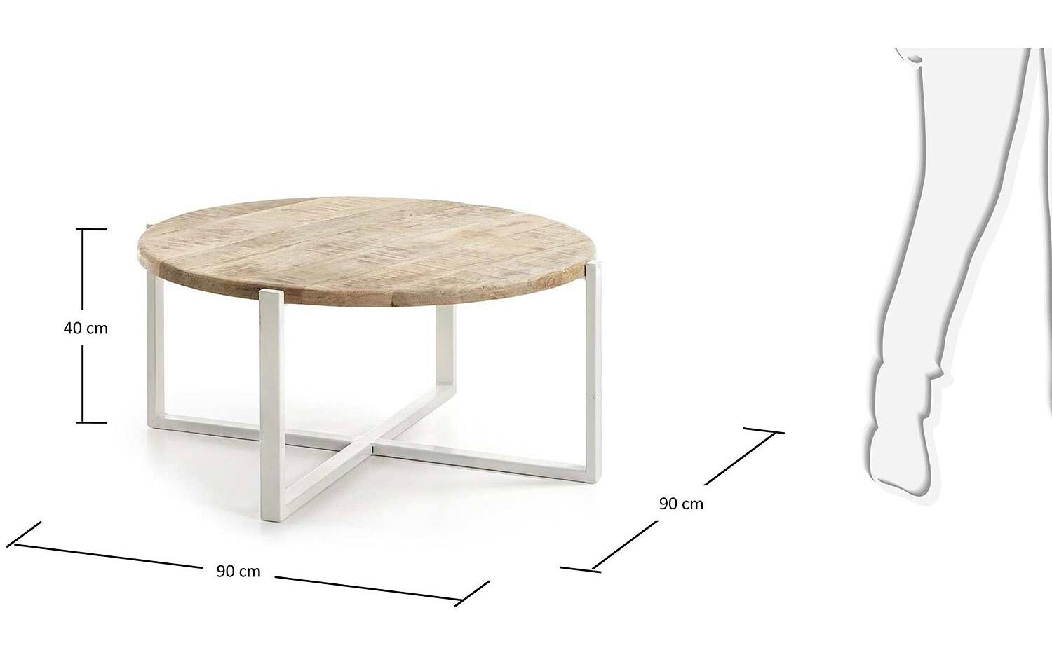 Salontafel met witte ijzeren structuur en massief mangohouten blad in natuurlijke afwerking.