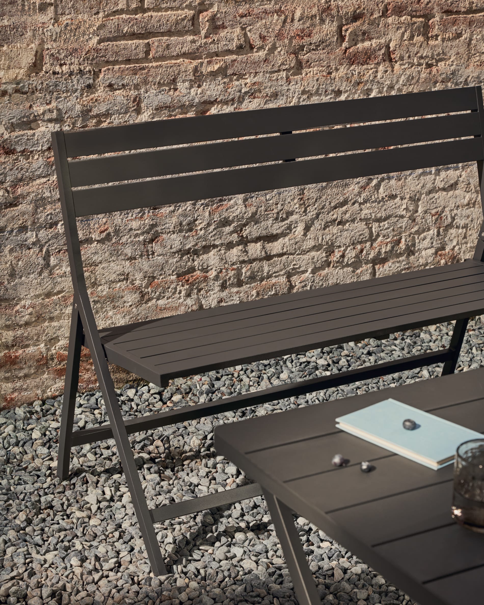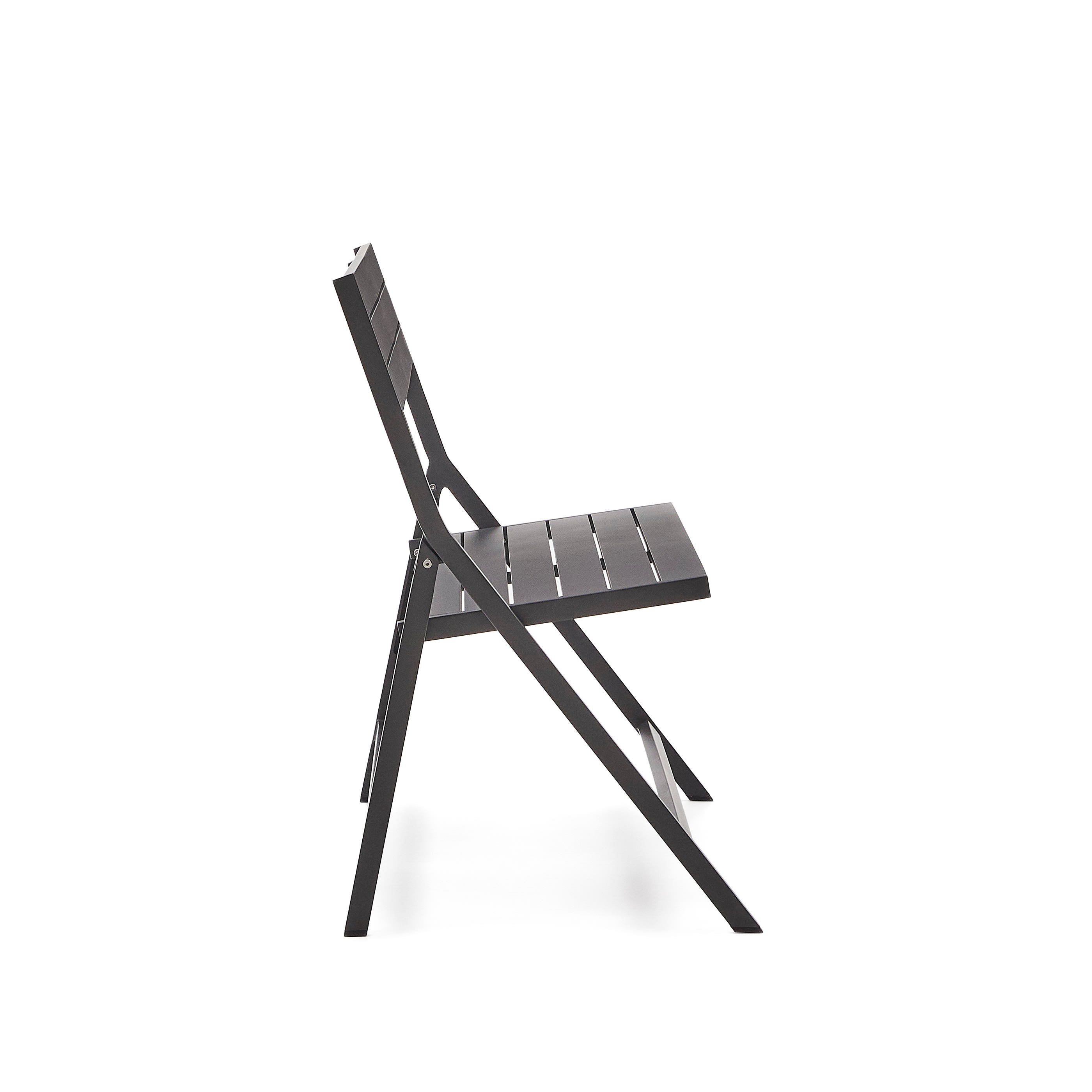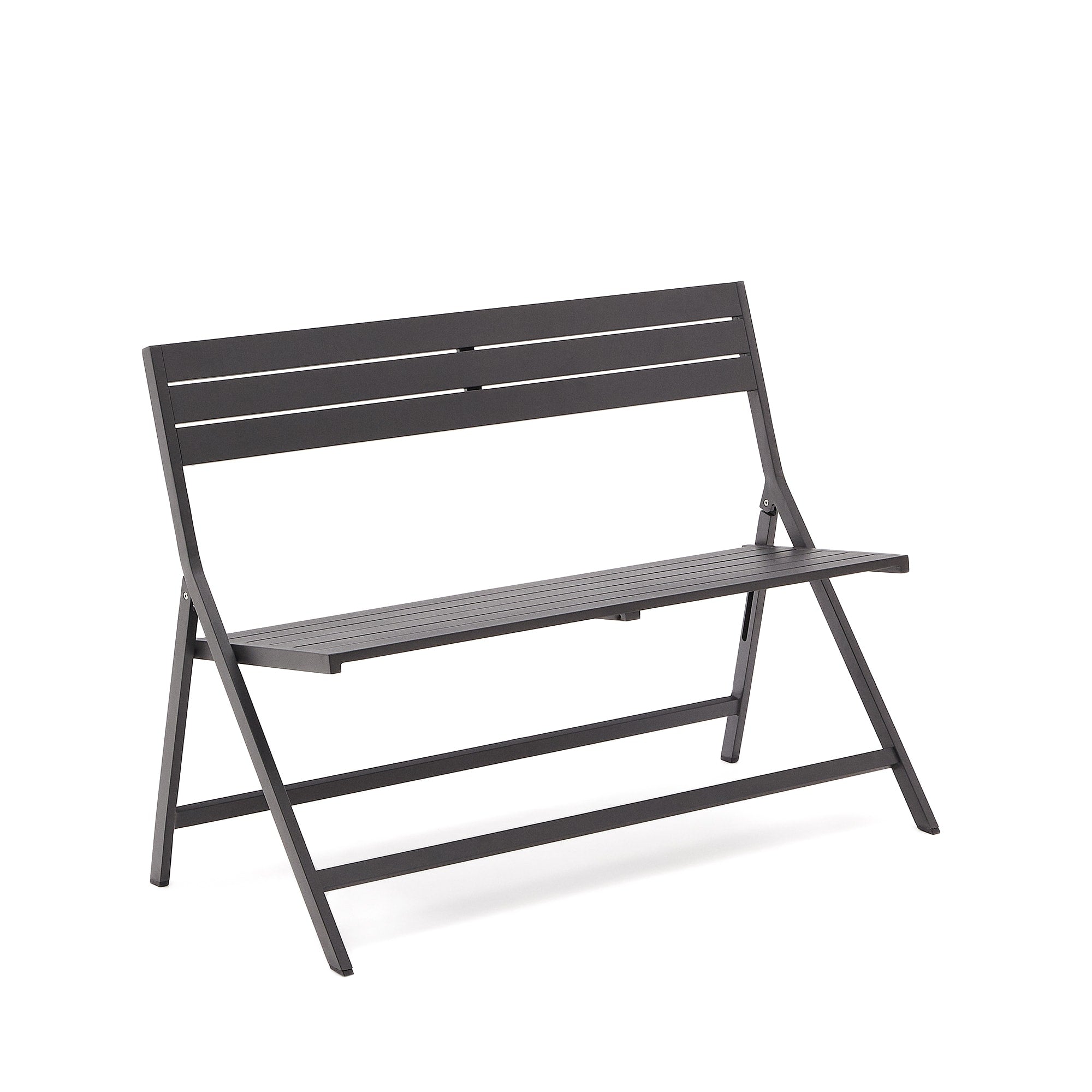 - Opvouwbare bank gemaakt van aluminium met een donkergrijze afwerking.