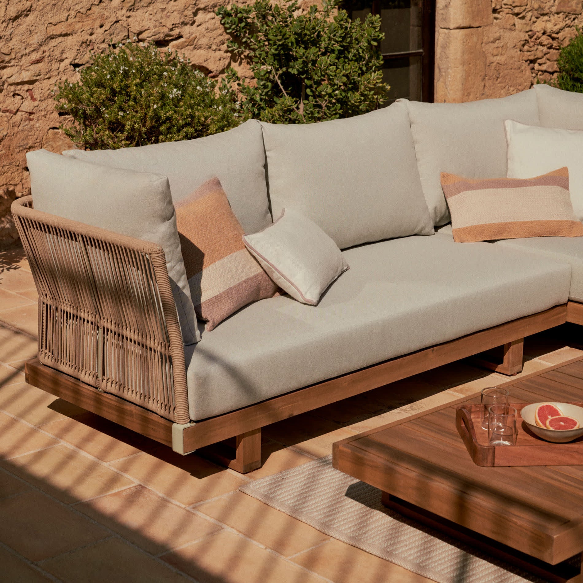 - 5-zits hoekbank en salontafel van acaciahout met handgevlochten touw