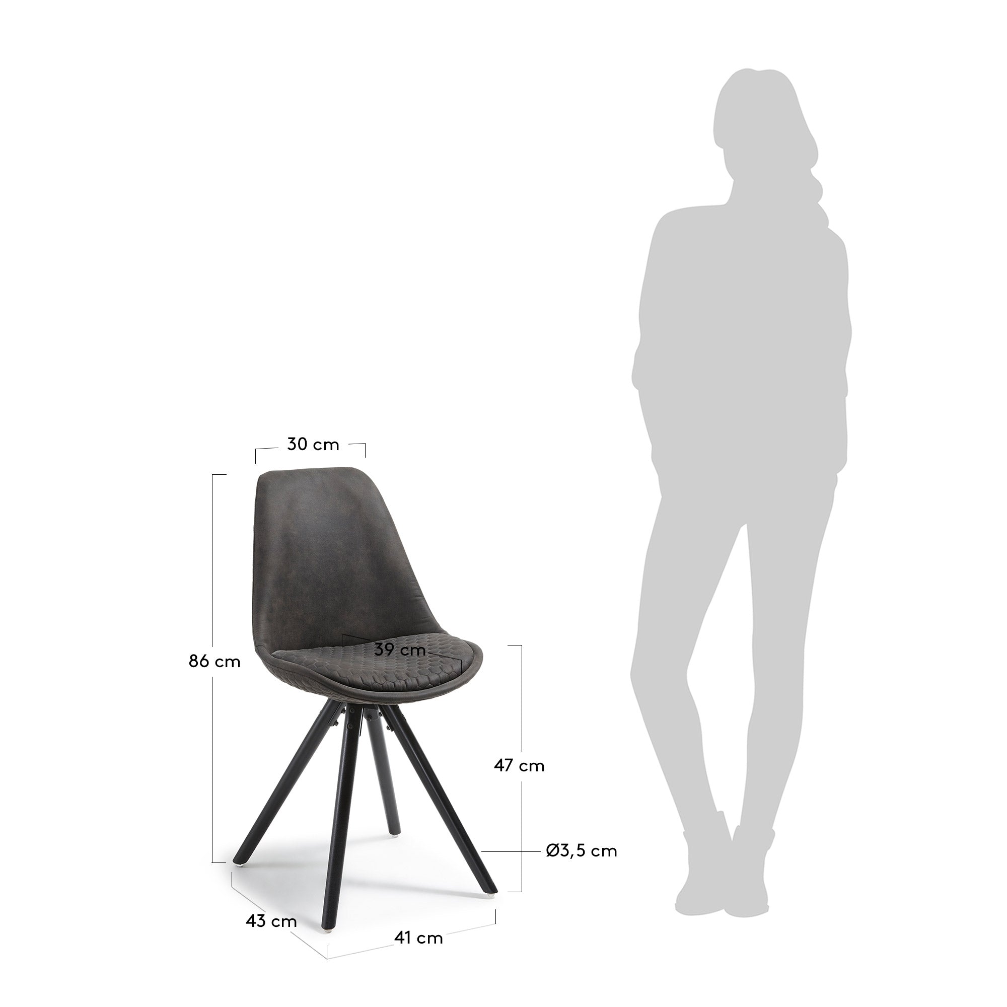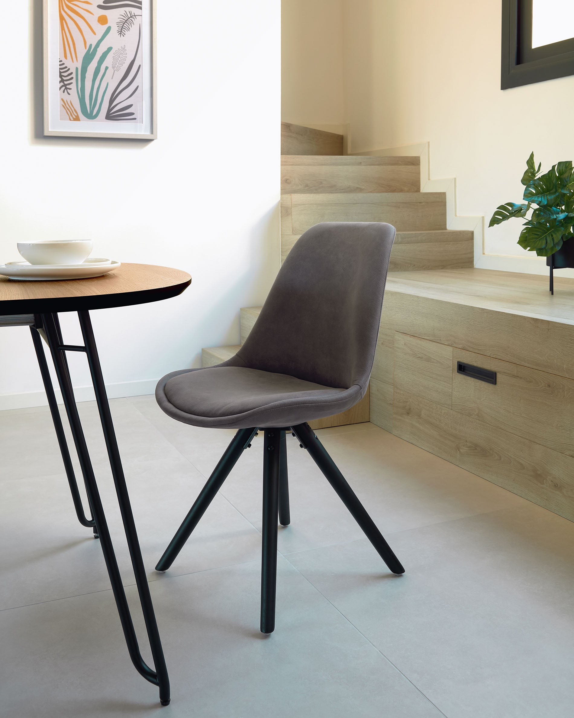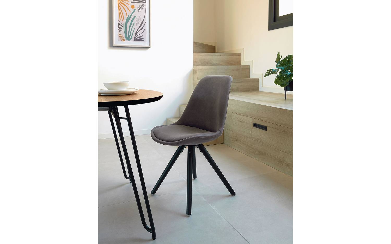 - Eetkamerstoel met bekleding in donkergrijs.