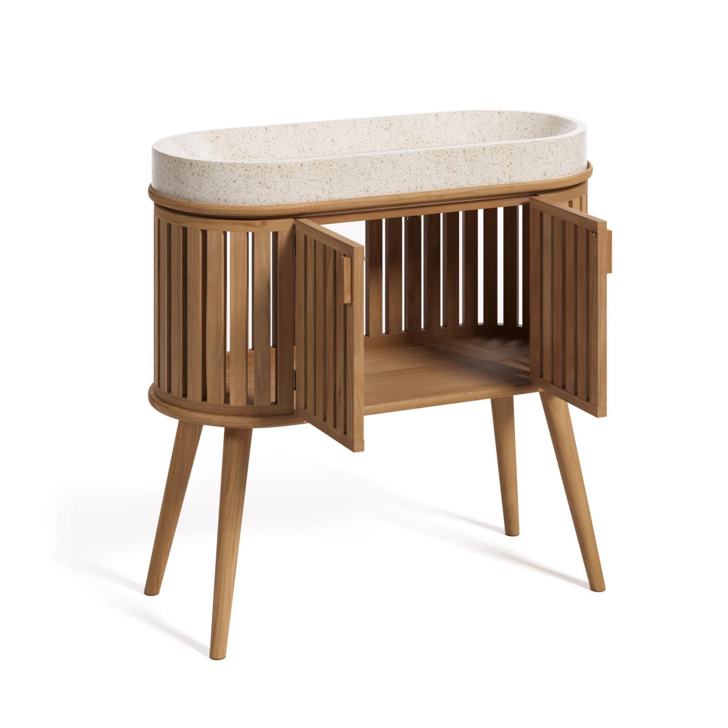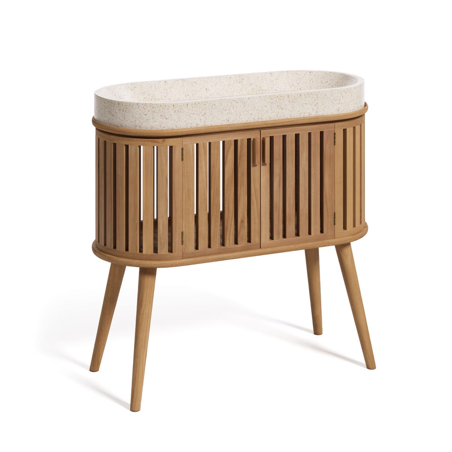 - Massief teakhouten badkamermeubel met natuurlijke afwerking.