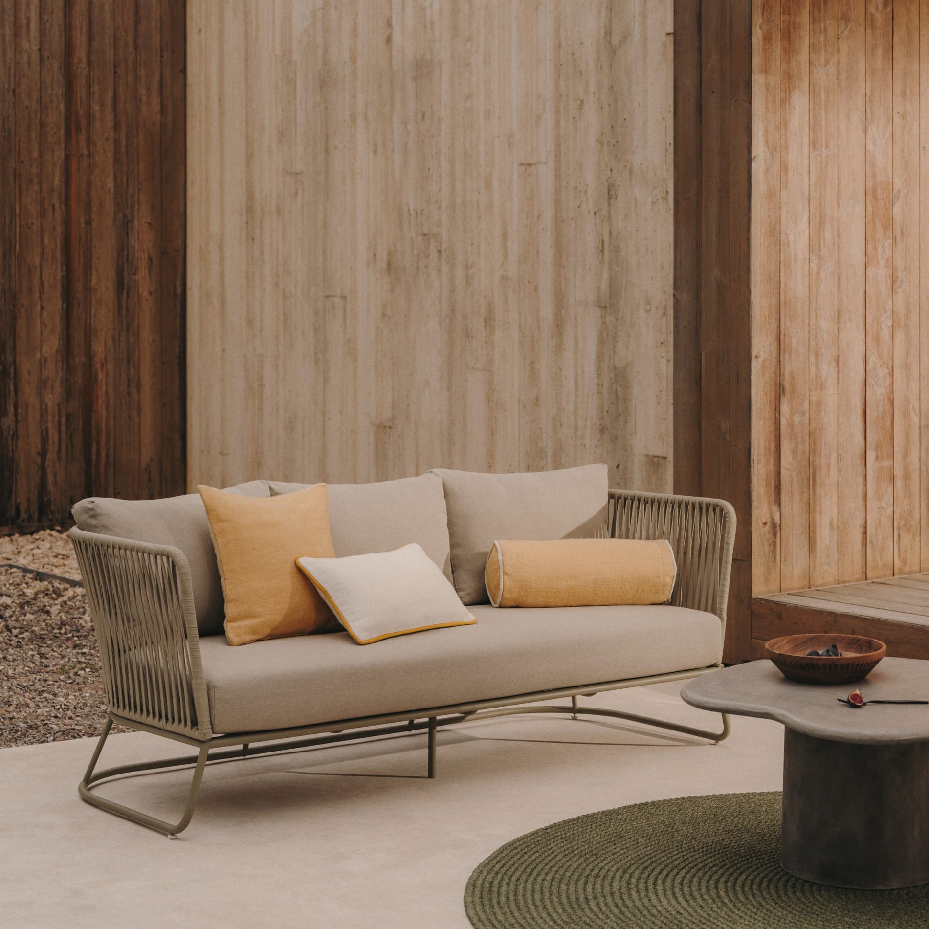 - Sofa met 3 zitplaatsen en handgevlochten rugleuning en zitting met UV-bestendig touw.