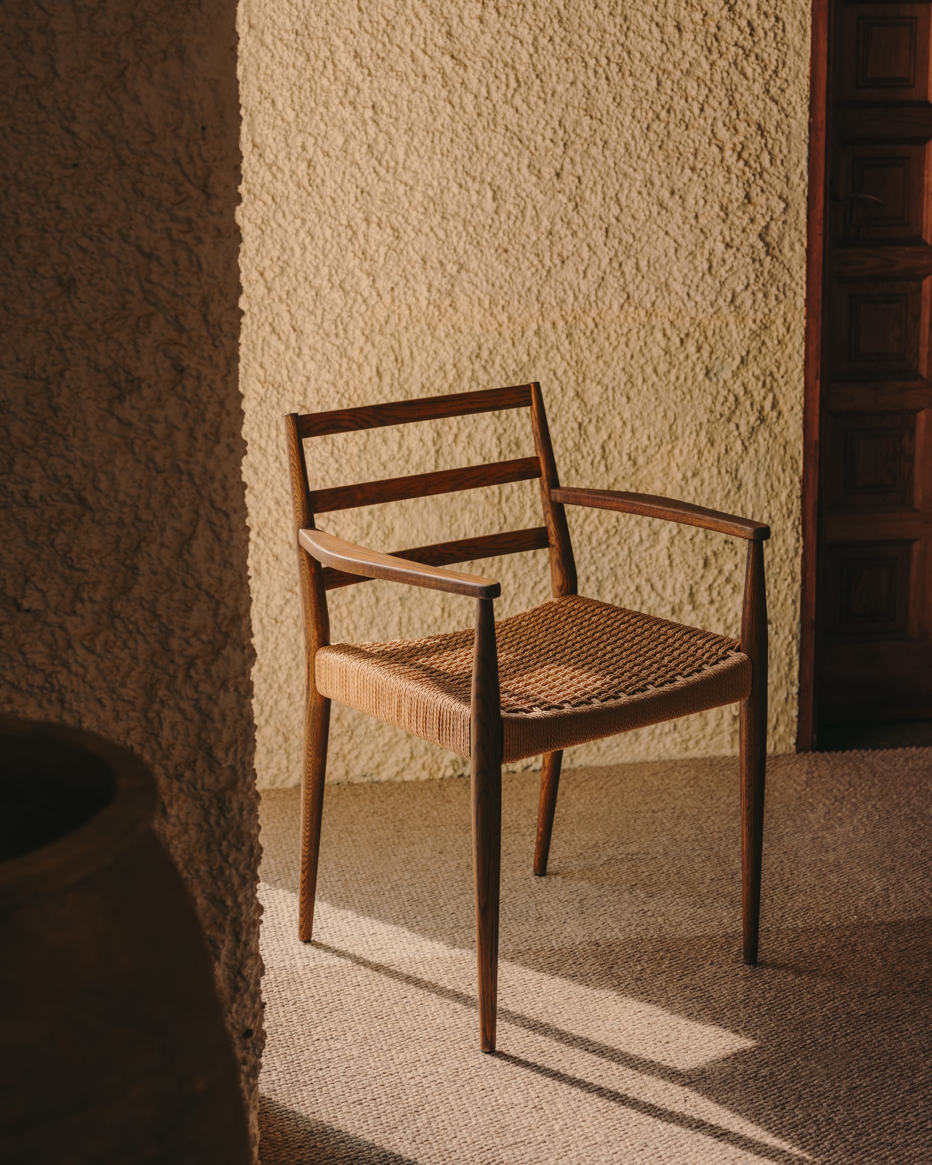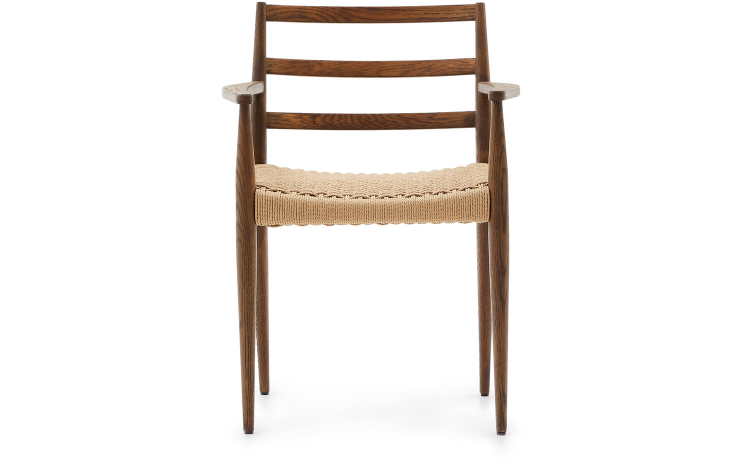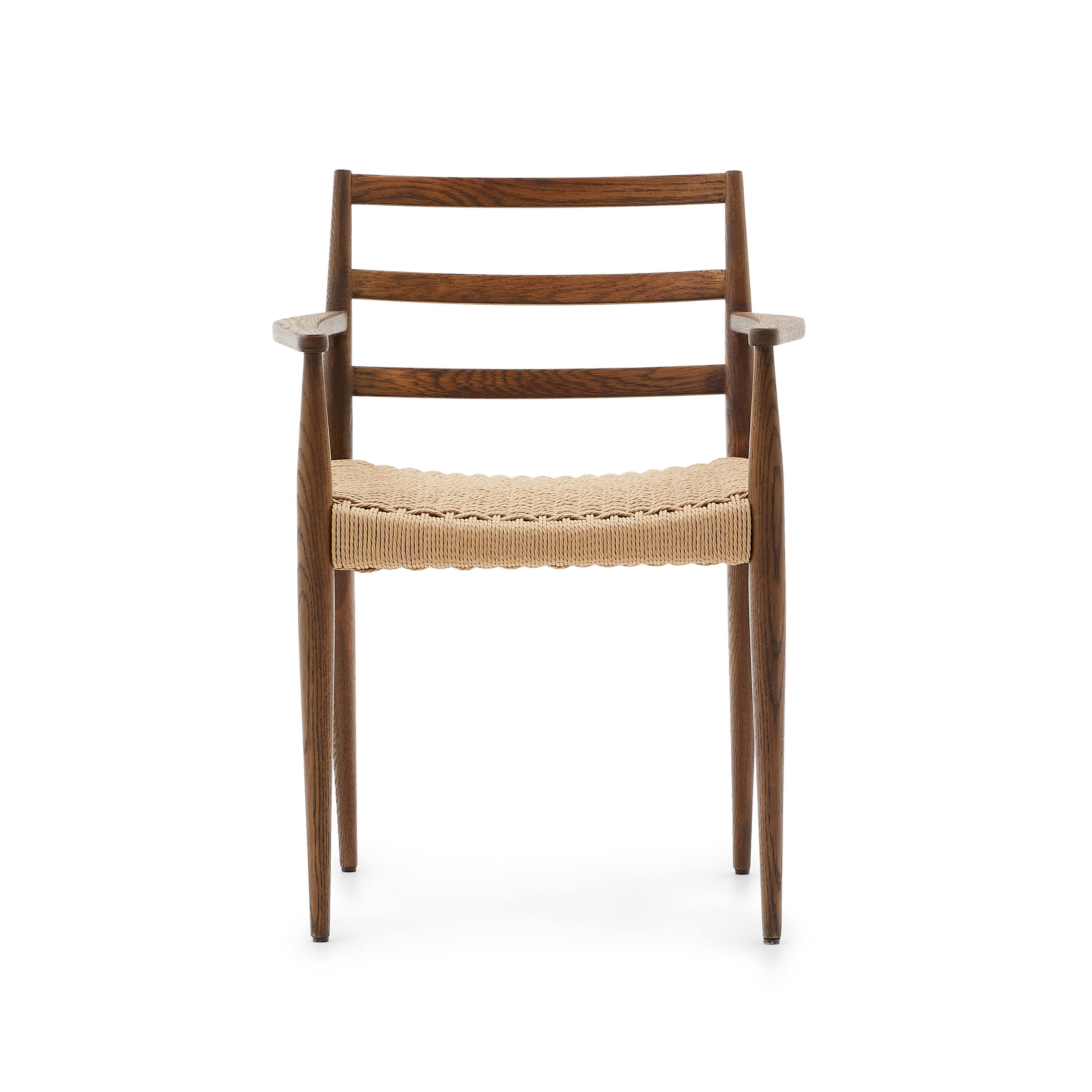 - Stoel met armleuningen gemaakt van massief eikenhout met een walnoten afwerking.