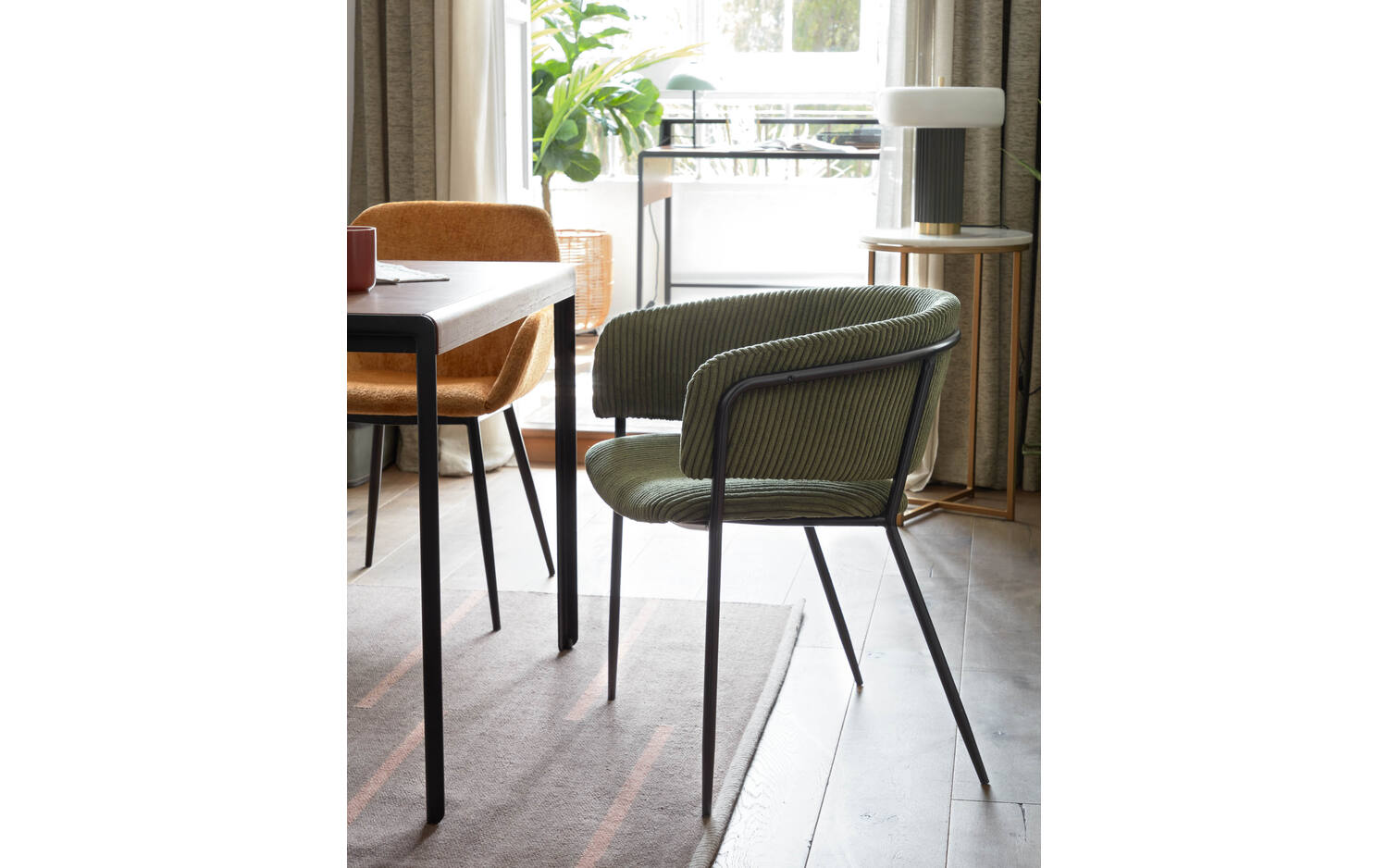 Stoel met corduroy bekleding met eigentijds design, zowel geschikt voor de eetkamer als voor je studeerkamer. De jaren 70 zijn terug en maken nu ook deel uit van het interieur van je huis.