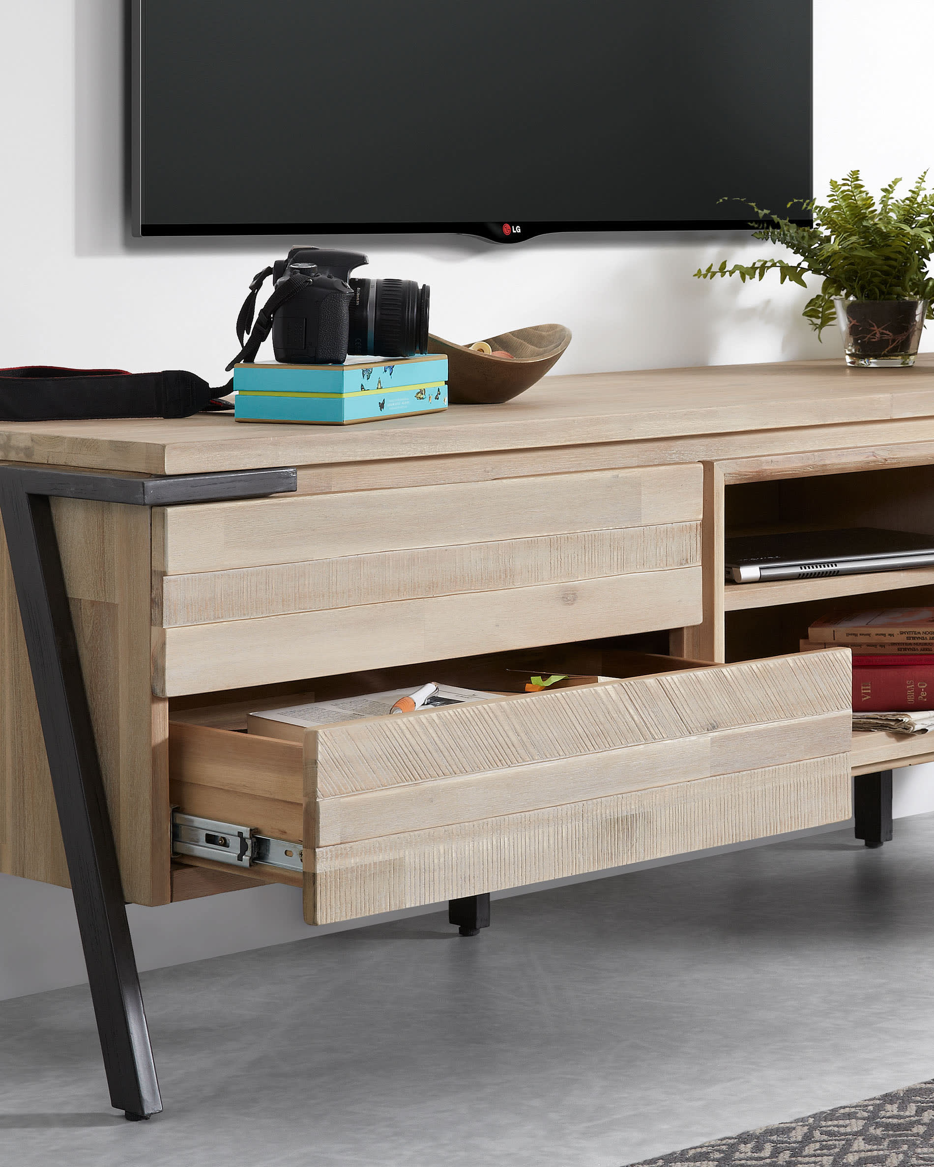 TV-meubel van massief acaciahout in natuurlijk gebleekte afwerking. Onderstel in verweerd geschilderd metaal.