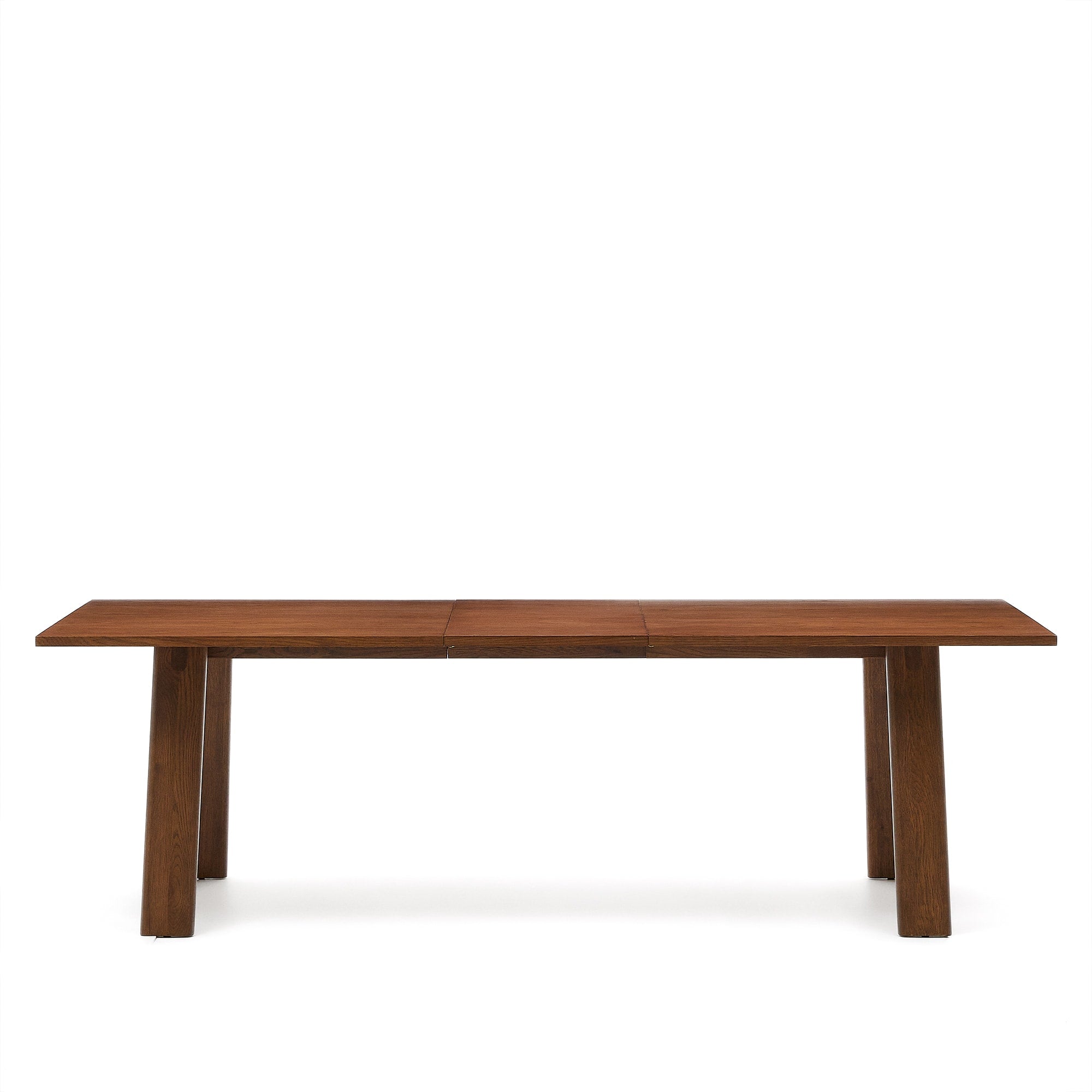 - Tafelblad van fineer op massief eikenhouten poten met een walnoten afwerking.