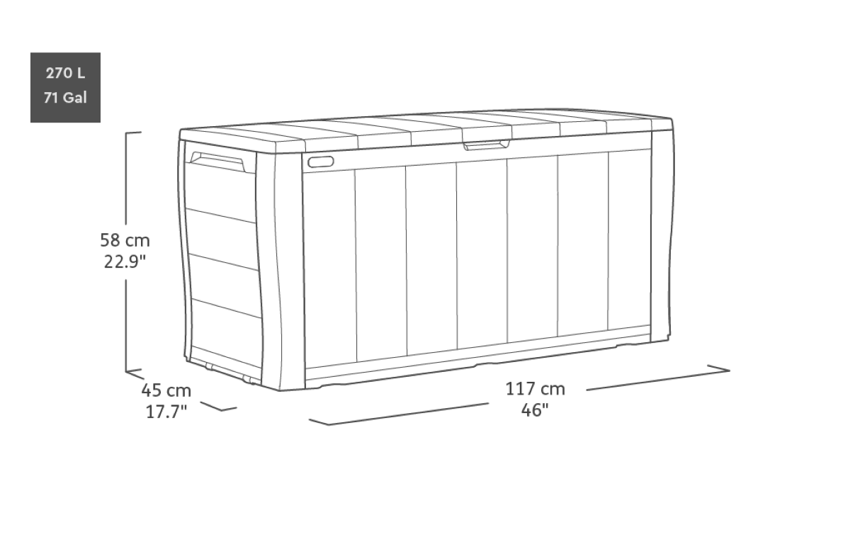 De Keter Sherwood opbergbox biedt genoeg opslagruimte (270L) voor je tuin, maar is ook compact genoeg voor op het terras. Door het aantrekkelijke houtlook ontwerp past hij in elke ruimte. De opbergbox is gemaakt van duurzaam, weersbestendig kunststof die al uw spullen droog en geventileerd houdt, van zwembadaccessoires tot lounge stoelkussens. Hij wordt geleverd met ingebouwde handgrepen en rollen voor eenvoudige verplaatsing. De kussenbox is ook gemakkelijk te monteren.
