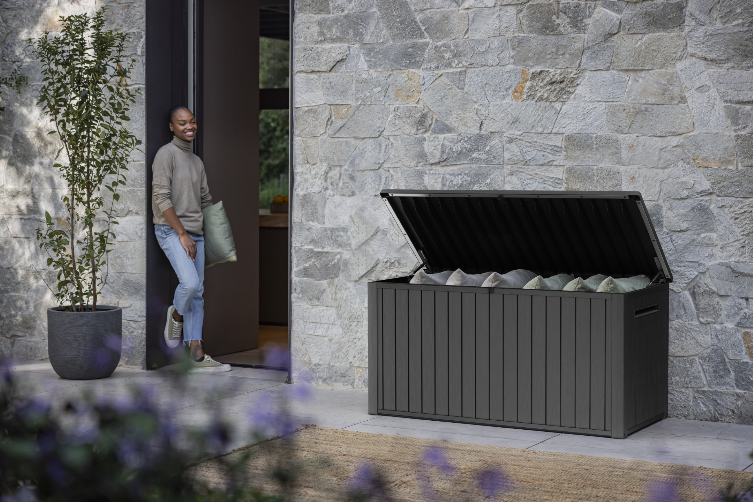 De Keter Southwood Opbergbox 643L biedt een praktische en stijlvolle oplossing om al je tuinspullen droog en veilig op te bergen. Dankzij een elegante houtlook voegt deze kussenbox een vleugje design toe aan je tuin. Of je nu kussens, gereedschap of speelgoed wilt opbergen, de Southwood box houdt alles netjes beschermd tegen regen en wind. Gemaakt van sterk, weerbestendig kunststof, is deze opbergbox niet alleen duurzaam, maar ook onderhoudsvrij. De handige gasveren in het deksel zorgen voor moeiteloos openen en sluiten, terwijl de box afsluitbaar is met een hangslot (niet meegeleverd) voor extra veiligheid. Keter Southwood Opbergbox - 643L - Grijs