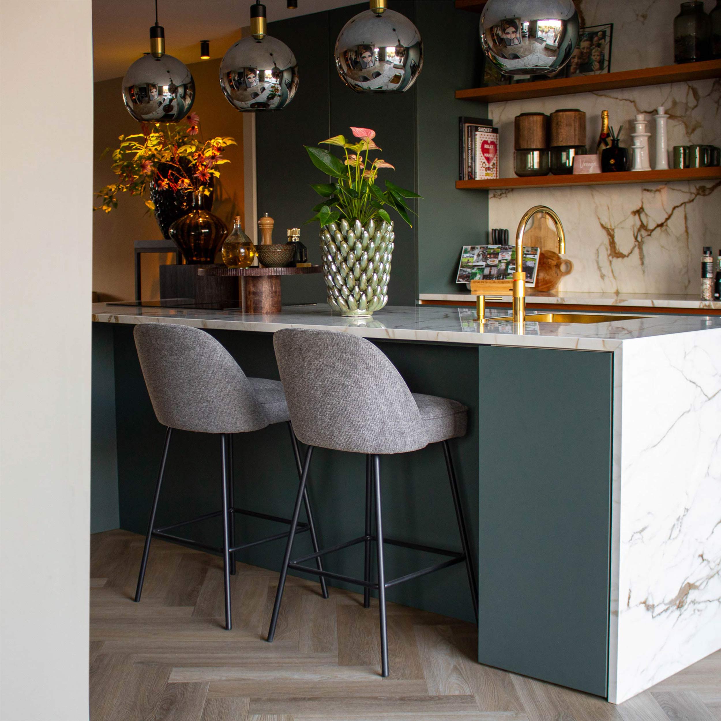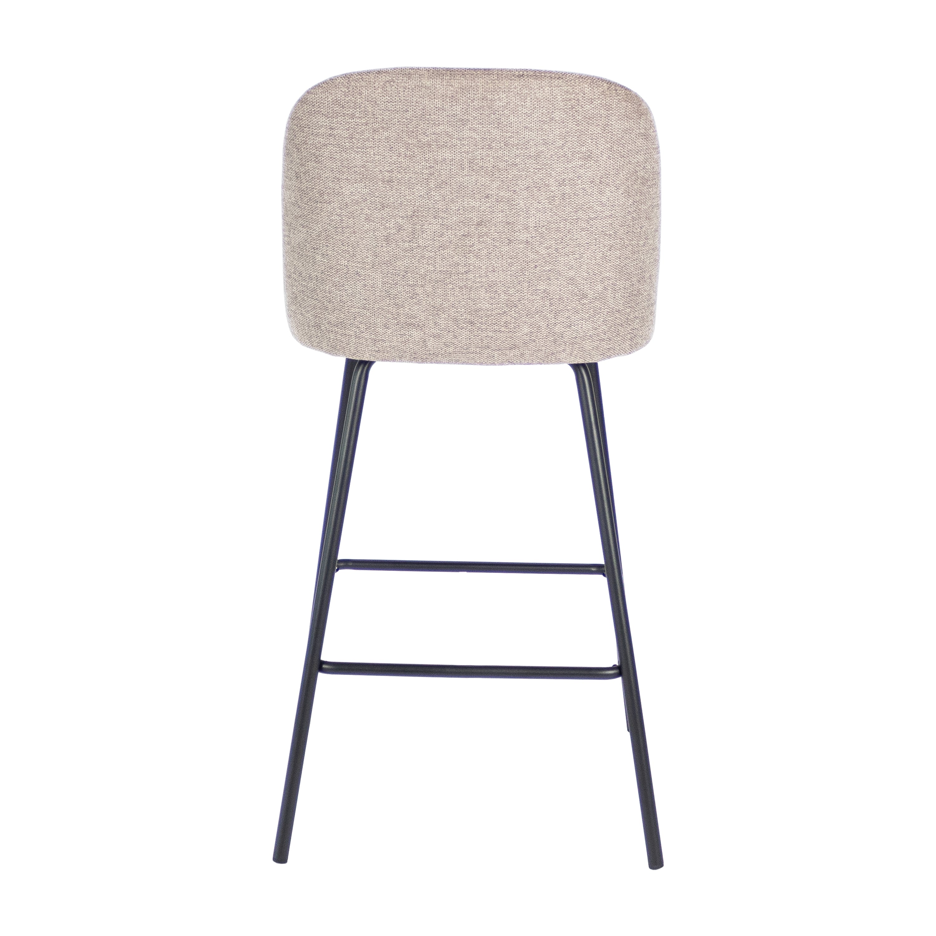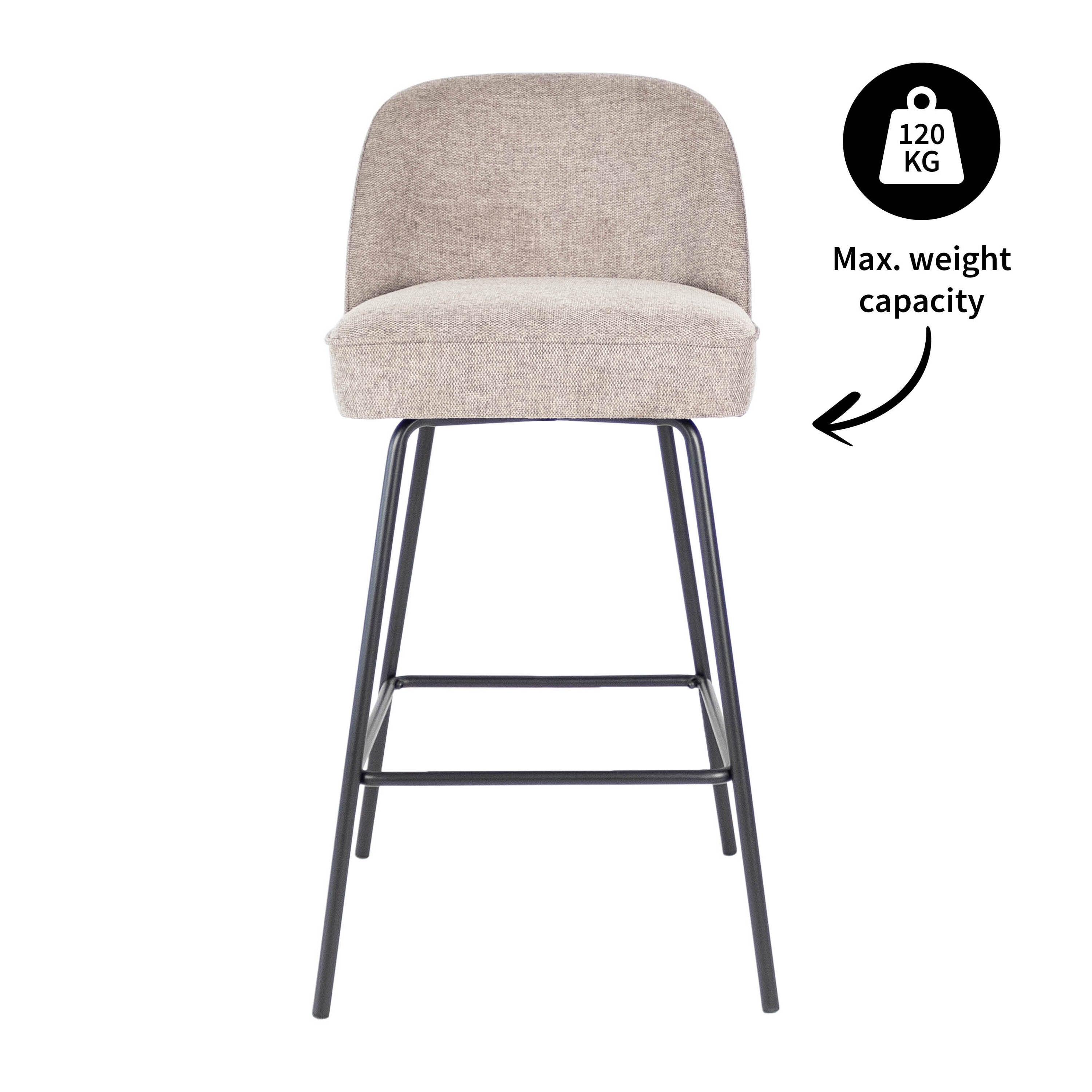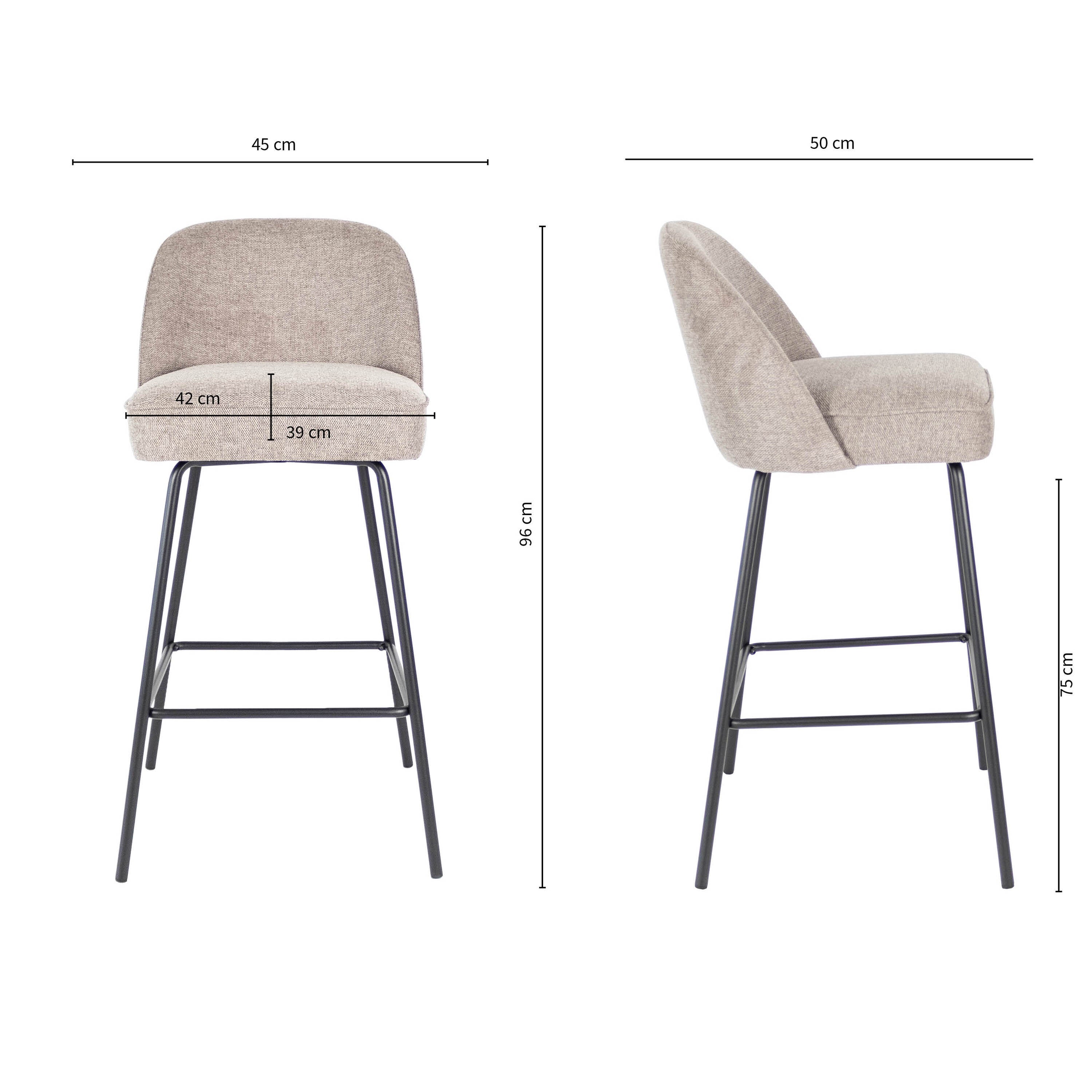 Barkruk Lucy is elegant, stijlvol en tijdloos. Ze heeft een ronde gevoerde zitting, een bekleding van textuurstof en een zwarte metalen onderstel.