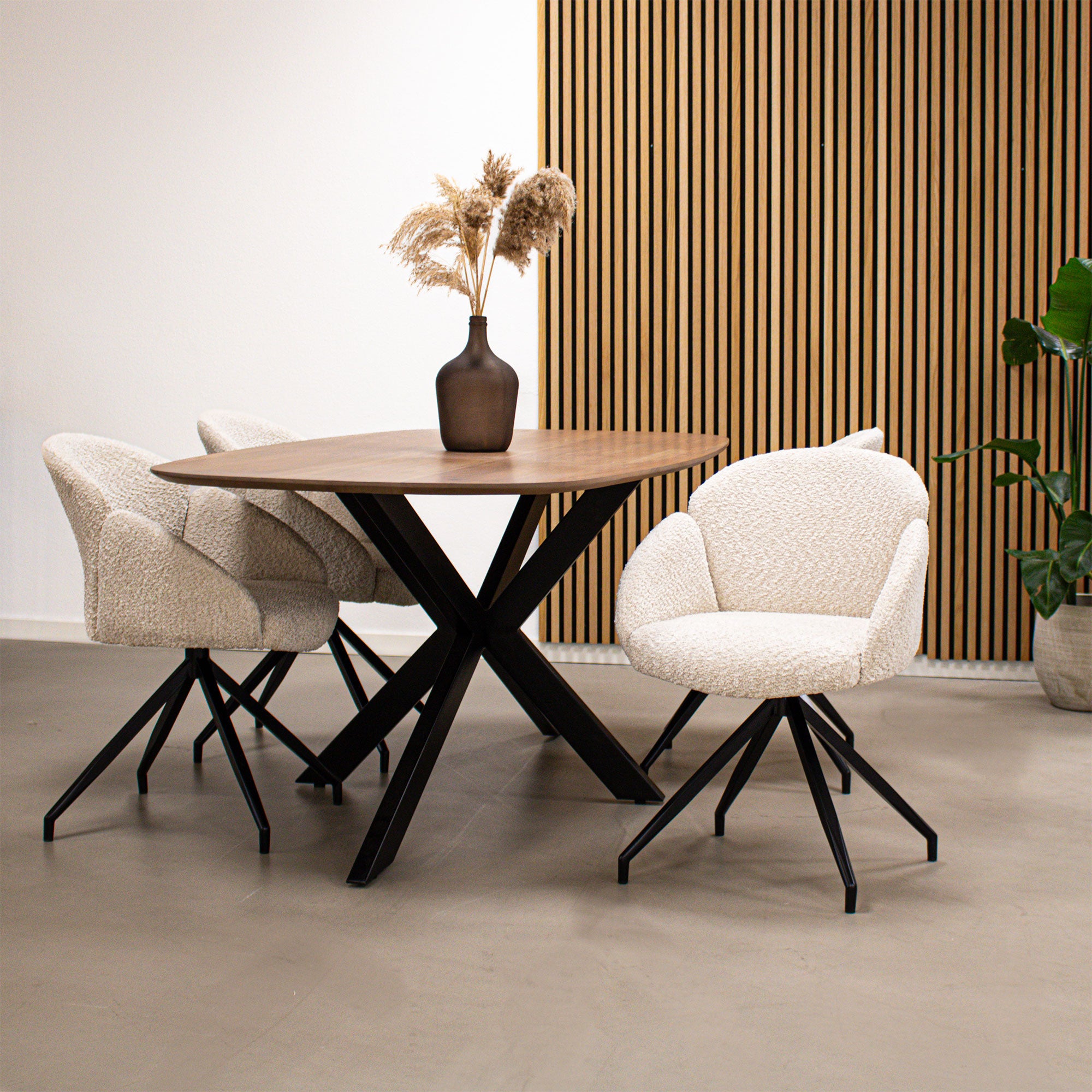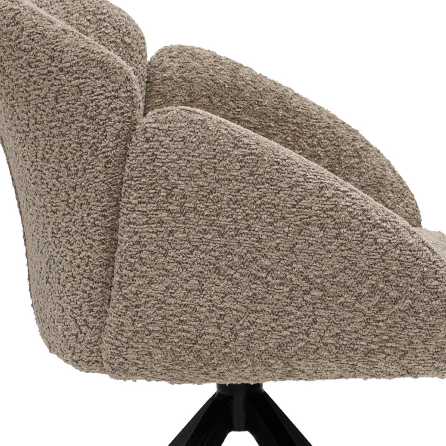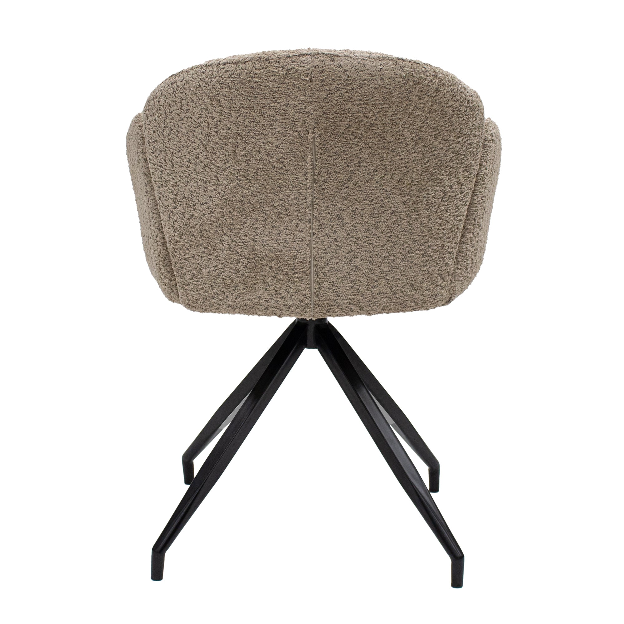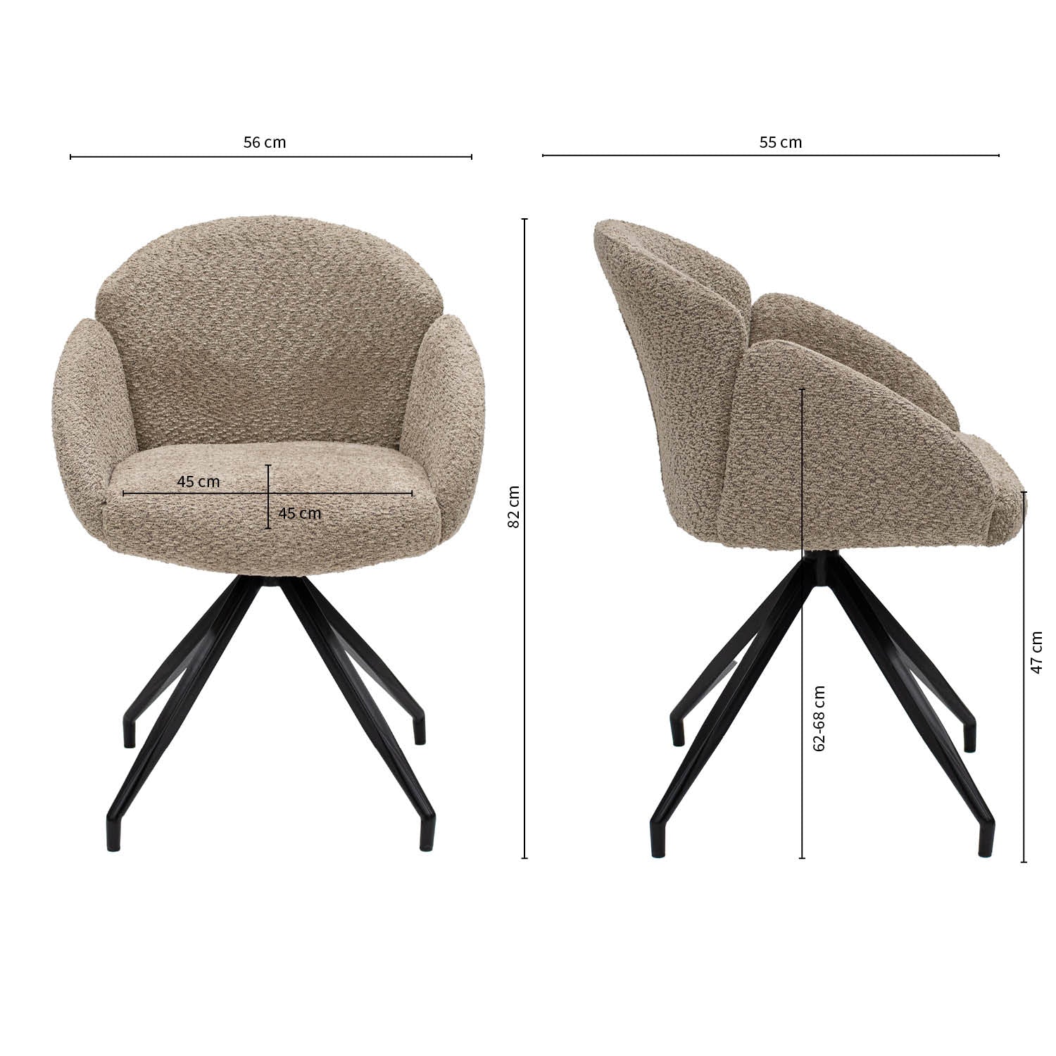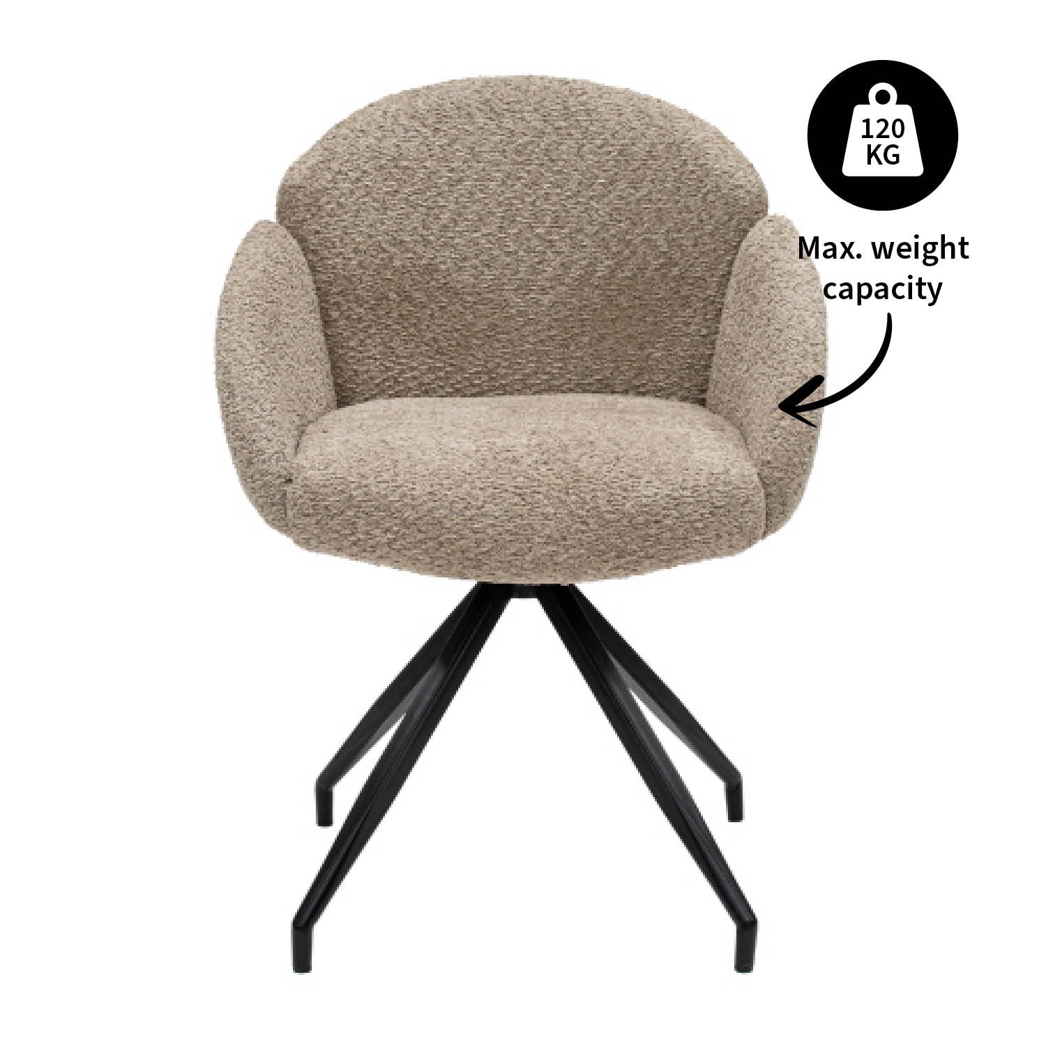 Meet Aiko! Draaistoel Aiko is bekleed met een mooie soft bouclé stof en heeft een zwart metalen onderstel dat 180 graden draaibaar is. Ook superhandig, de stoel draait automatisch terug in de oorspronkelijke positie.