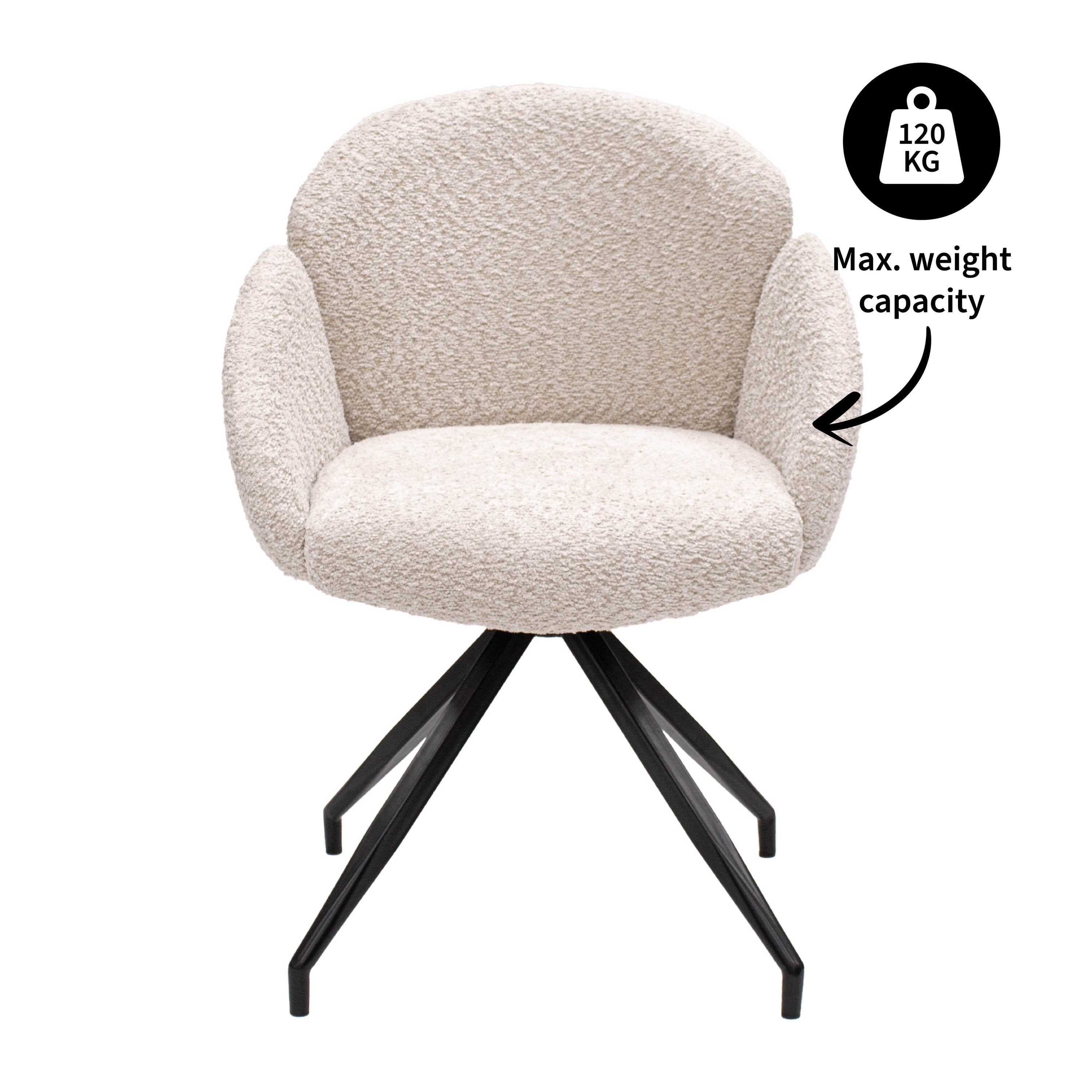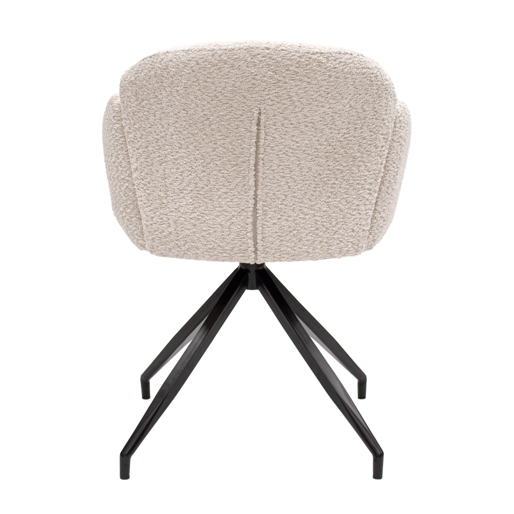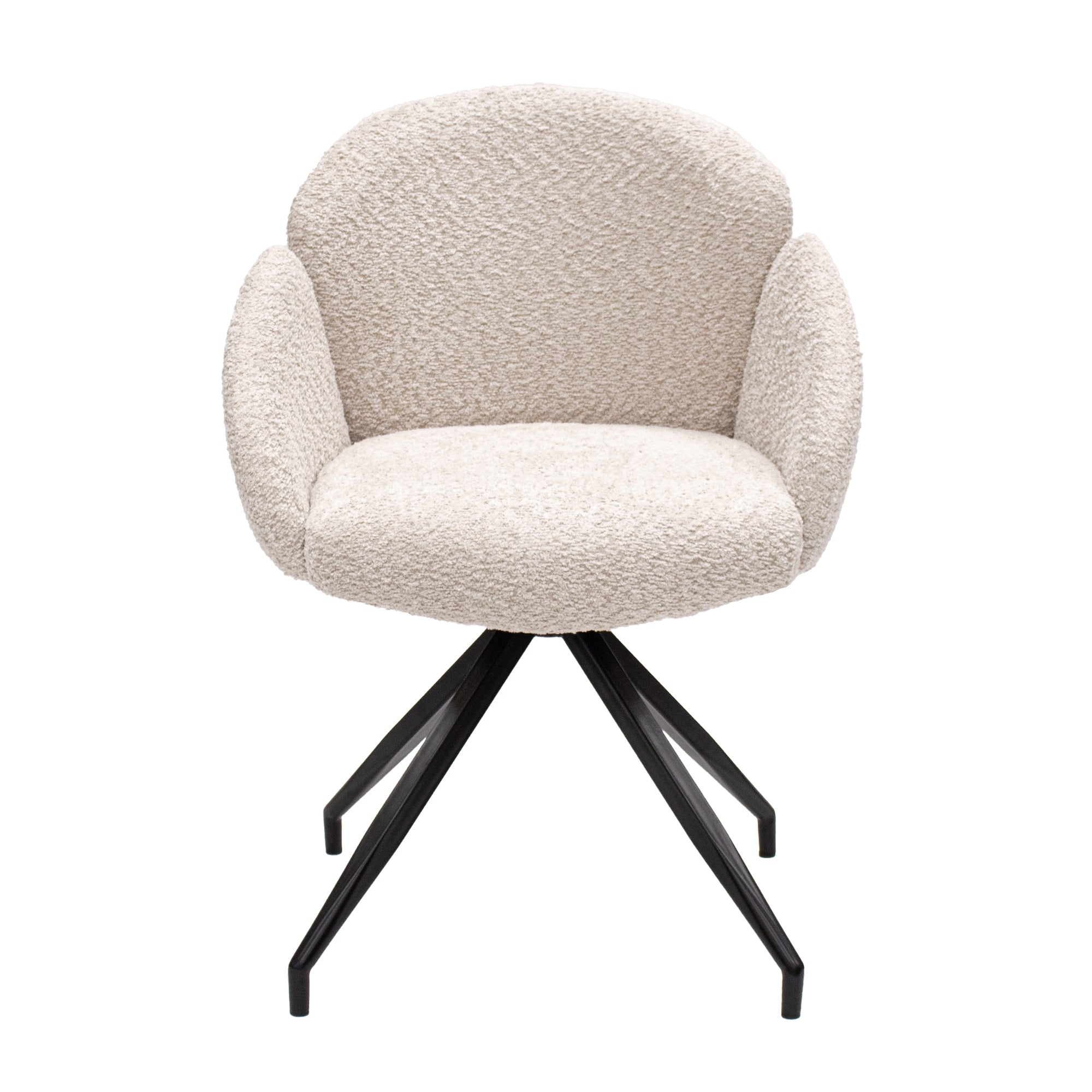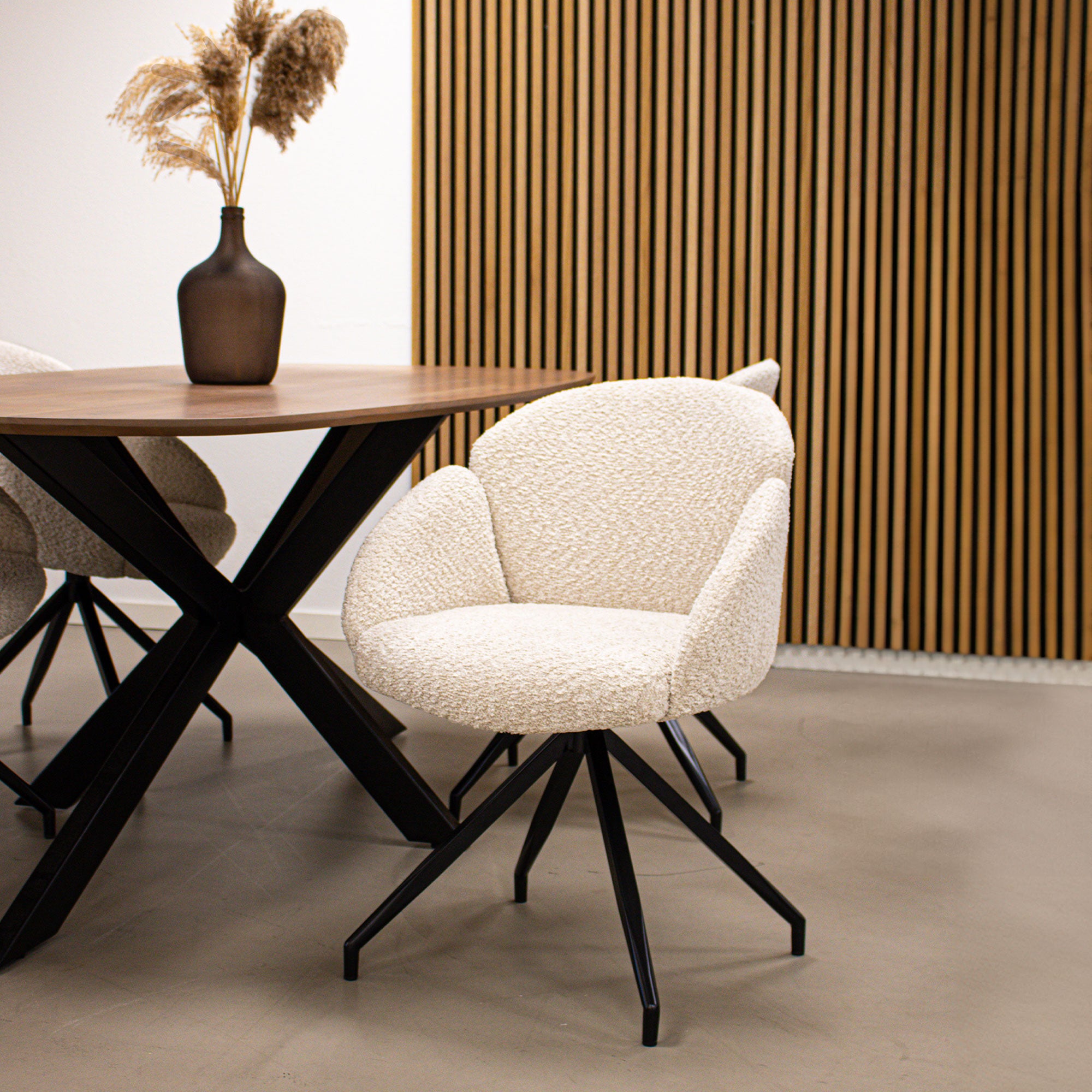 Meet Aiko! Draaistoel Aiko is bekleed met een mooie soft bouclé stof en heeft een zwart metalen onderstel dat 180 graden draaibaar is. Ook superhandig, de stoel draait automatisch terug in de oorspronkelijke positie.