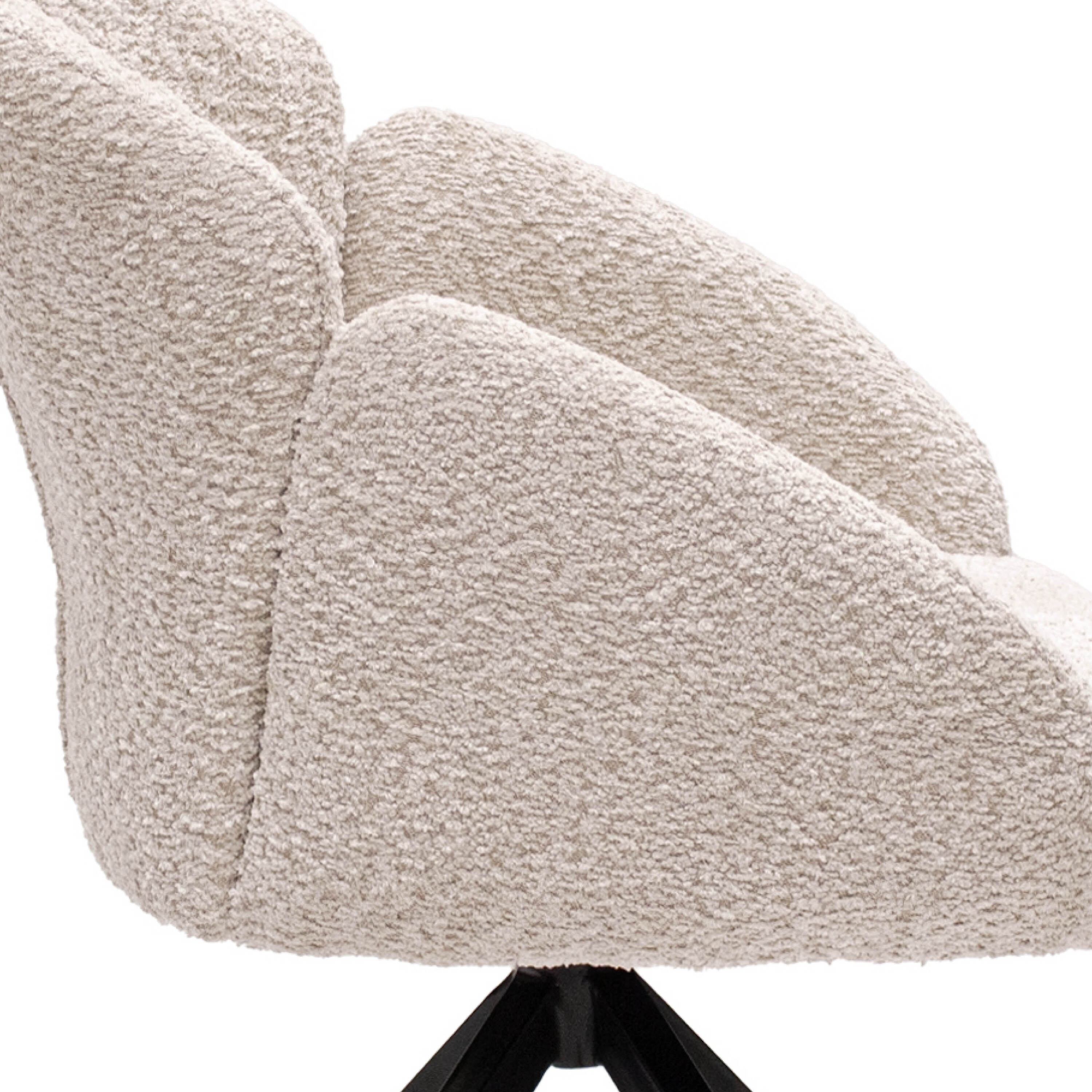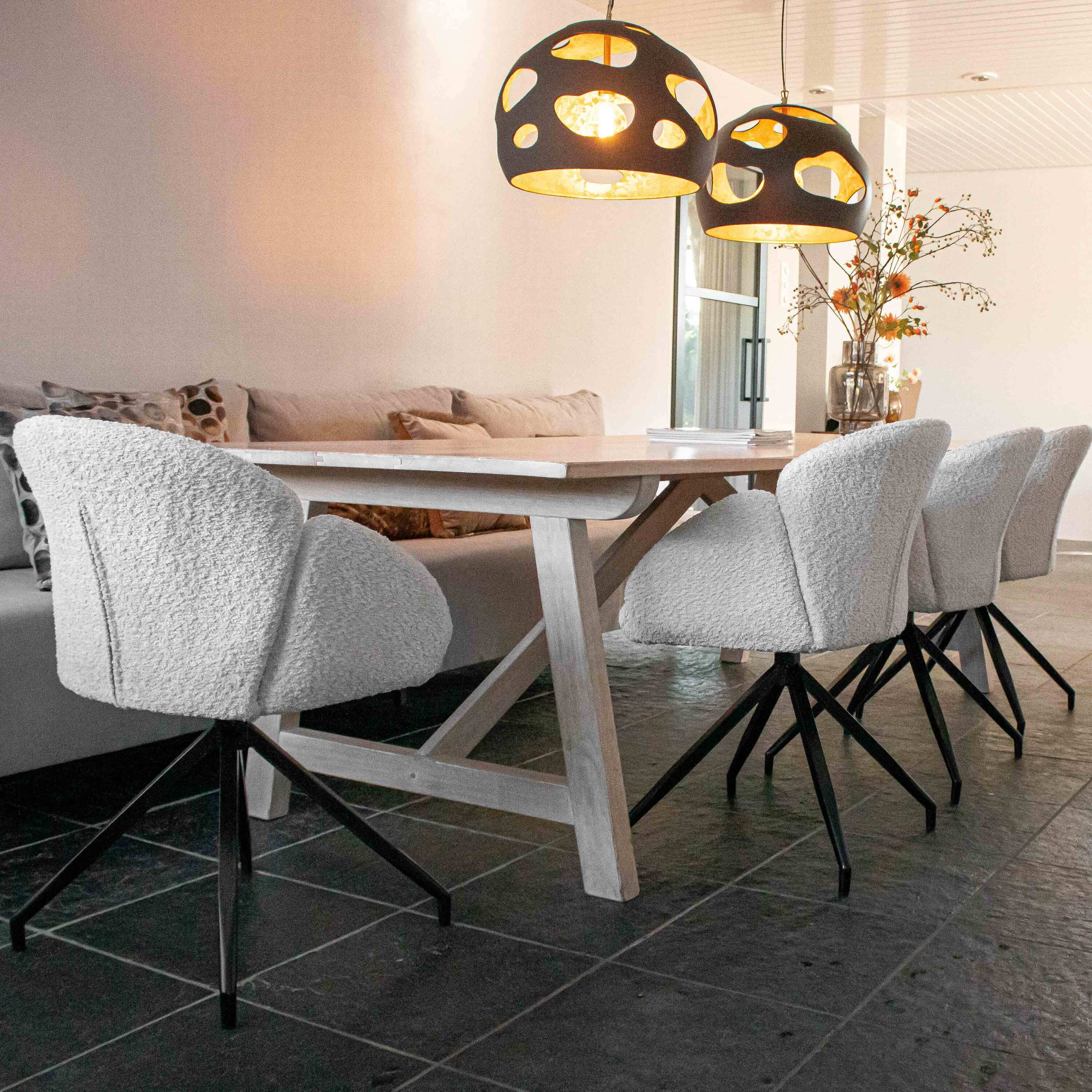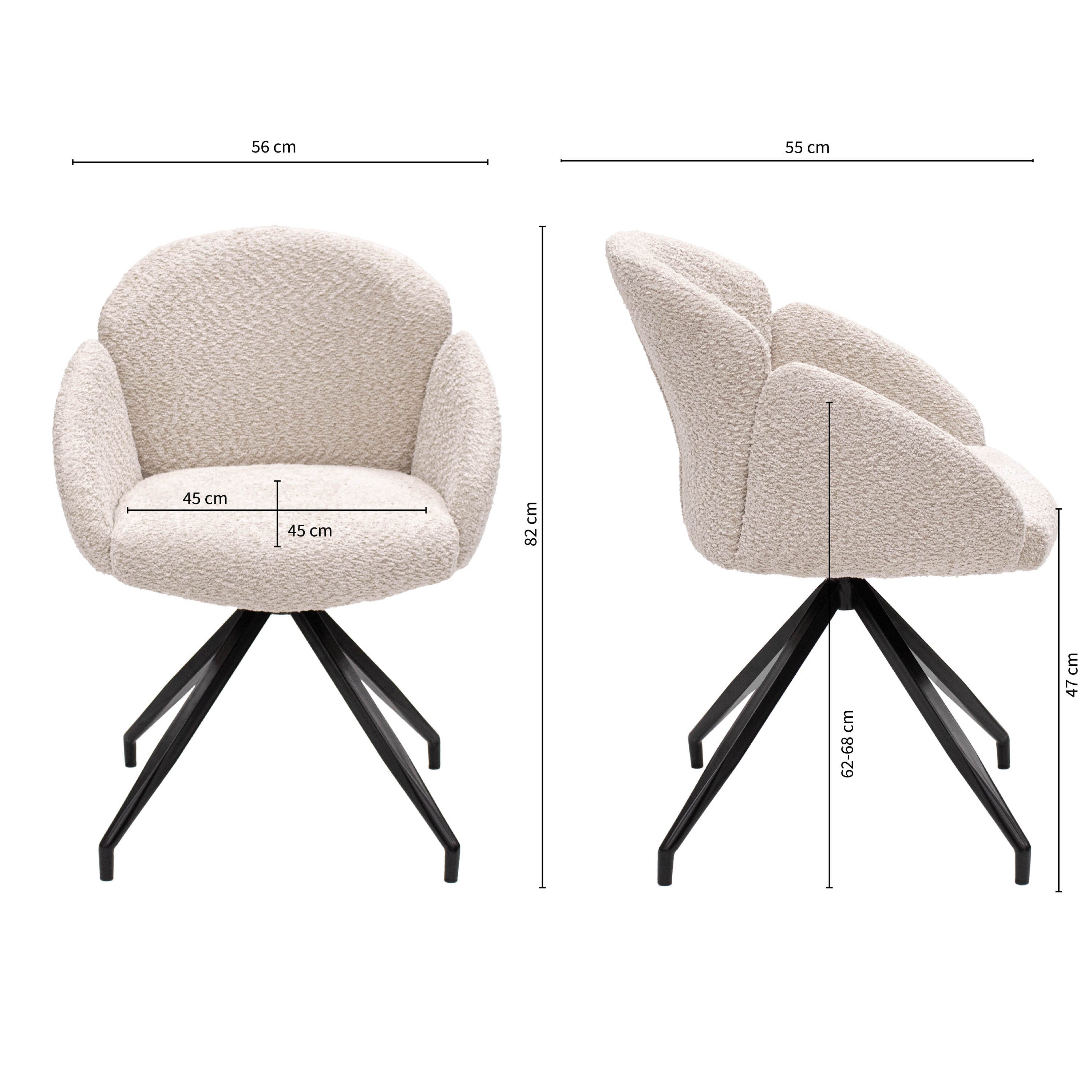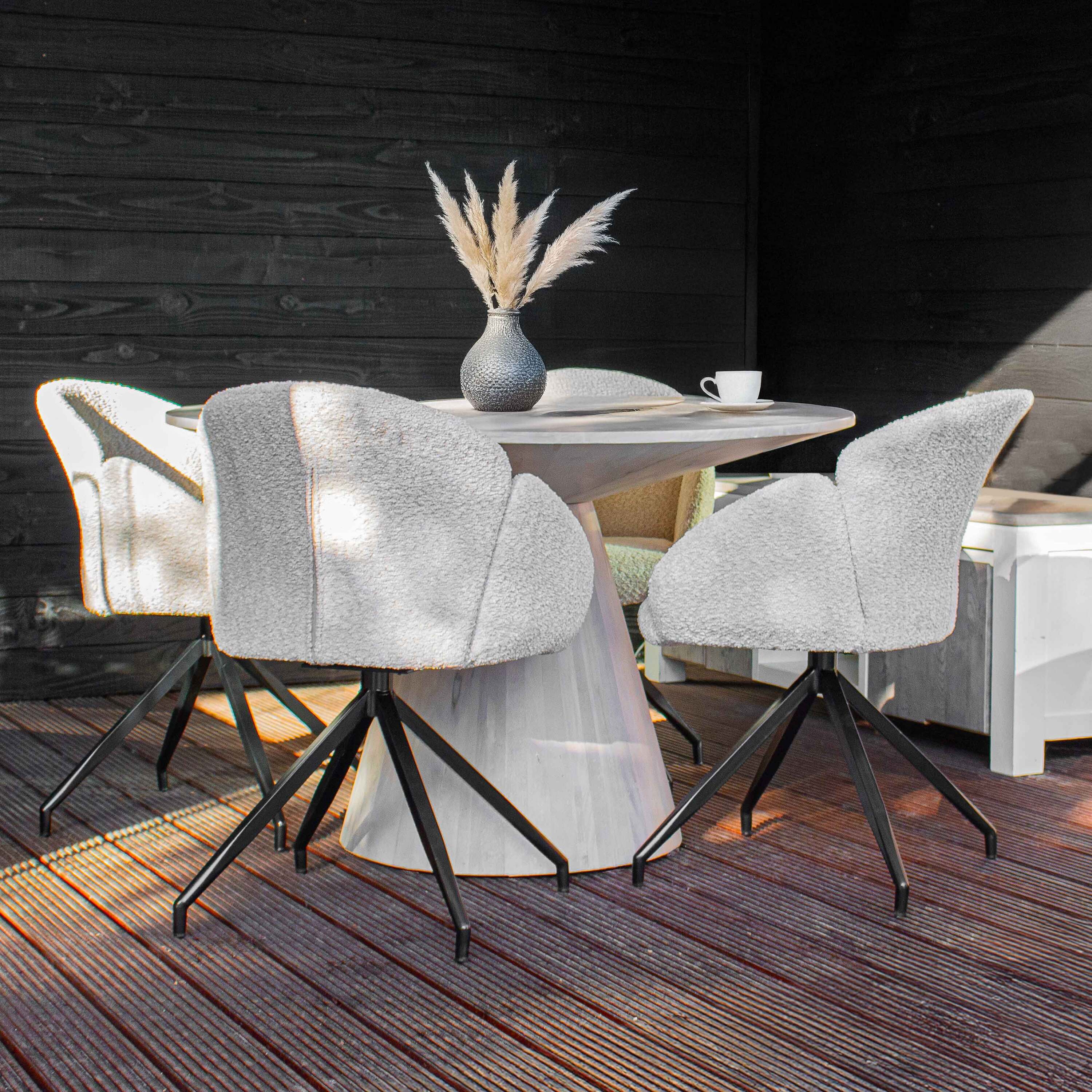 Meet Aiko! Draaistoel Aiko is bekleed met een mooie soft bouclé stof en heeft een zwart metalen onderstel dat 180 graden draaibaar is. Ook superhandig, de stoel draait automatisch terug in de oorspronkelijke positie.