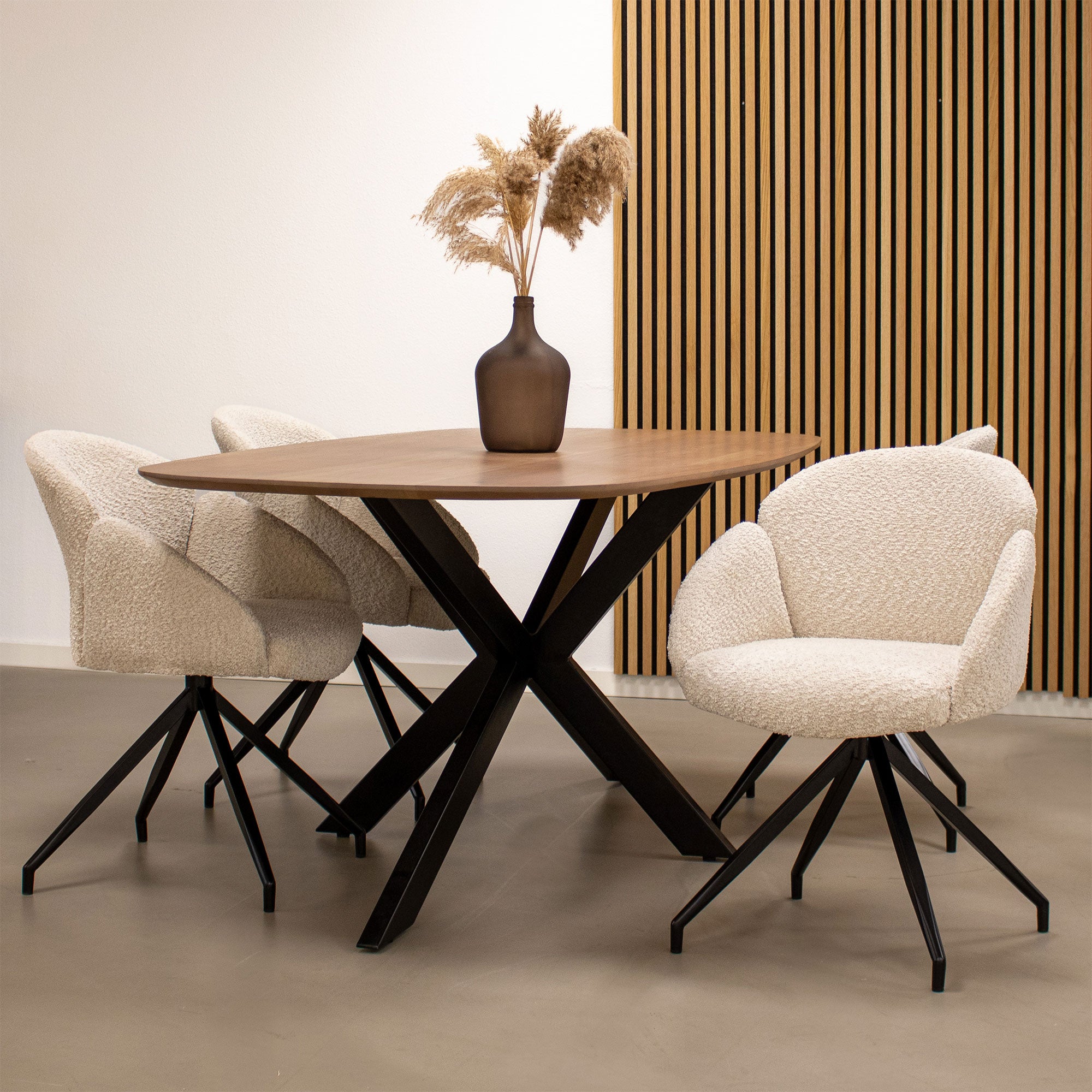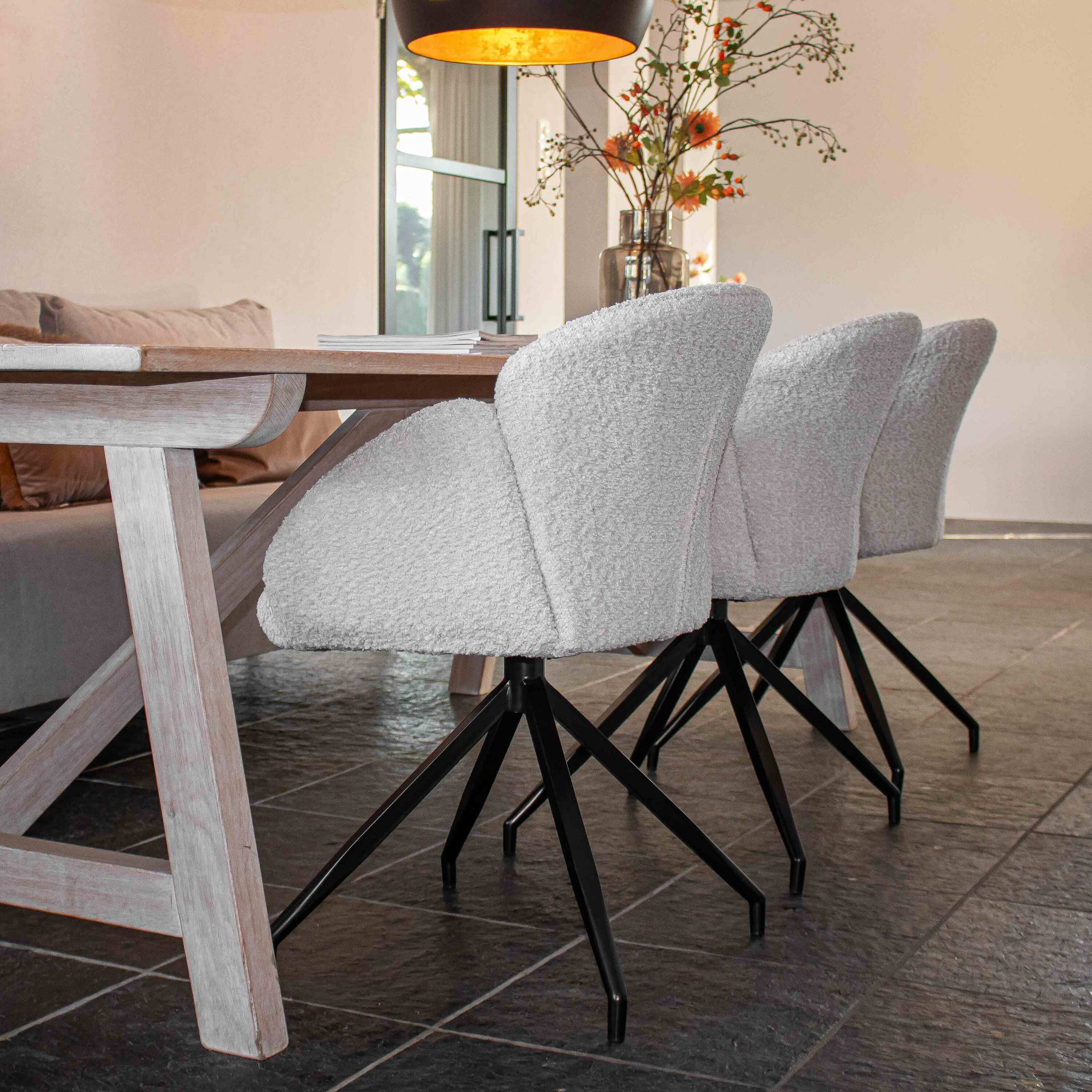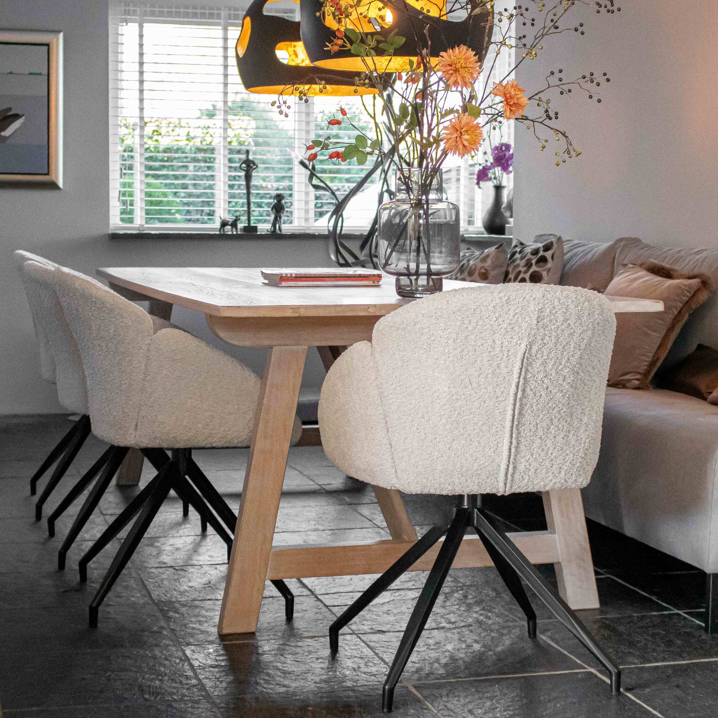 Op zoek naar een draaistoel die comfort, design en functionaliteit perfect combineert? Dan is KICK draaistoel AIKO precies wat je zoekt. Deze elegante stoel is bekleed met een zachte soft bouclé stof die zorgt voor een warme en luxe uitstraling. Het zwarte metalen onderstel is 180° draaibaar en draait automatisch terug naar de oorspronkelijke positie, superhandig én stijlvol! Wat AIKO echt uniek maakt, is de bijzondere vorm van de zitting, geïnspireerd op een openslaande bloem. Dit speelse design maakt van AIKO een echte eyecatcher, terwijl de ronde vormen zorgen voor optimaal zitcomfort. Verkrijgbaar in drie trendy kleuren, zodat je de perfecte match vindt voor jouw interieur.