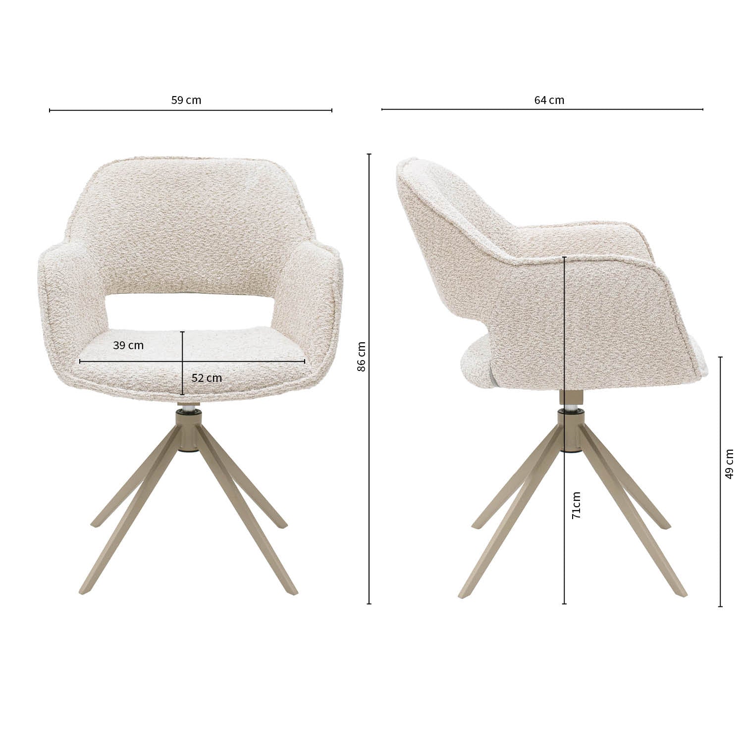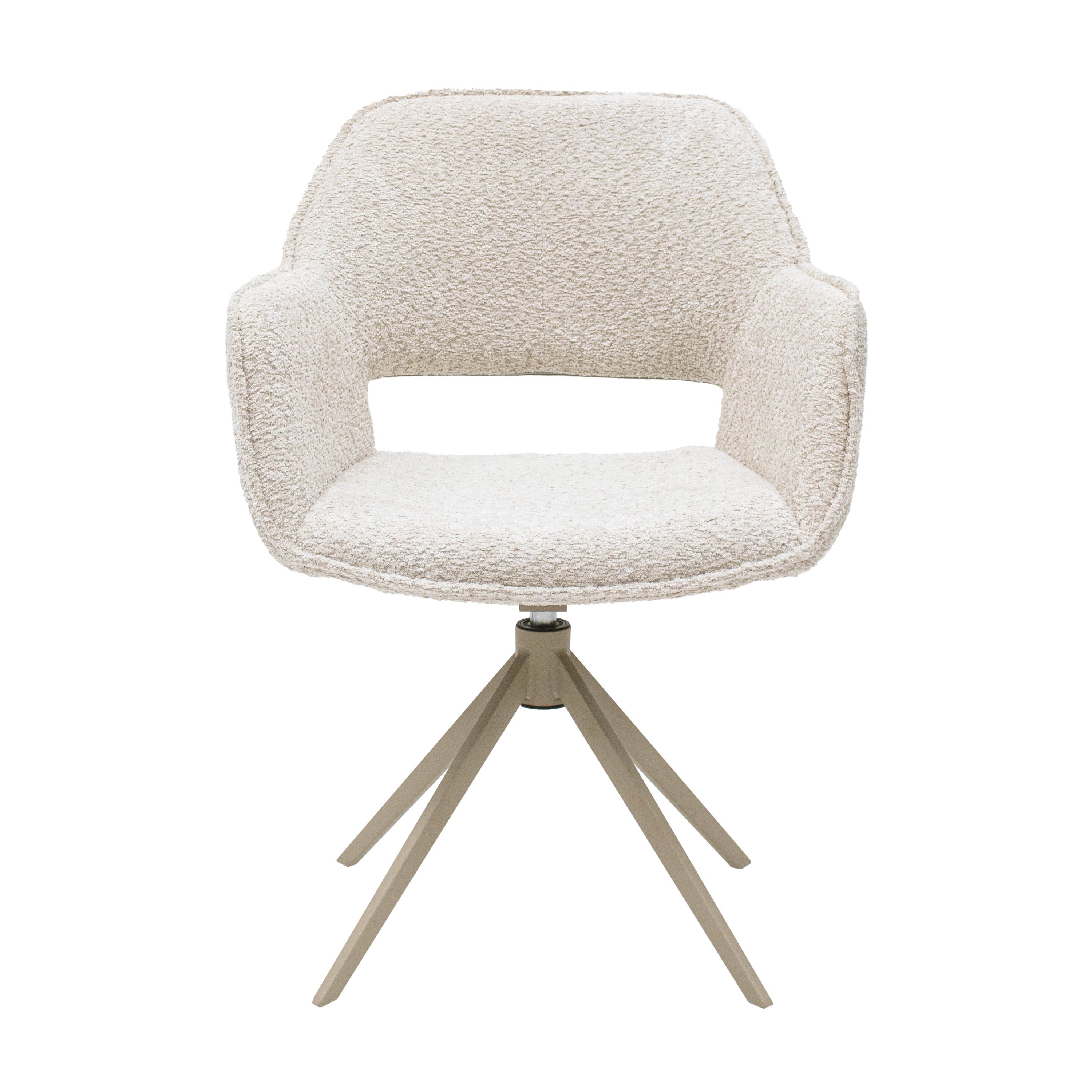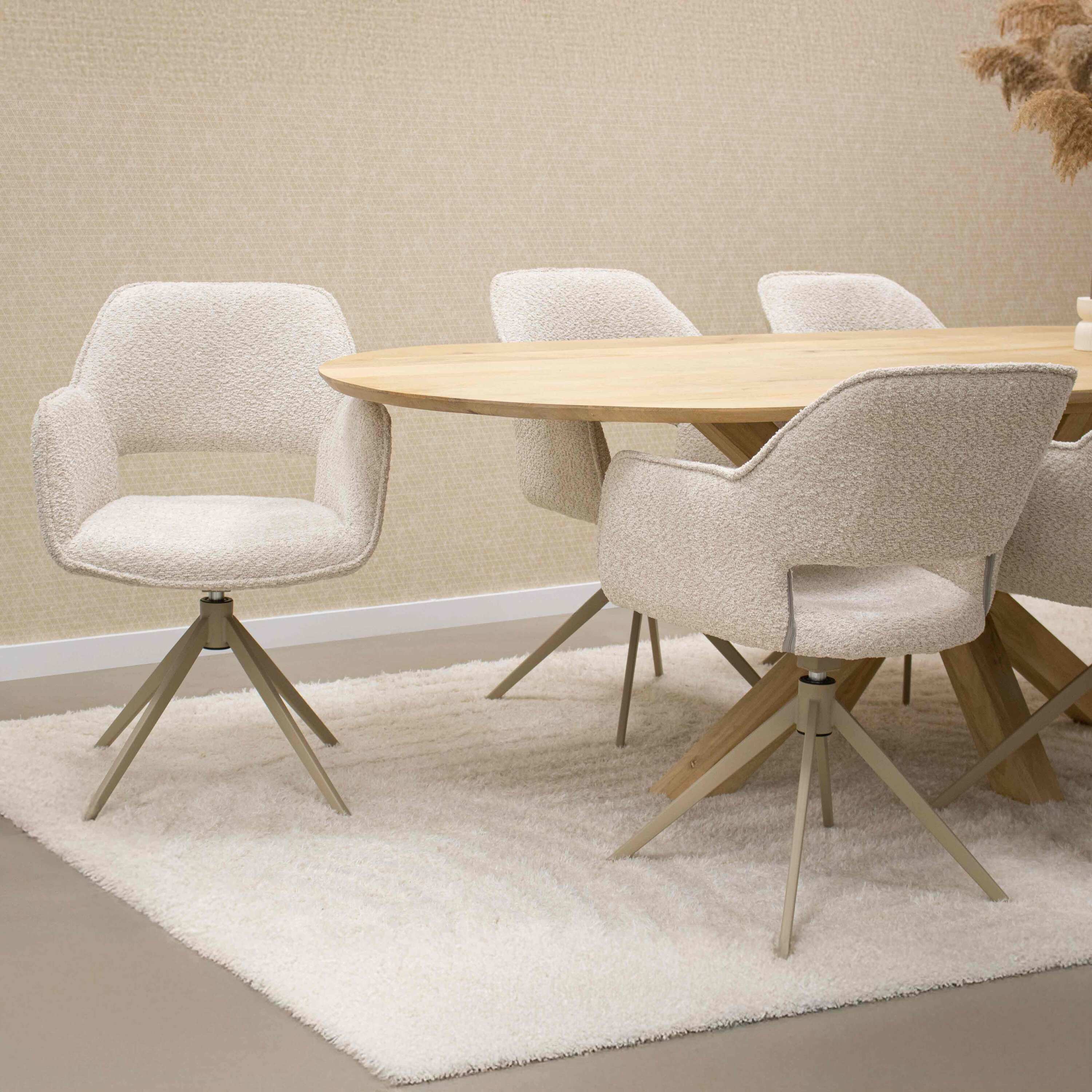 MEET OWEN! Draaistoel Owen is bekleed met een mooie zachte bouclé stof, kenmerkt zich met een fijne armleuning en heeft een opening in de rugleuning.