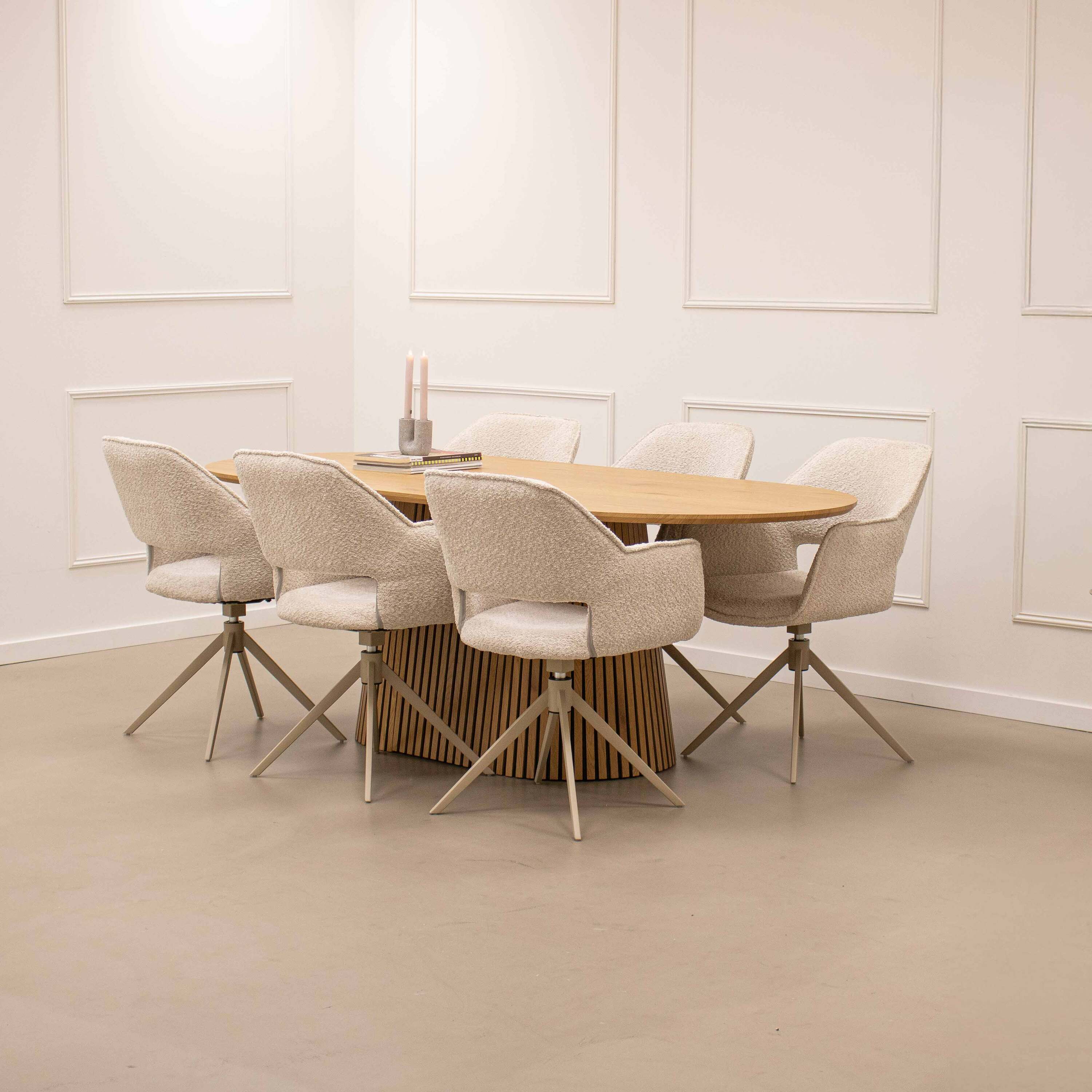 Maak kennis met eettafel Mika! Met zijn eikenhouten-look en ovale vorm brengt Mika de Scandinavische sfeer naar jouw eetkamer.
