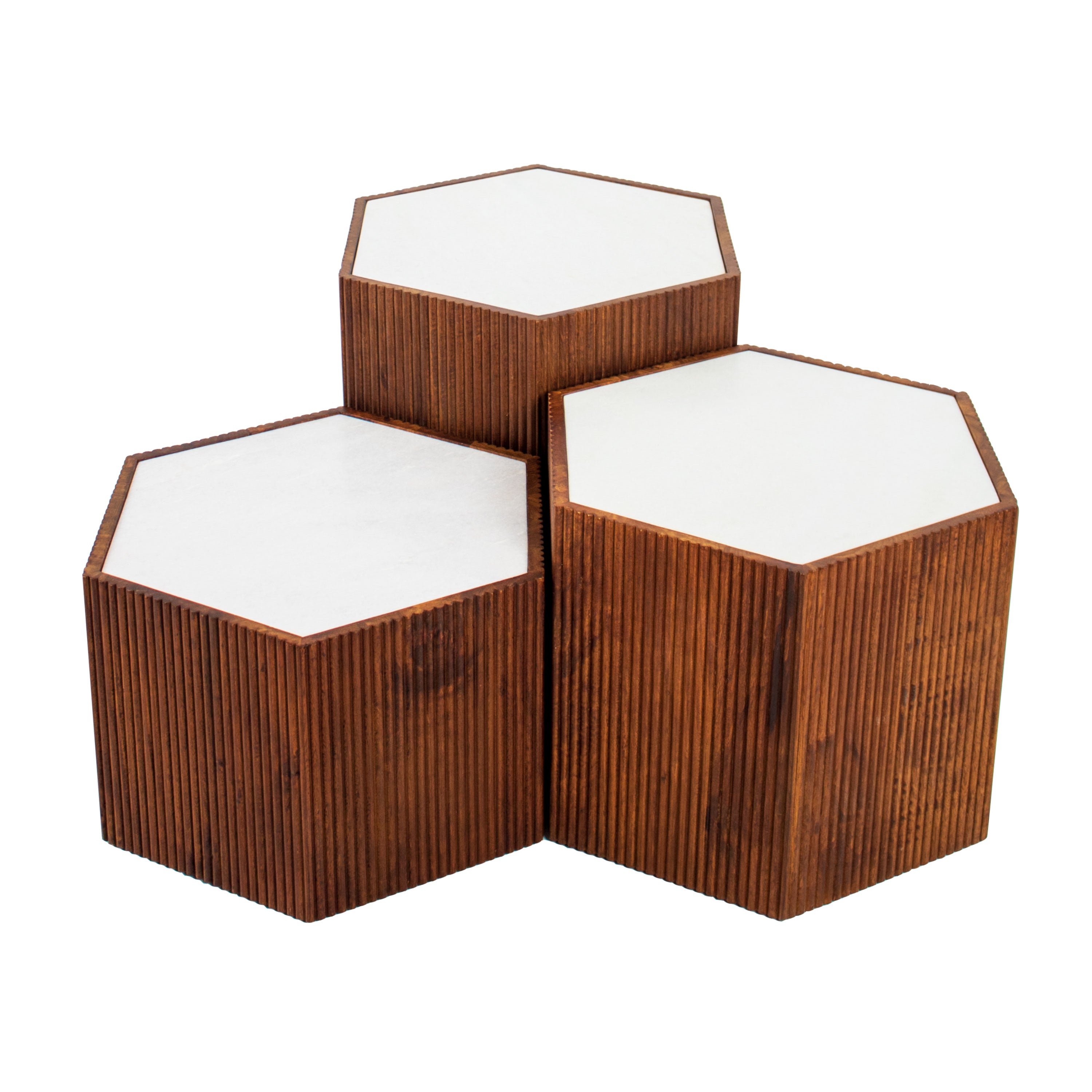 THIS IS JUNE! Deze salontafel set bestaat uit 3 zeshoekige tafels in verschillende hoogtes.