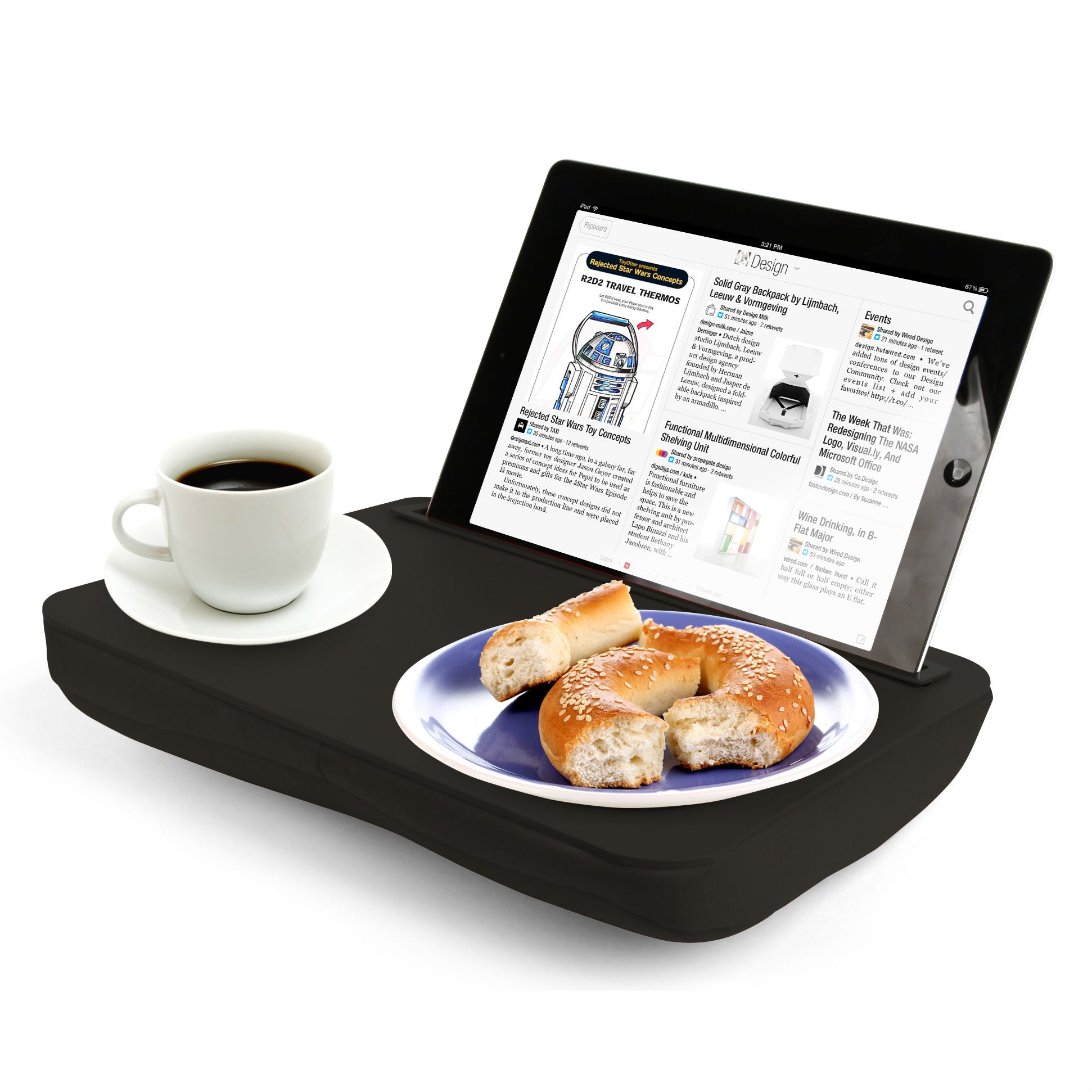 Kikkerland iBed tablethouder Wie vaak met een tablet op de bank zit, merkt dat het niet altijd even comfortabel is. Daarom is deze Kikkerland iBed Tablethouder zo handig. Deze houder heeft een breed oppervlak met anti-slip. Aan de onderkant zit een kussentje, zodat je hem prettig op je schoot kunt laten rusten. Gebruik je tablet terwijl je eet, op de bank zit, in bed ligt of bijvoorbeeld in het vliegtuig zit!